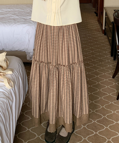 フリルネックチェックブラウス+ギャザースカート 2点セット