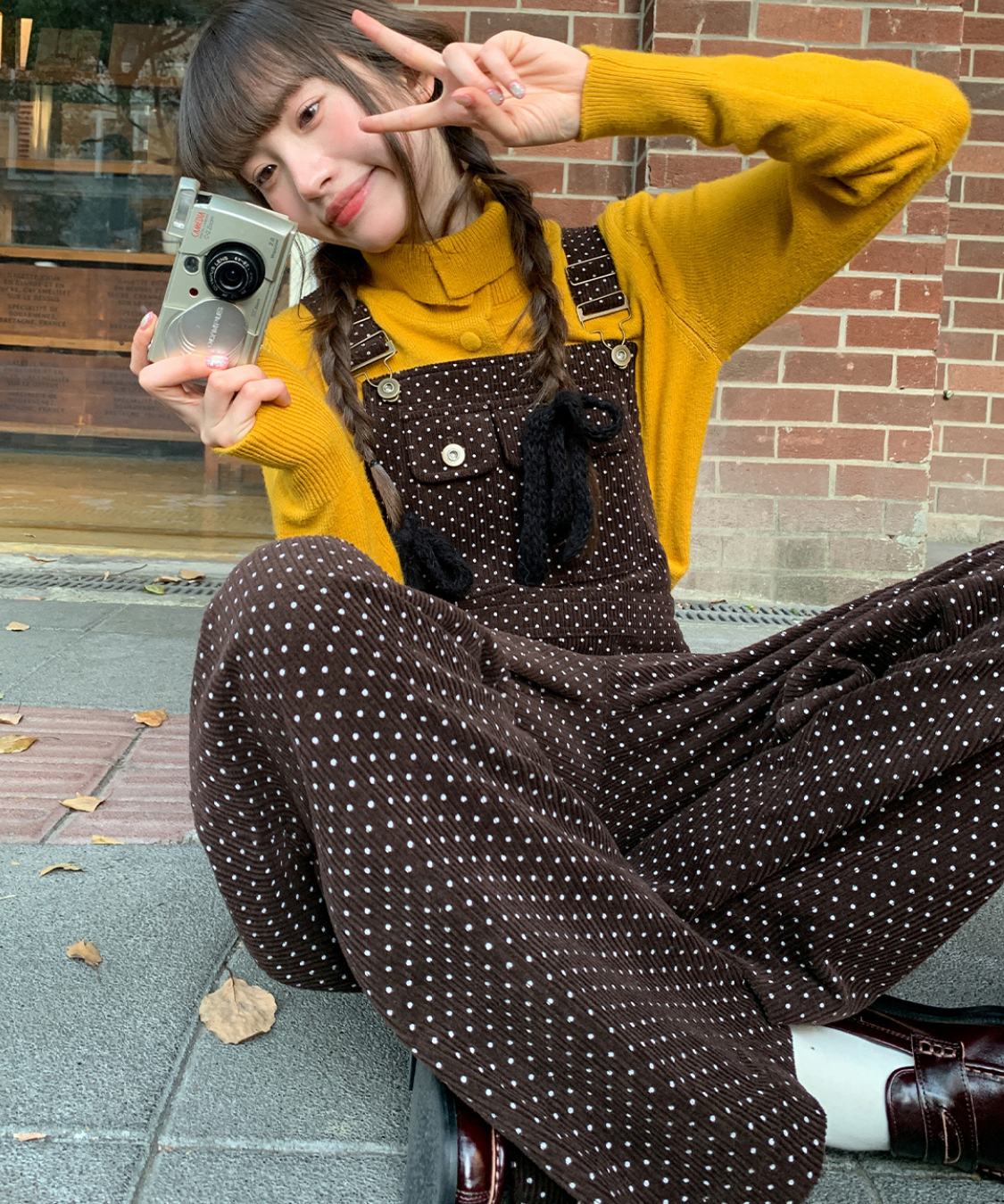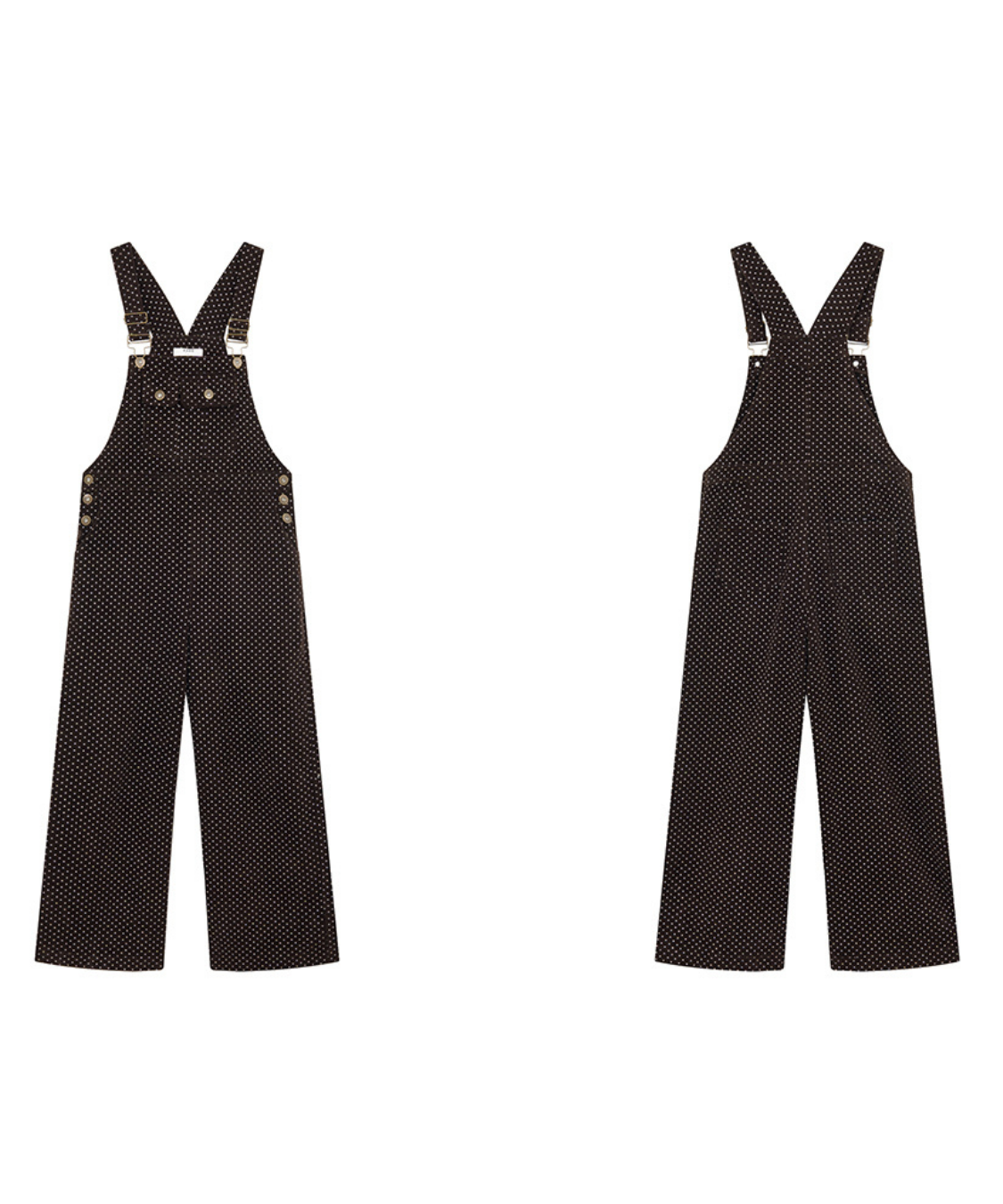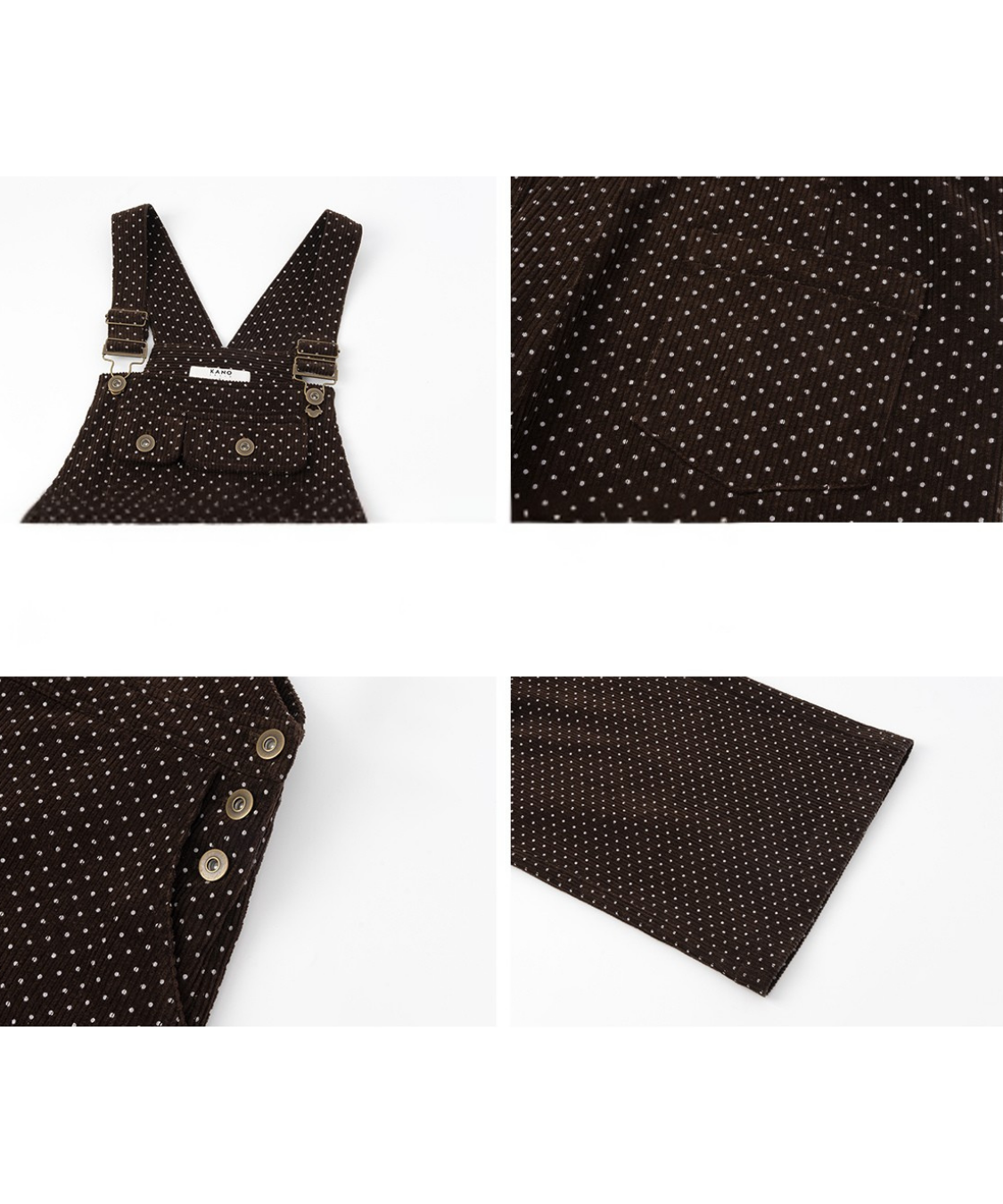 やわらかなコーデュロイ生地にドット柄をあしらったワイドシルエットのサロペットパンツです。
