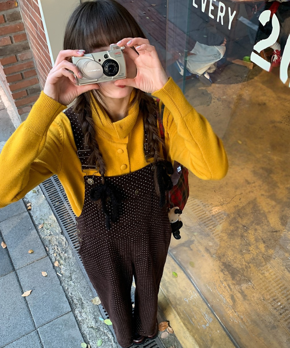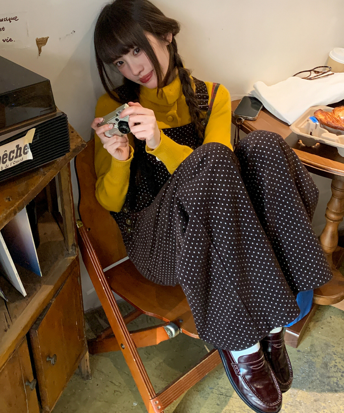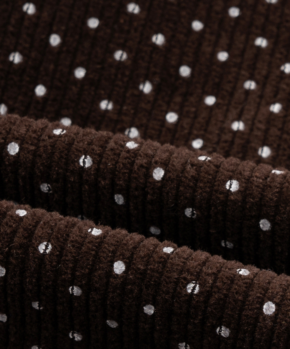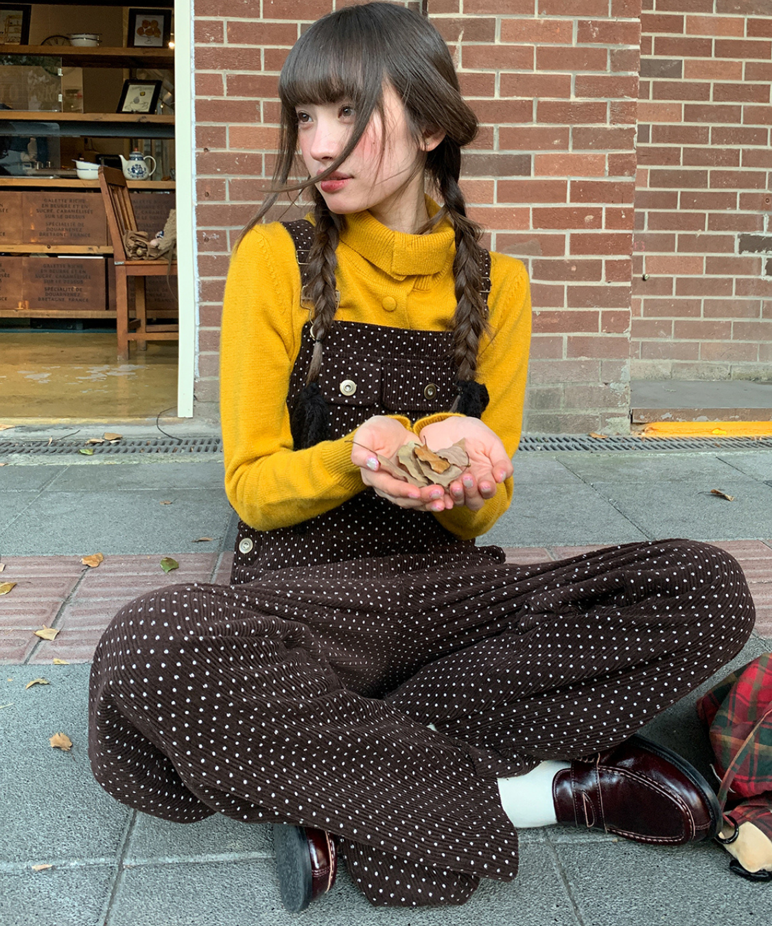 やわらかなコーデュロイ生地にドット柄をあしらったワイドシルエットのサロペットパンツです。