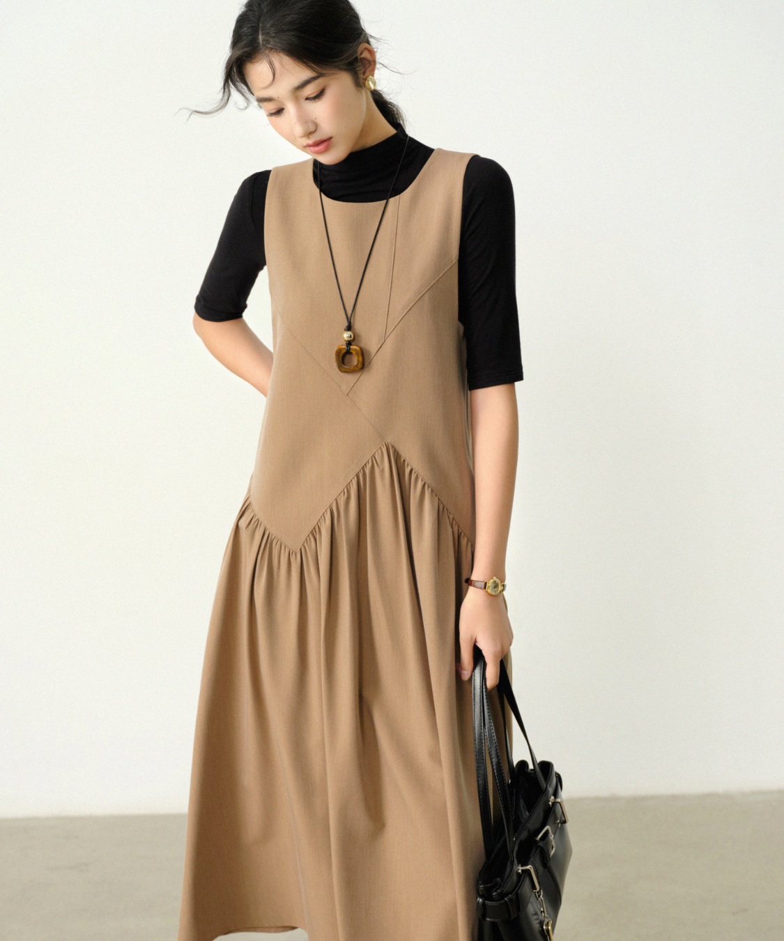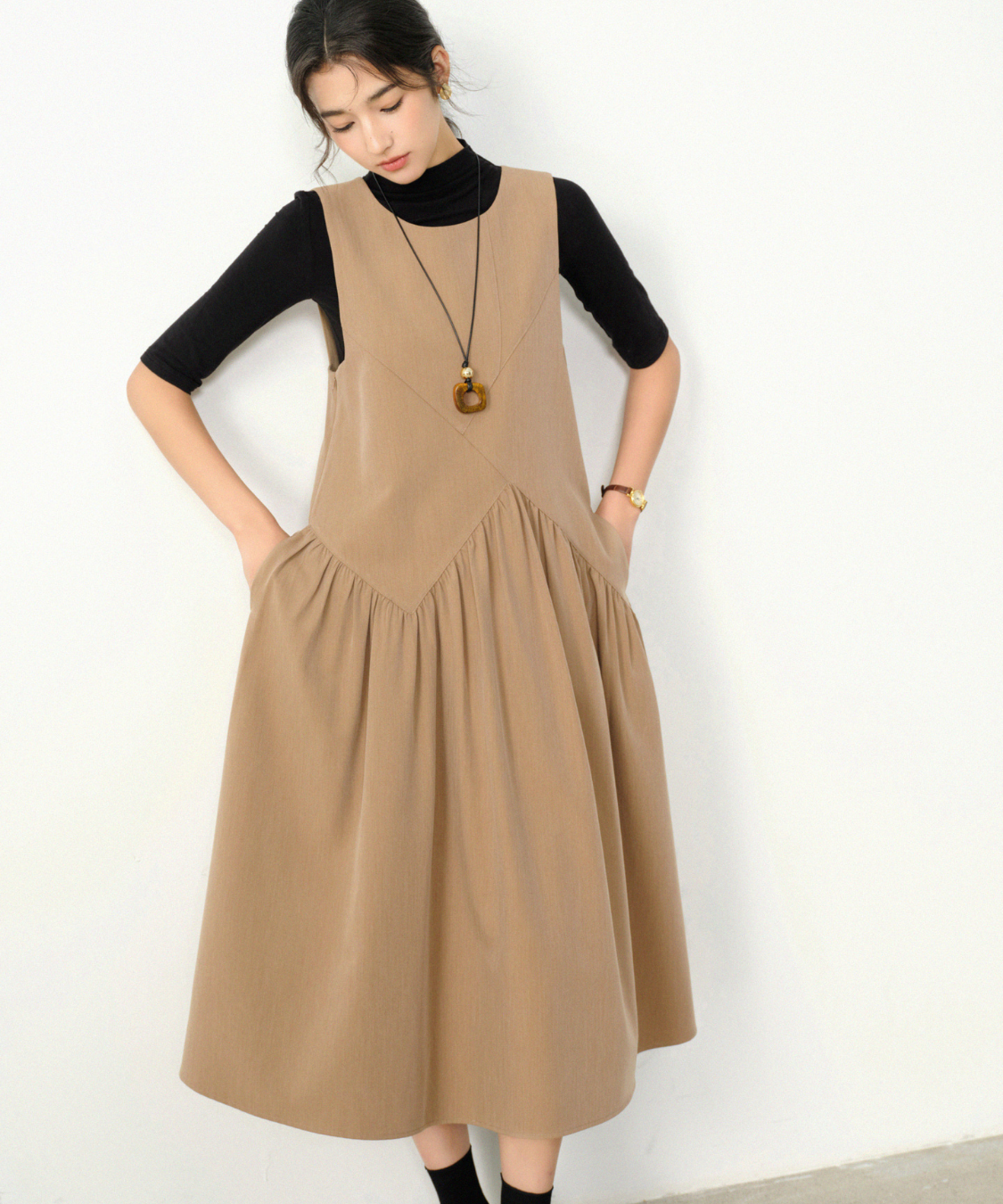 Vラインの切替が印象的なノースリーブワンピースです。