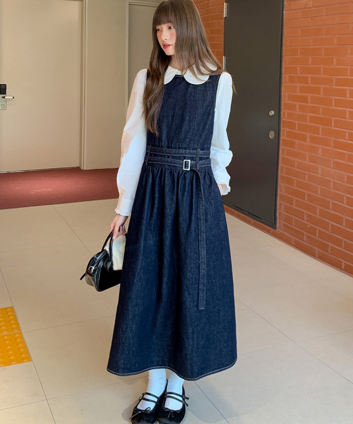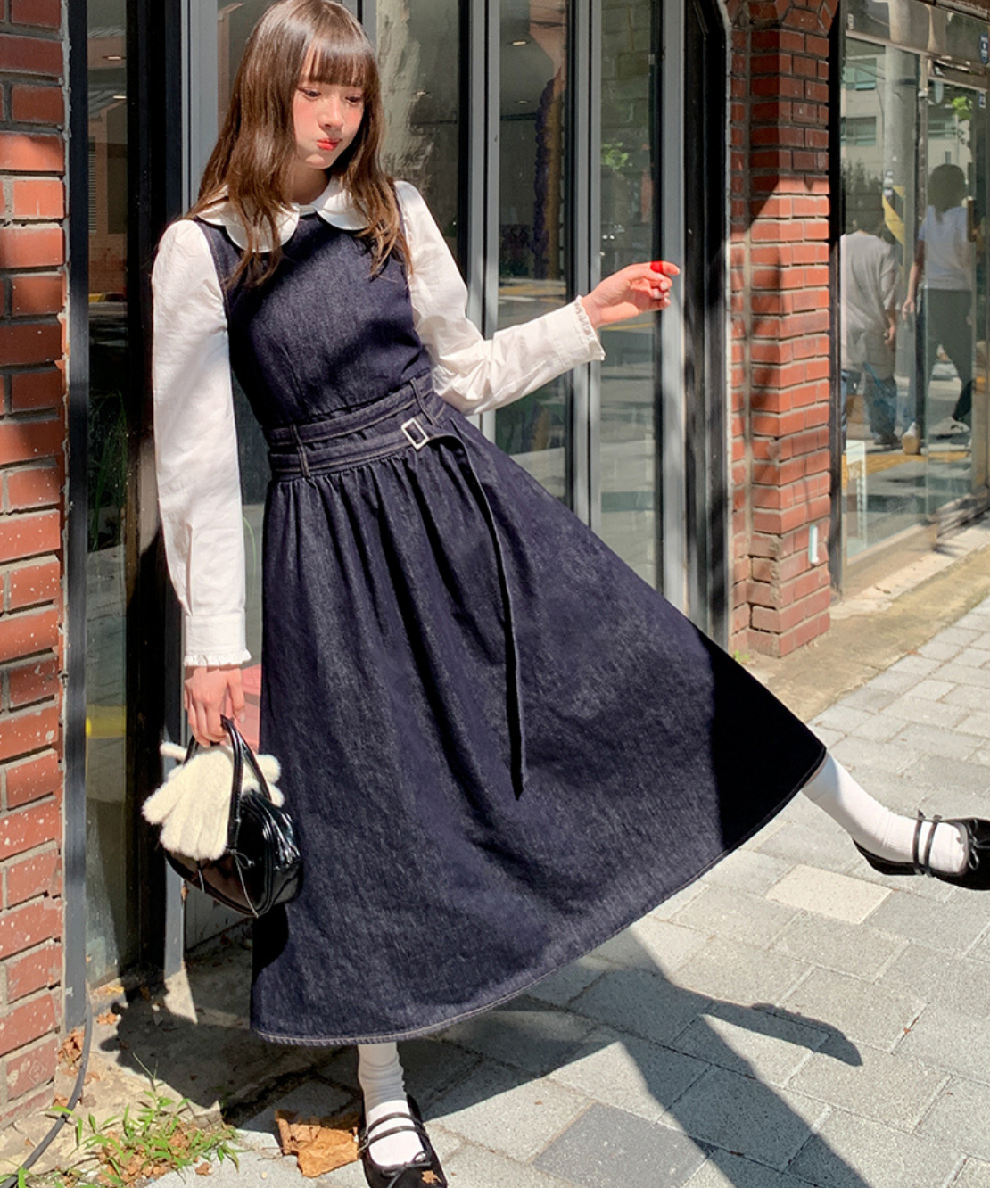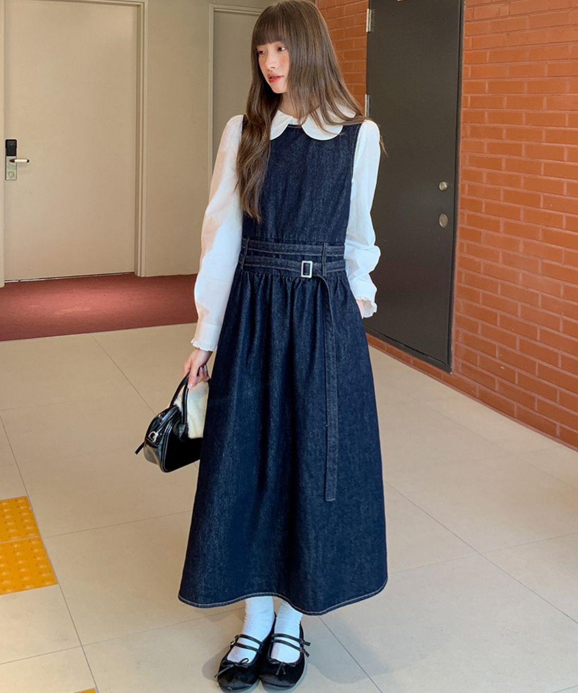 ウエストのベルトデザインがアクセントになったデニムワンピースです。