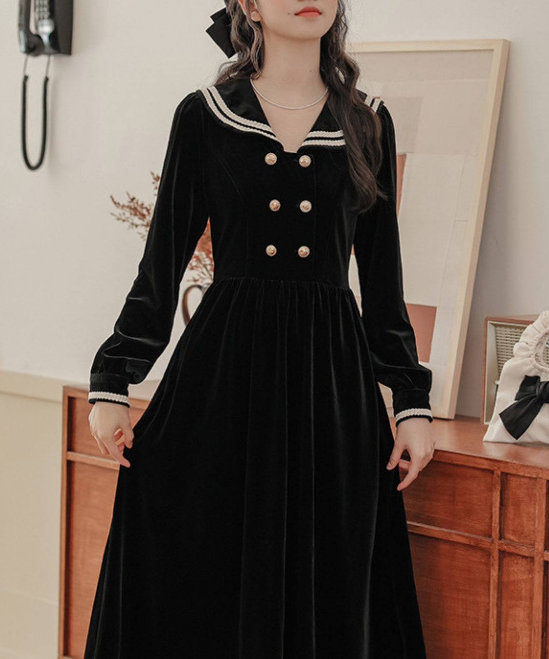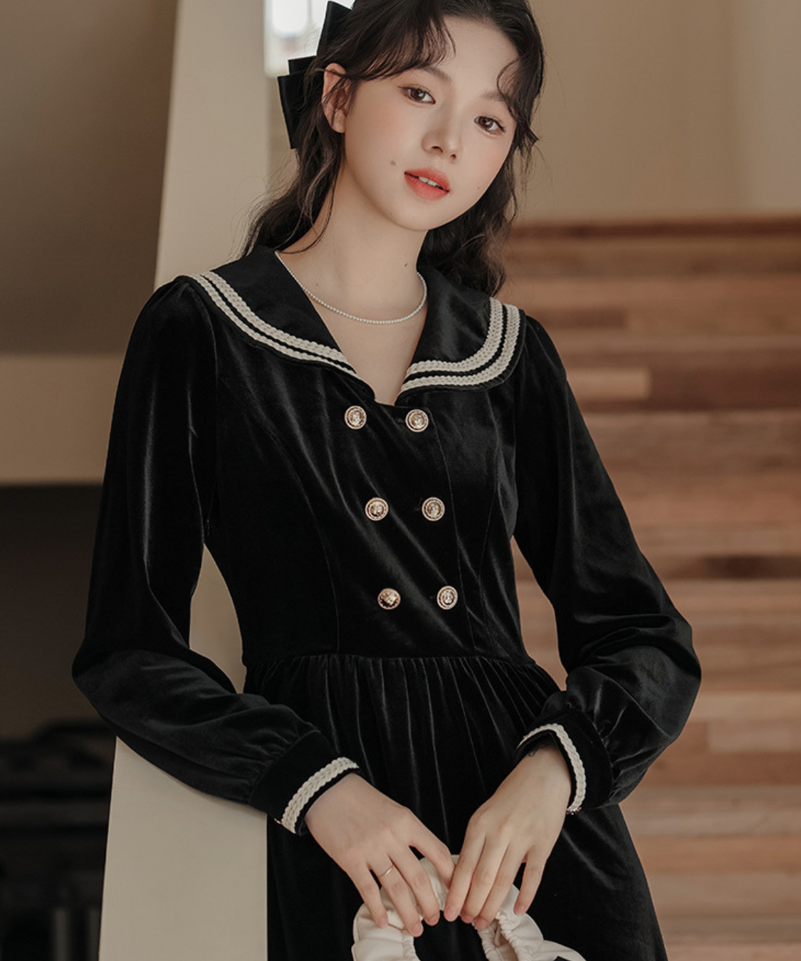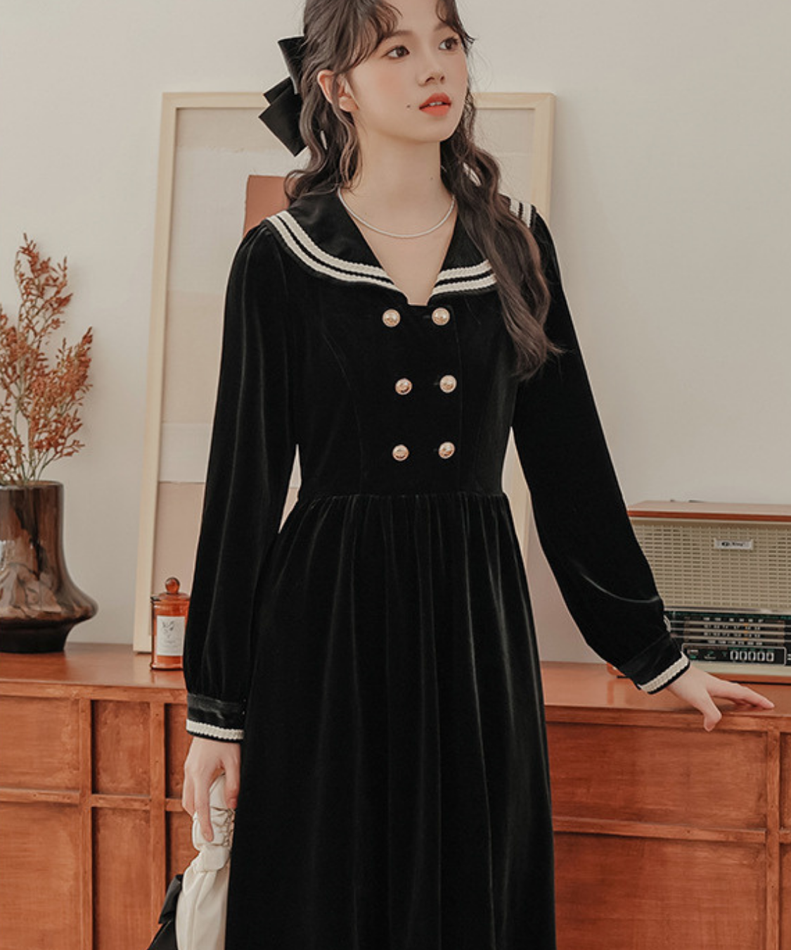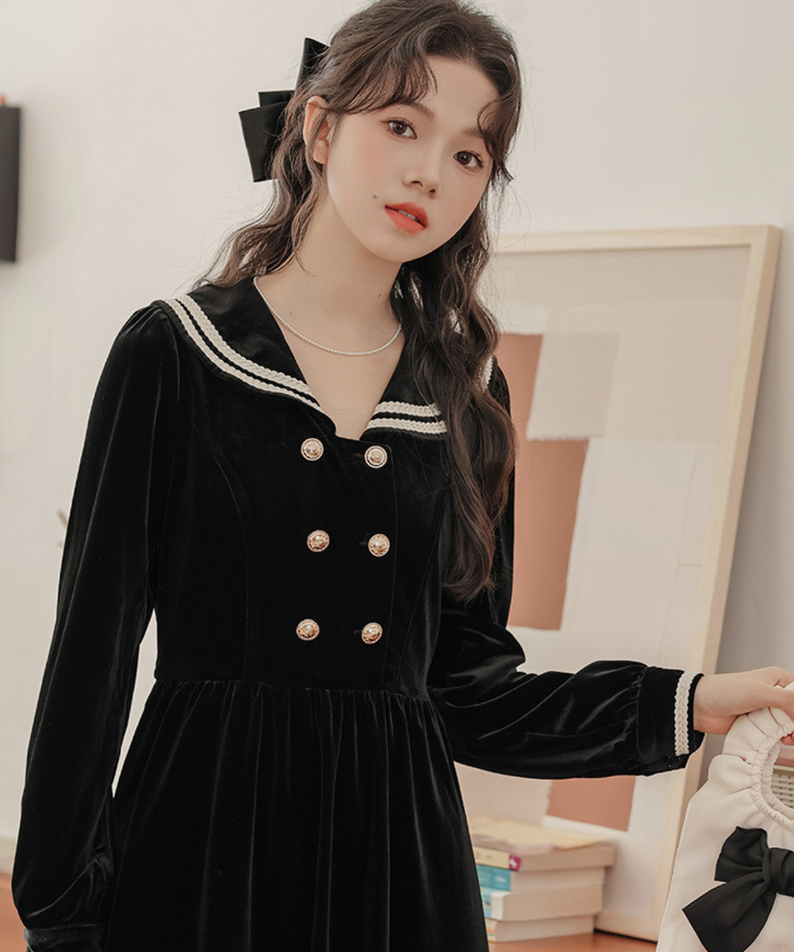 上品な光沢感が魅力のベロア素材を使用した、セーラーカラーワンピースです。
