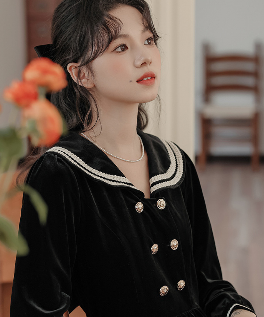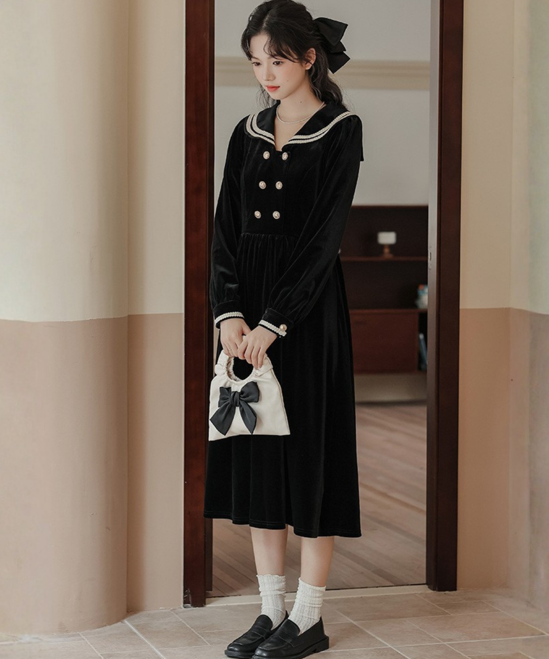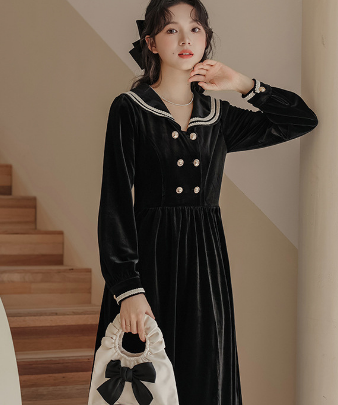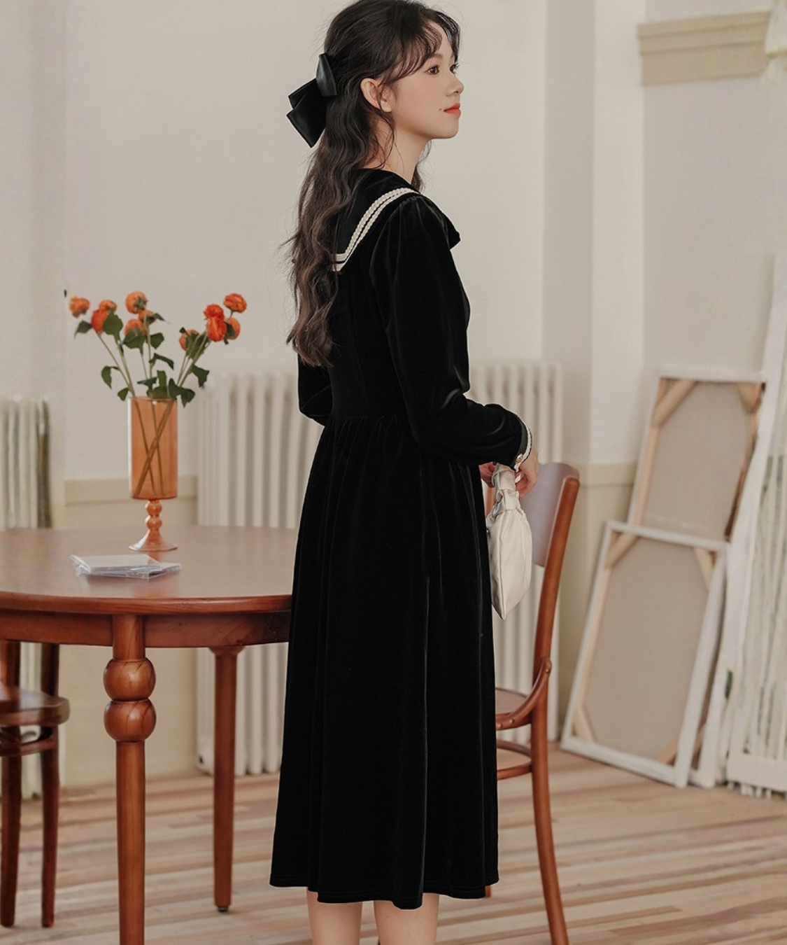 上品な光沢感が魅力のベロア素材を使用した、セーラーカラーワンピースです。
