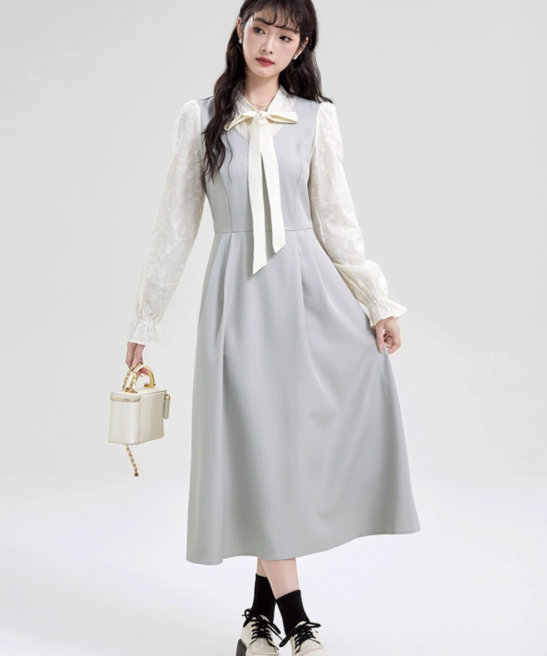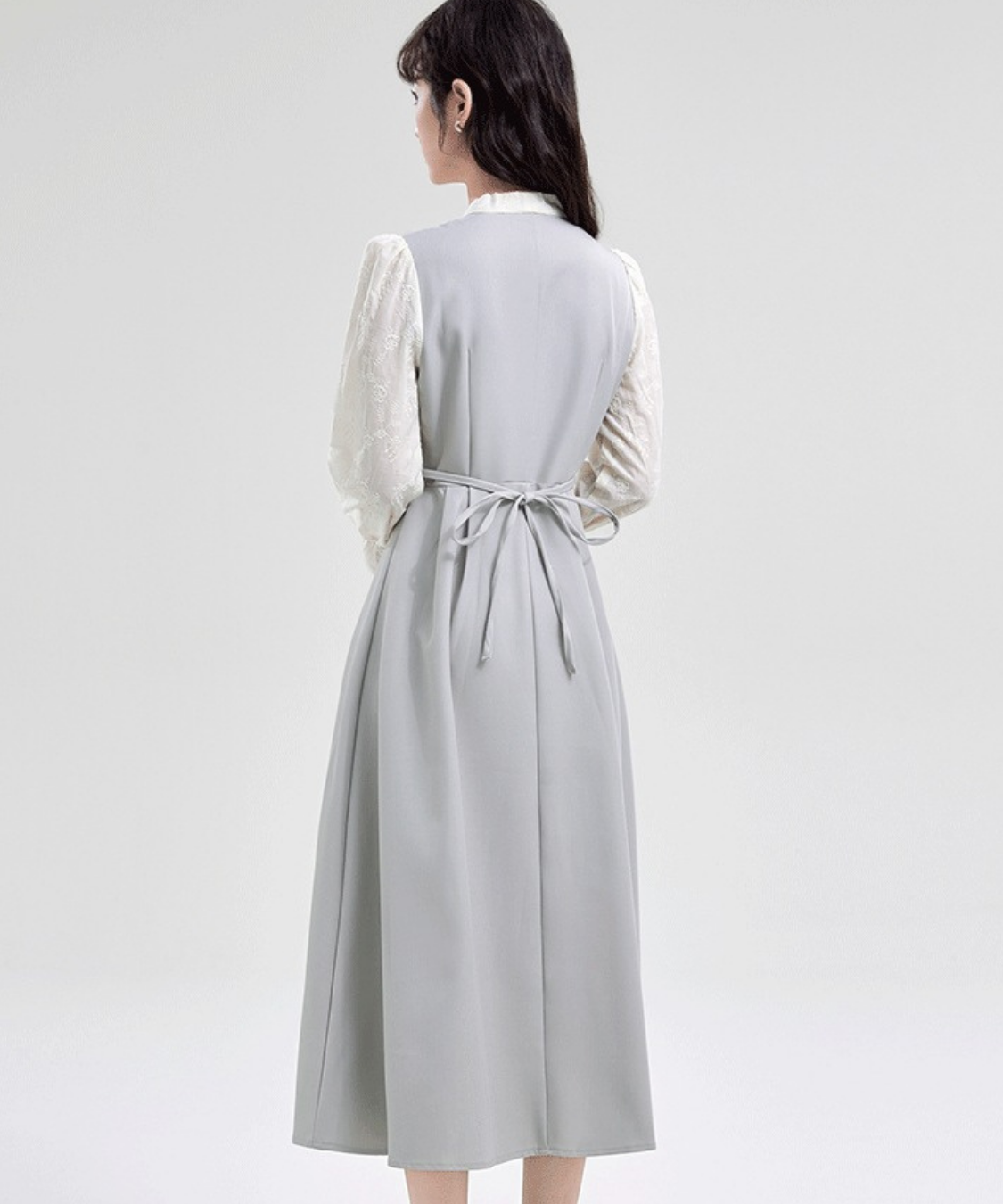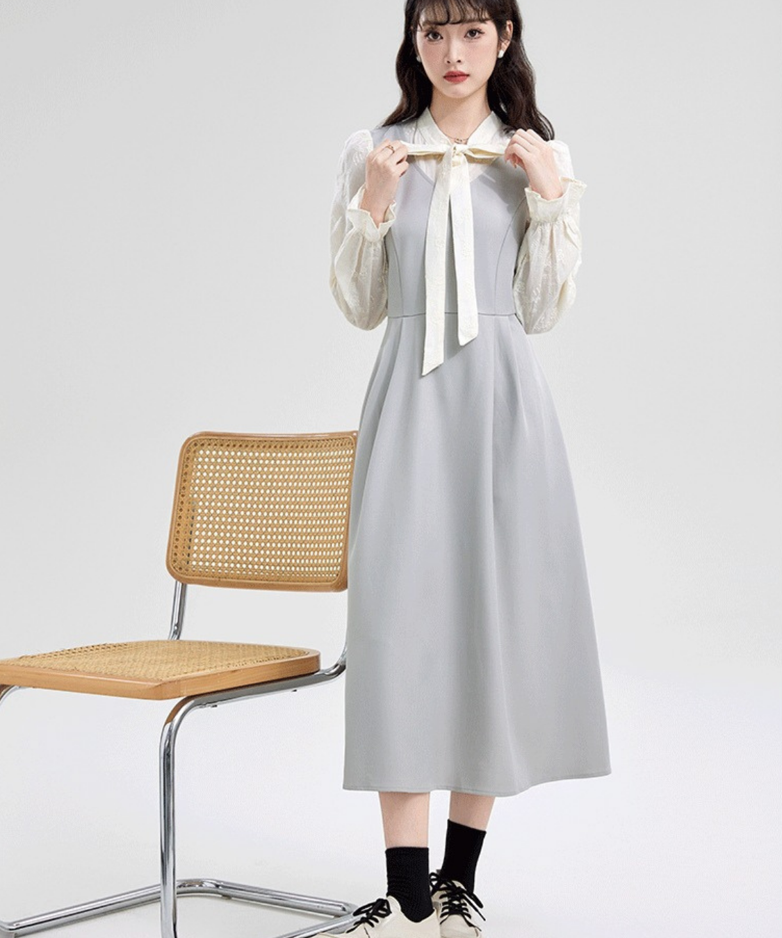 ボウタイレーススリーブ切替フェイクレイヤードワンピース