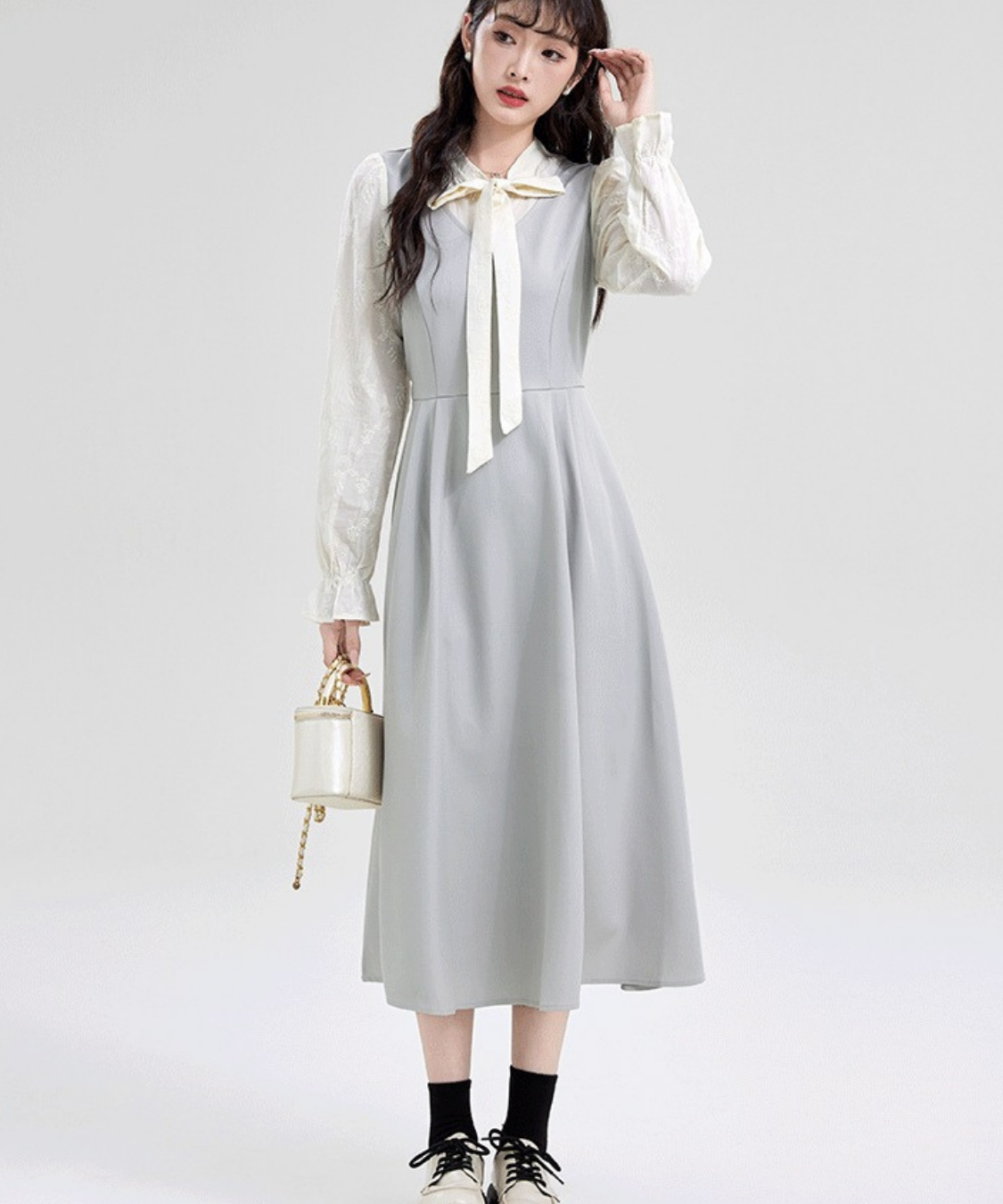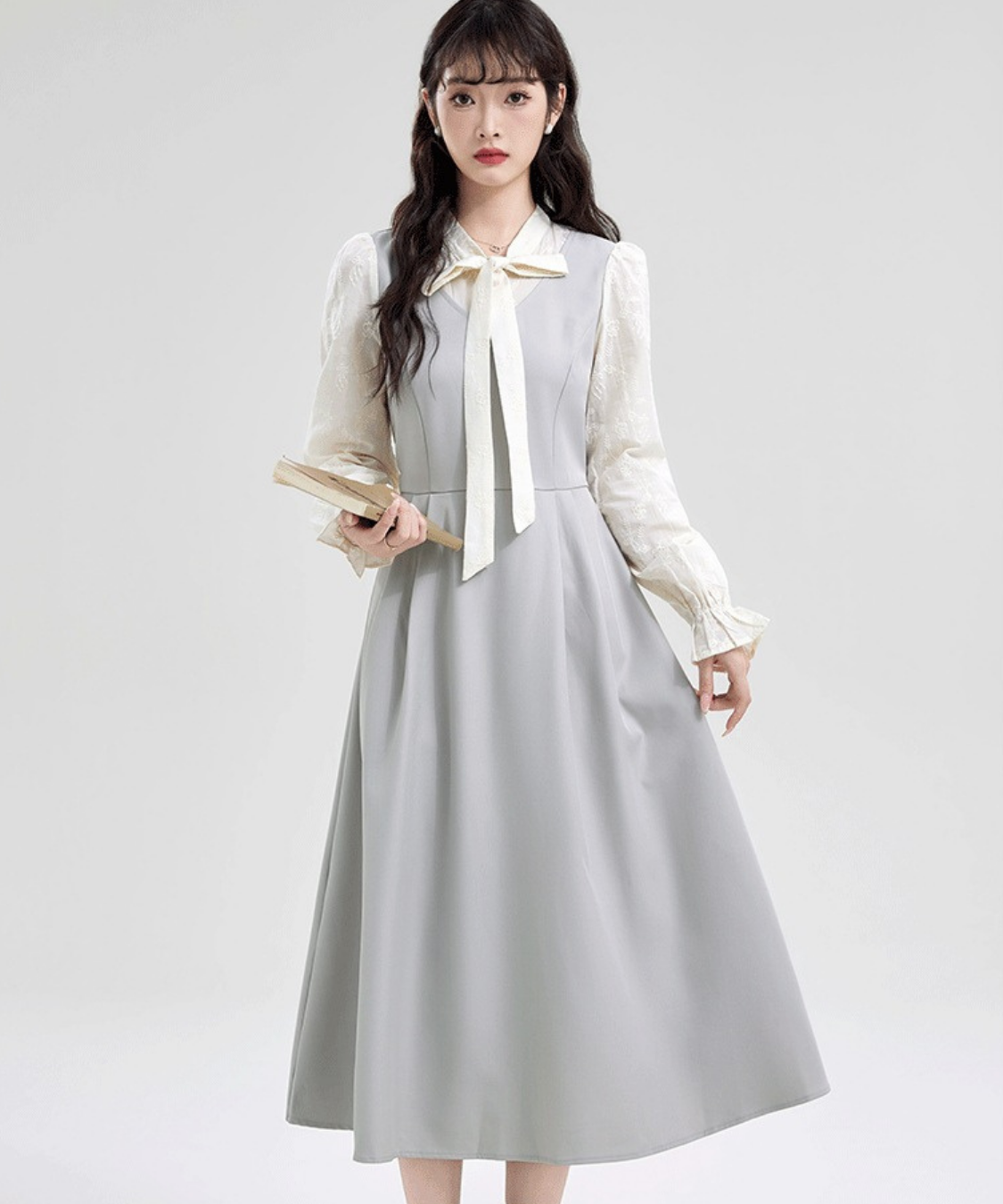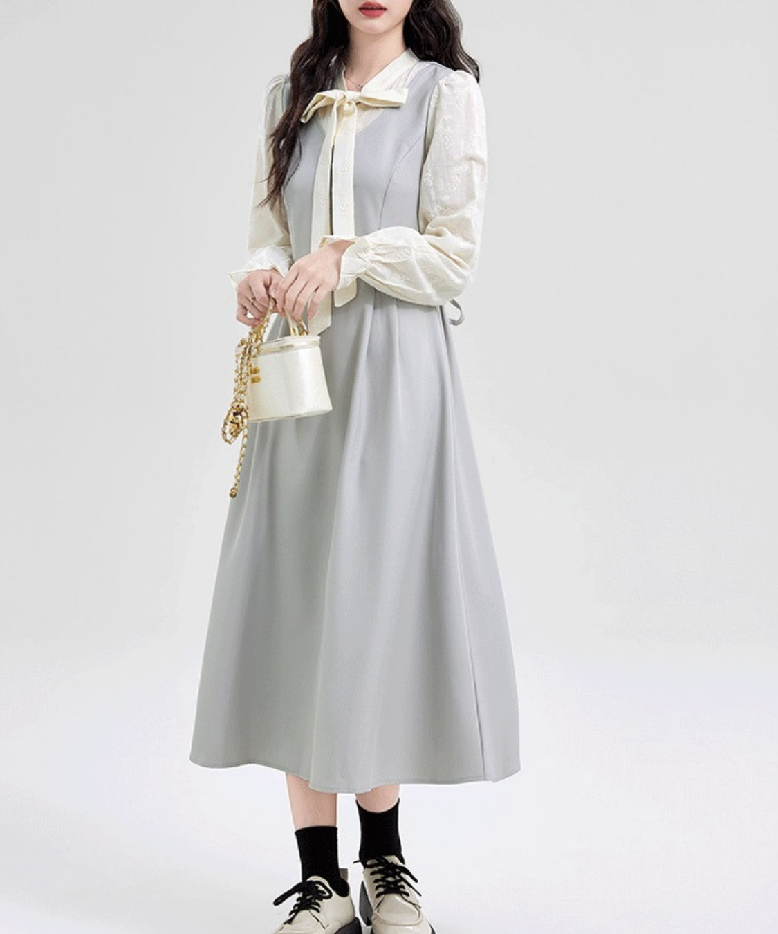 ボウタイレーススリーブ切替フェイクレイヤードワンピース