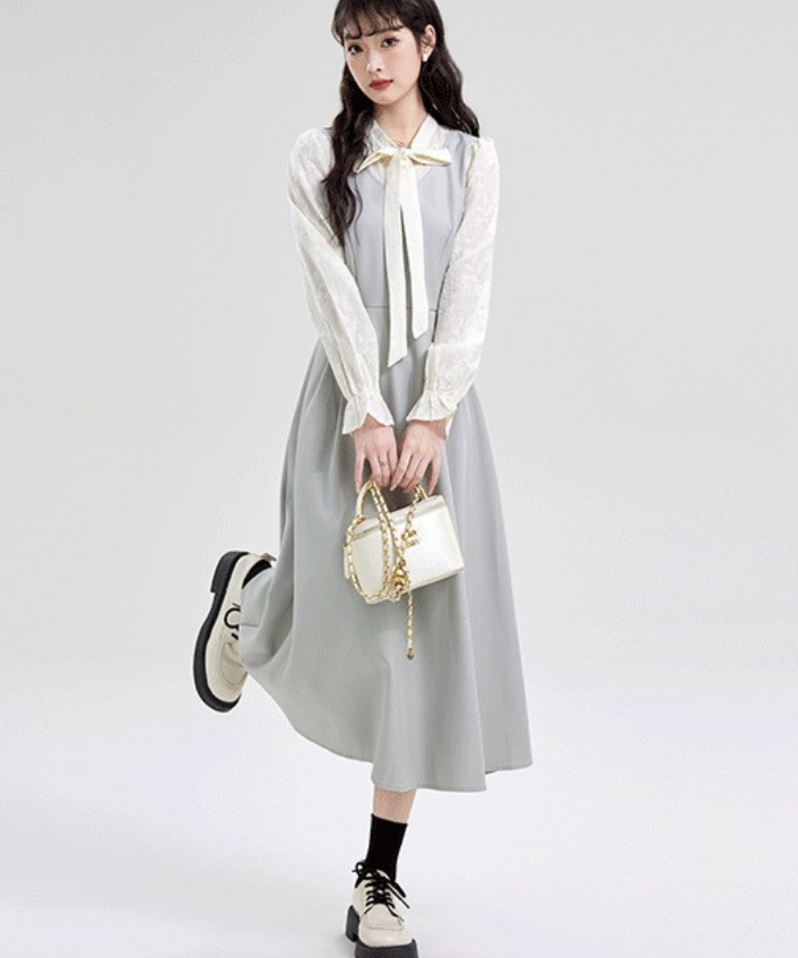 ボウタイとレース袖が華やかさをプラスするフェイクレイヤードワンピースです。