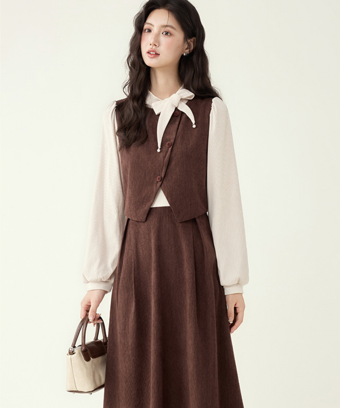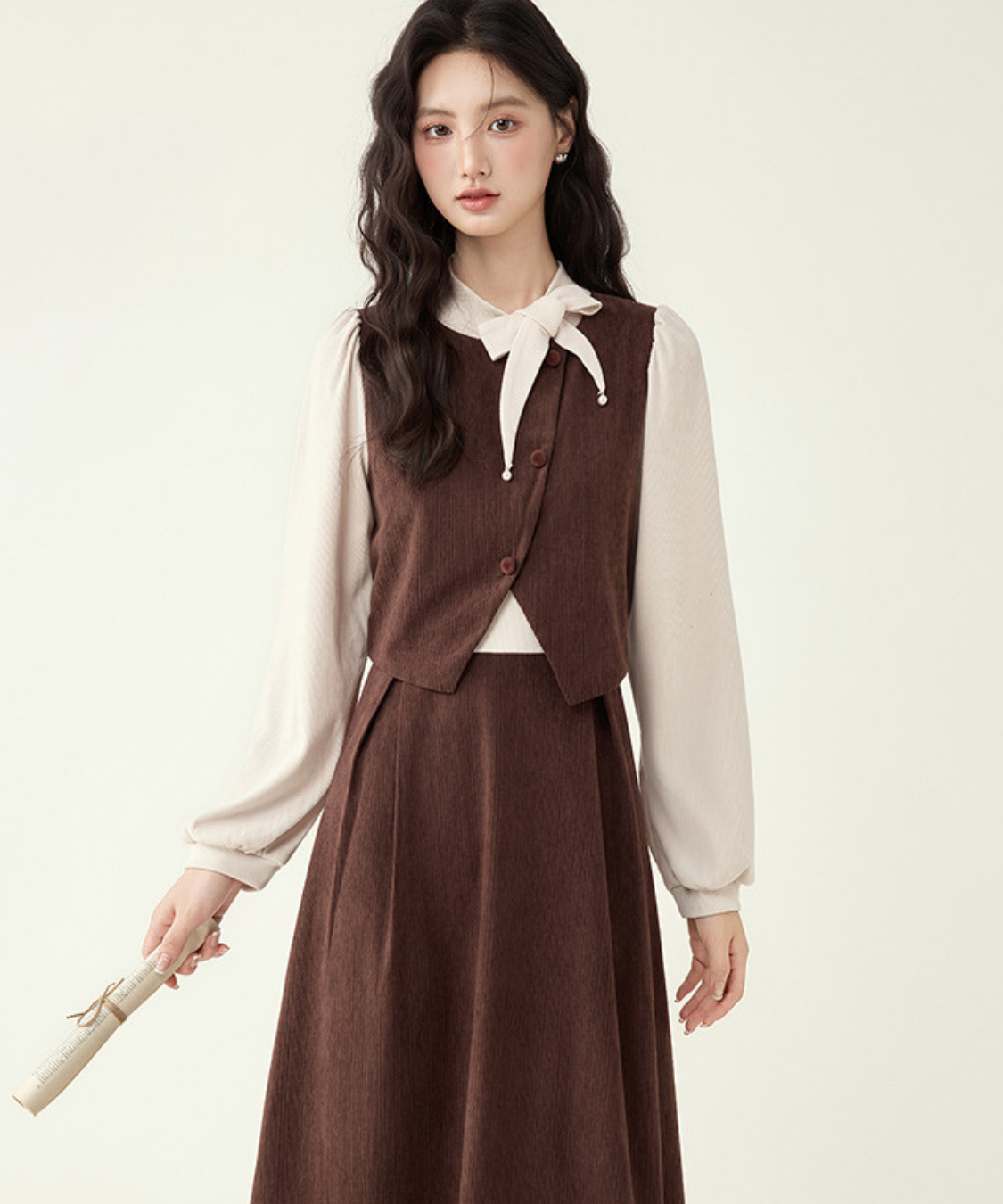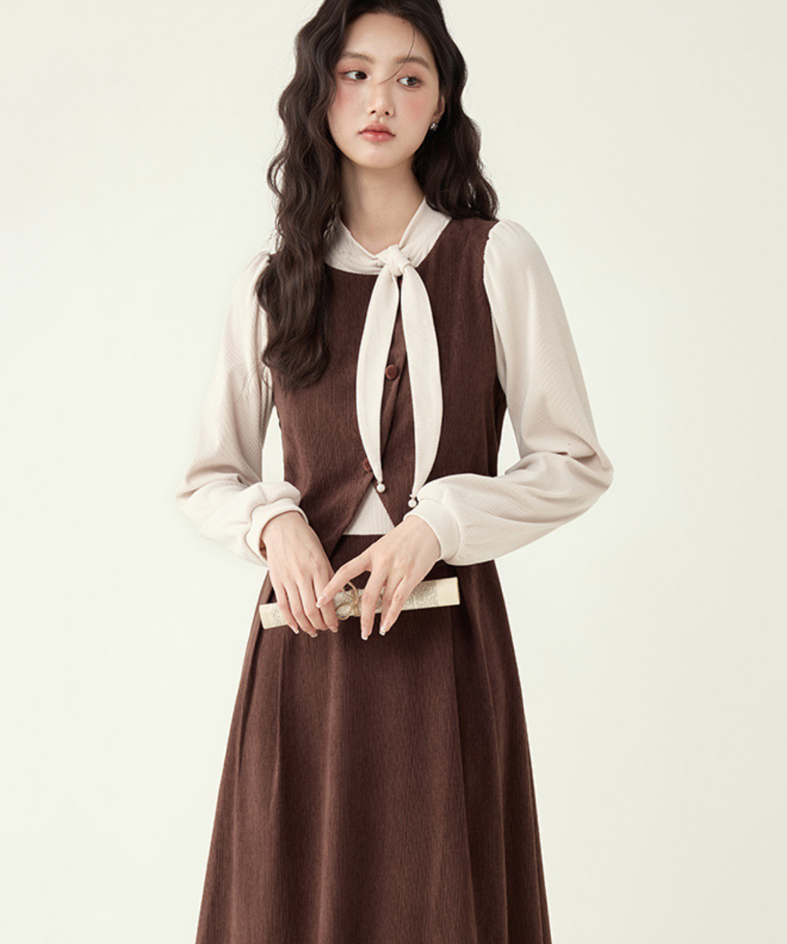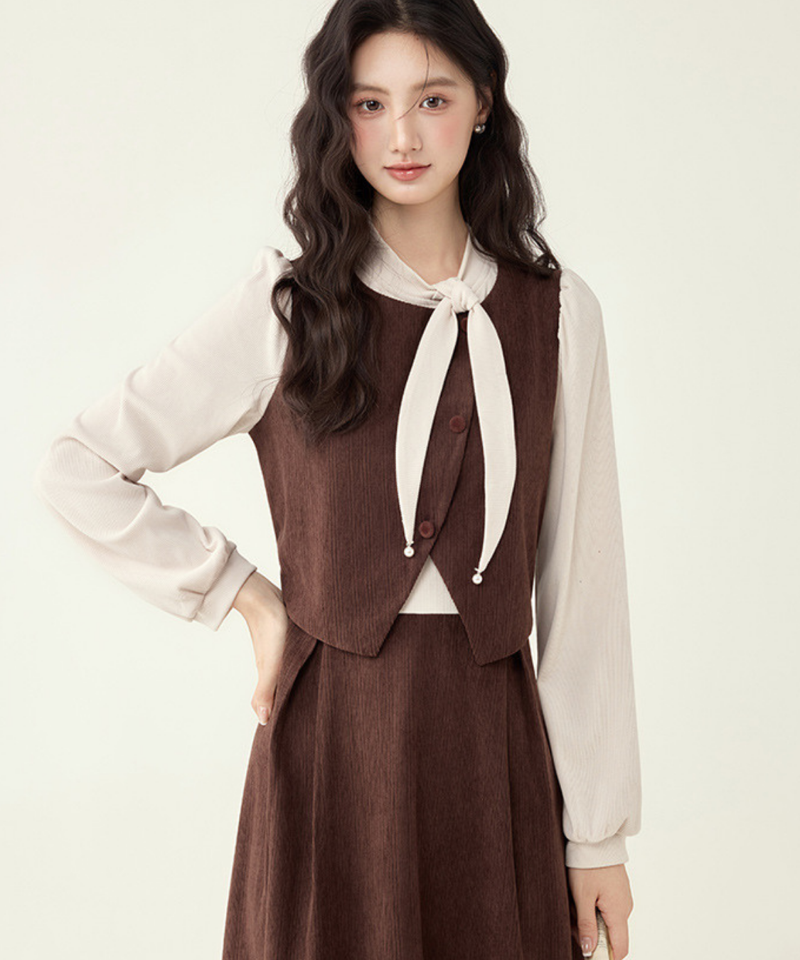 まるでレイヤードしているかのような、ベスト風デザインが目を引くAラインワンピースです。