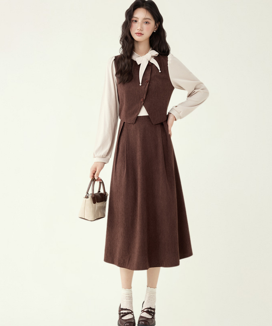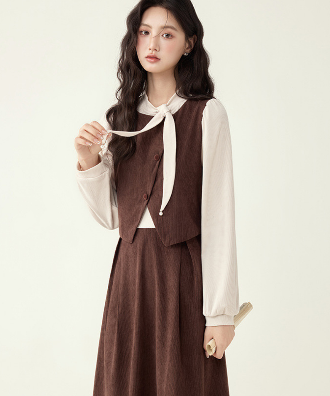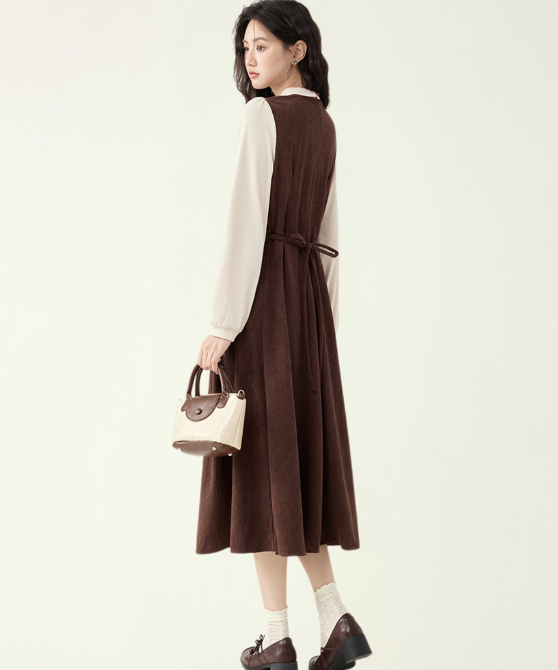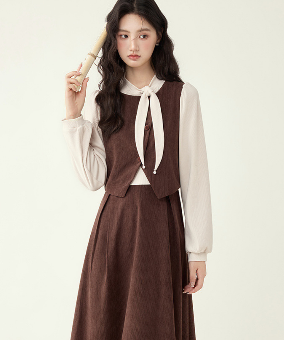 まるでレイヤードしているかのような、ベスト風デザインが目を引くAラインワンピースです。