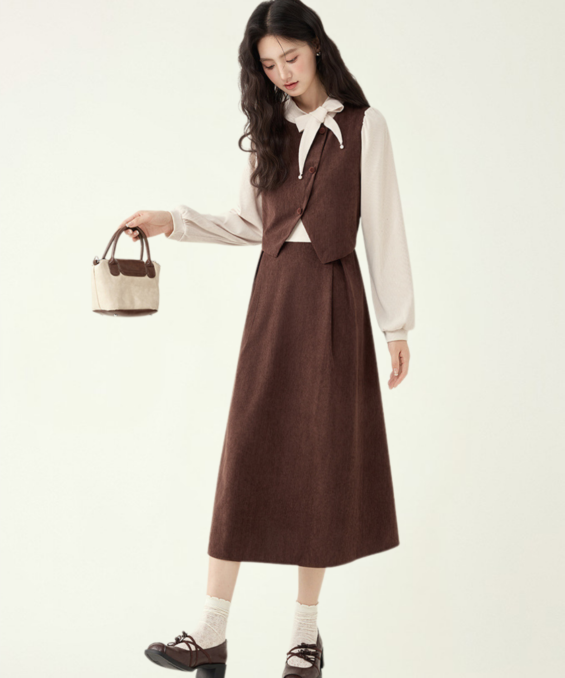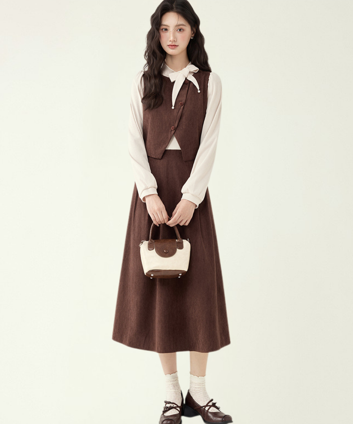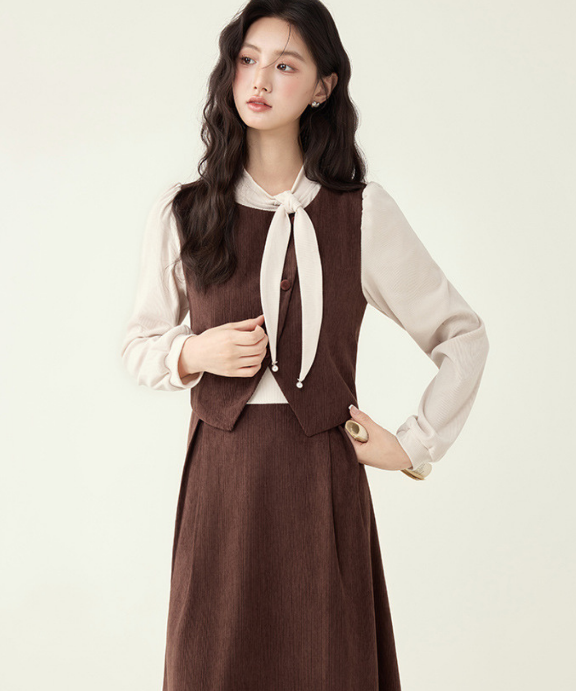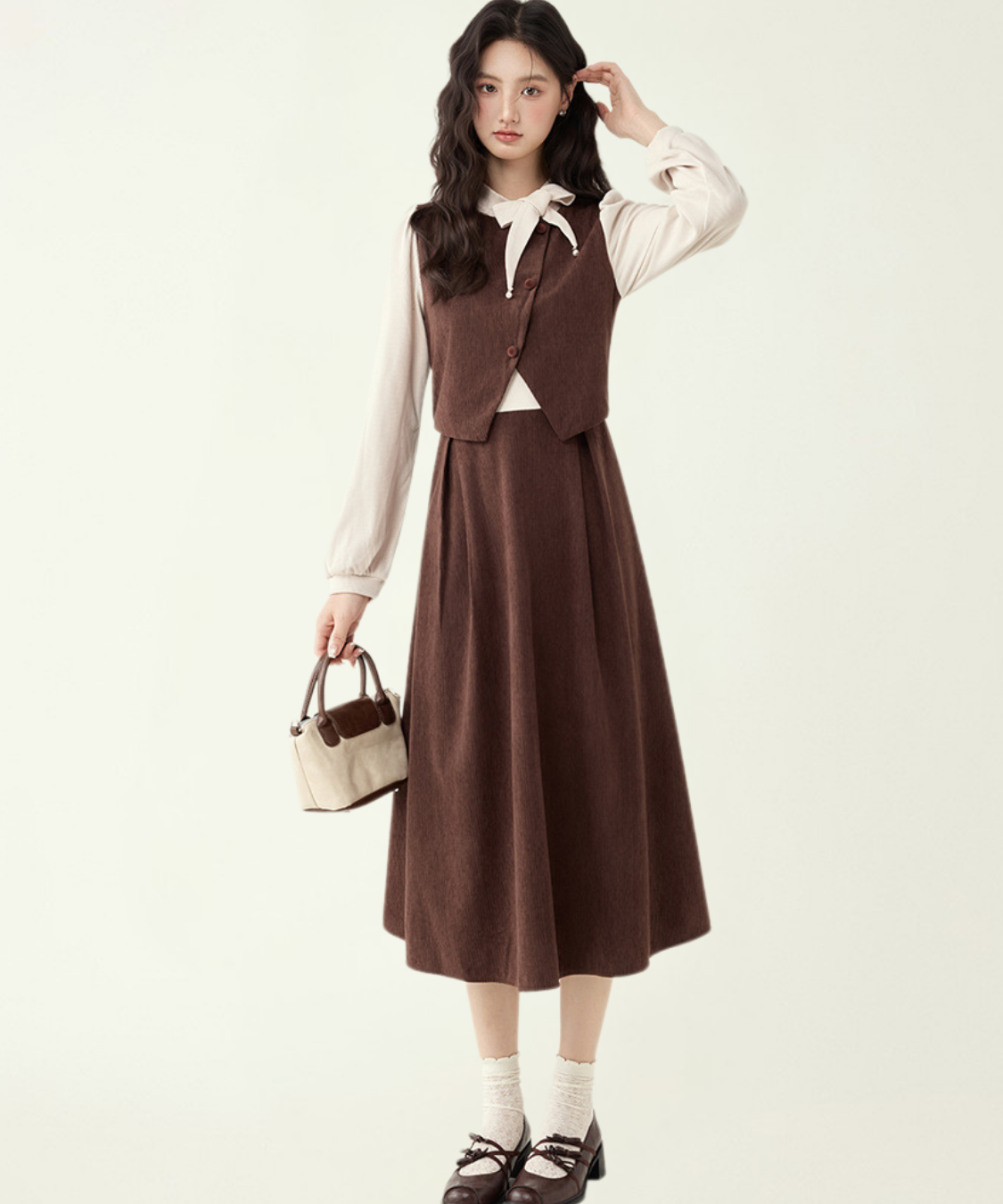 まるでレイヤードしているかのような、ベスト風デザインが目を引くAラインワンピースです。