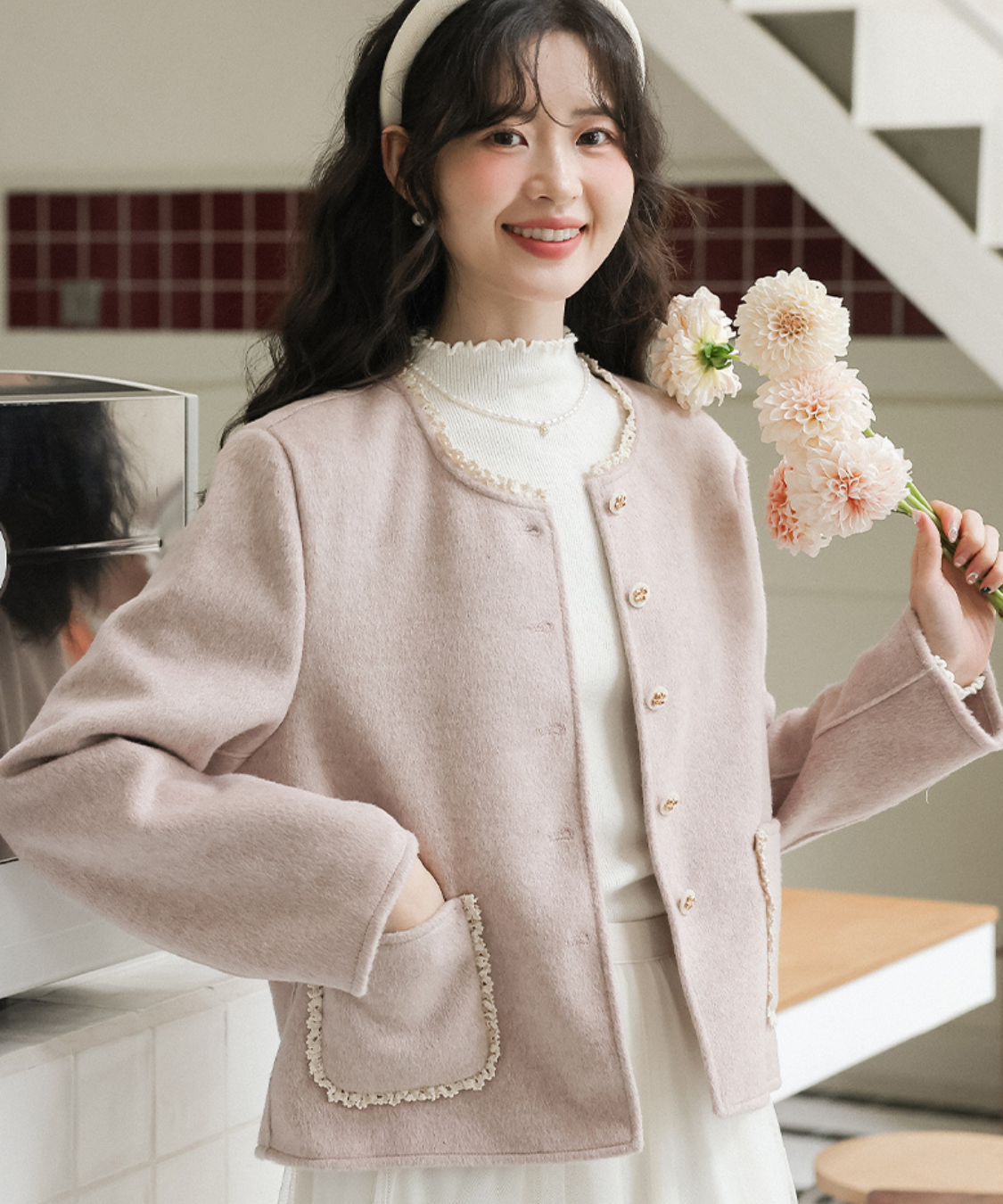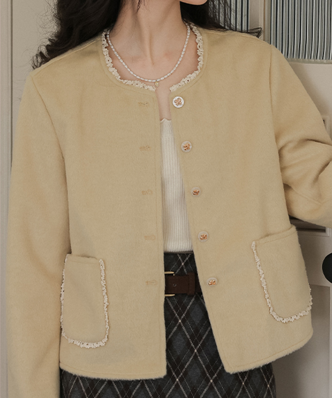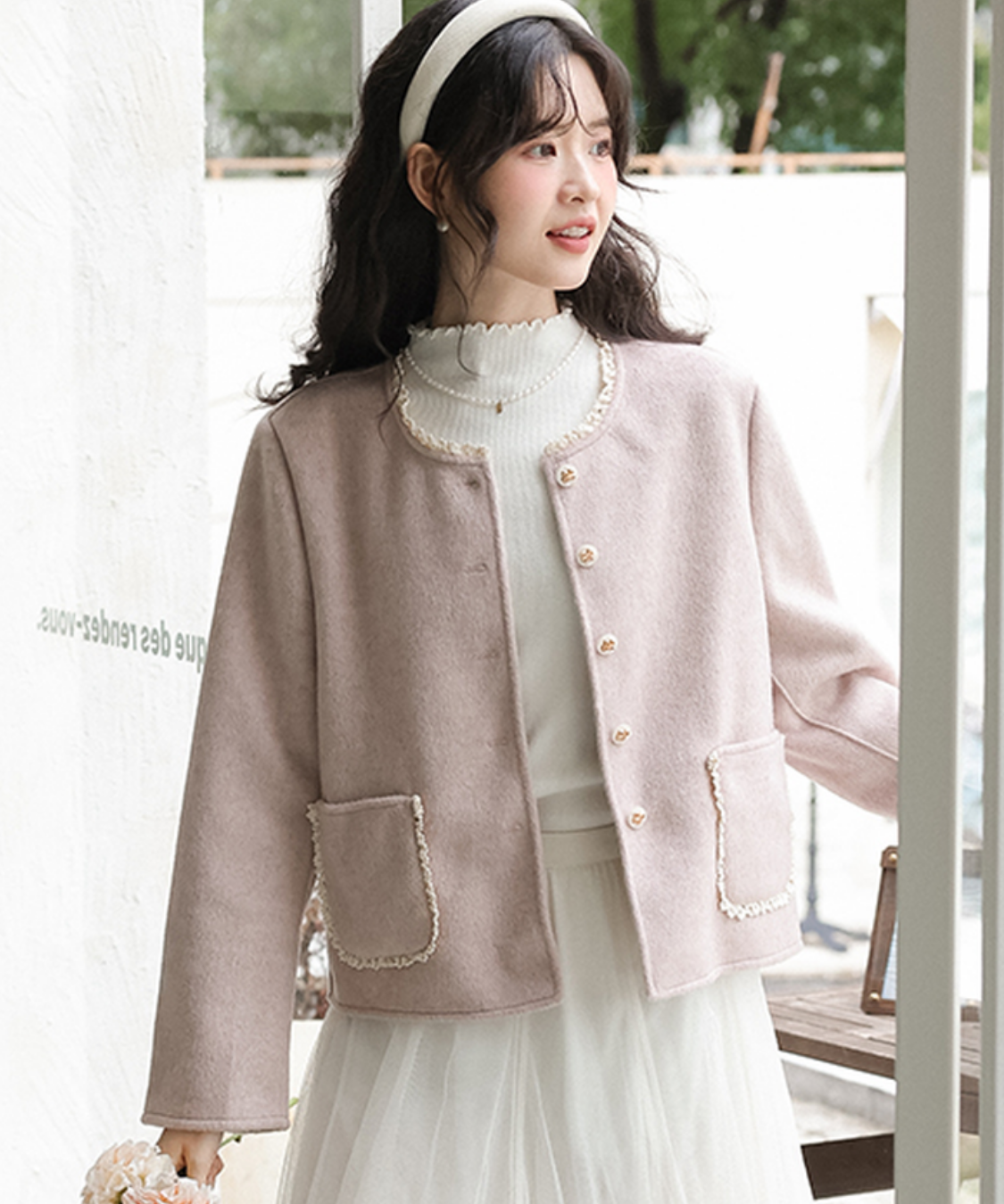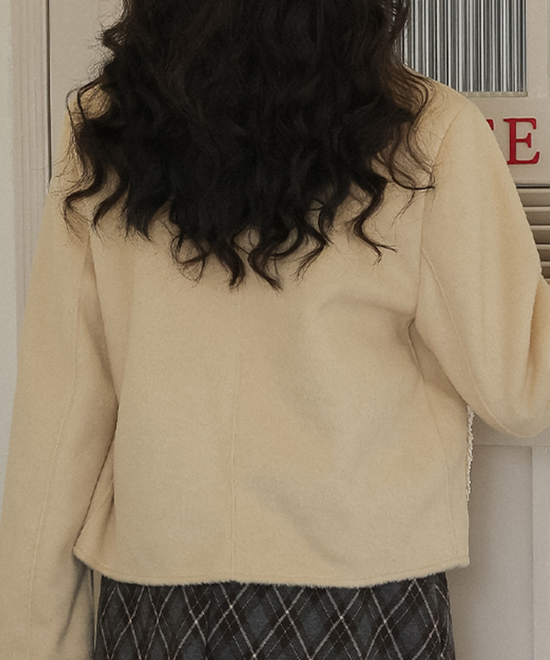 柔らかな雰囲気を演出する、配色フリルパイピングが可愛らしいジャケットです。