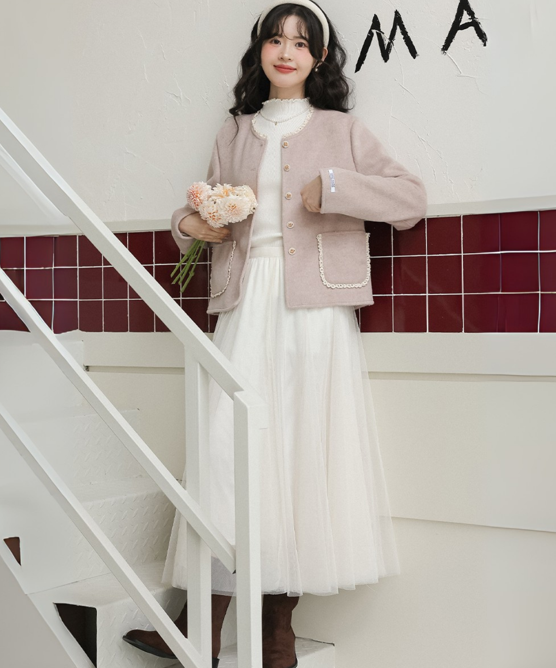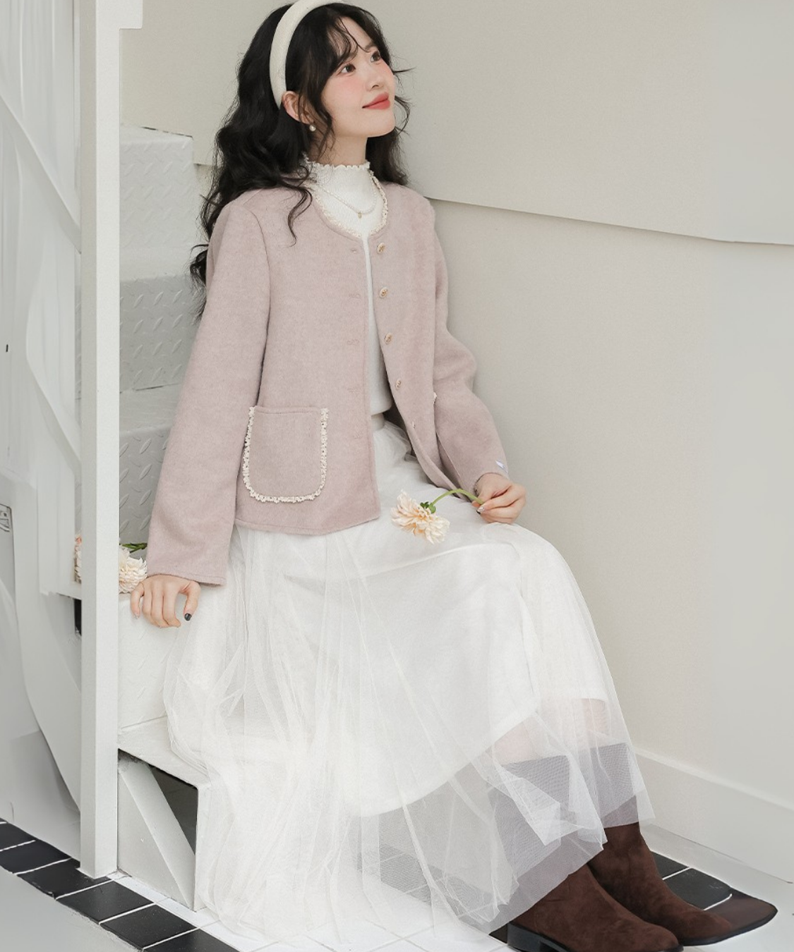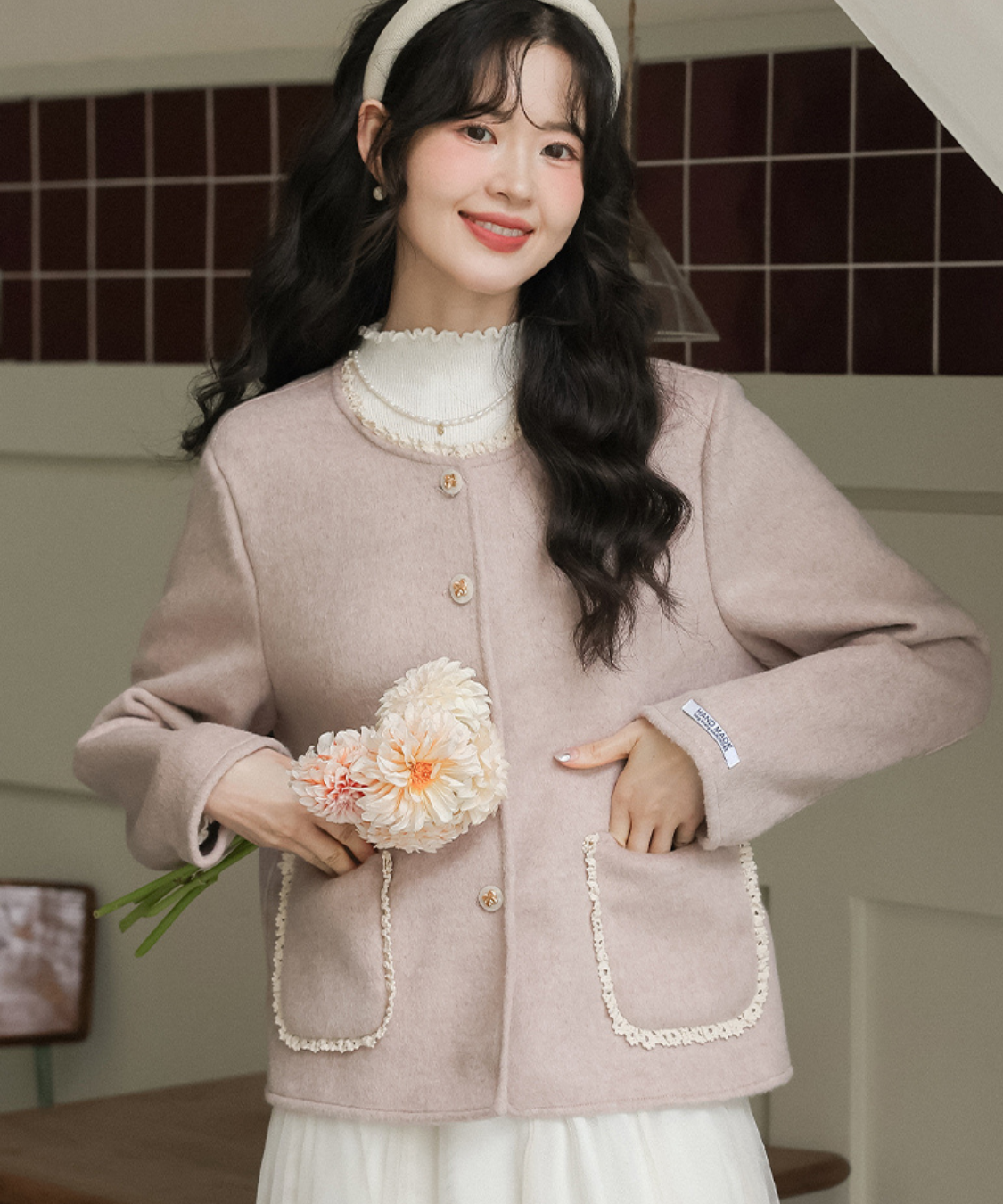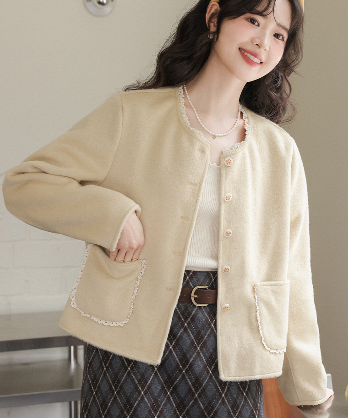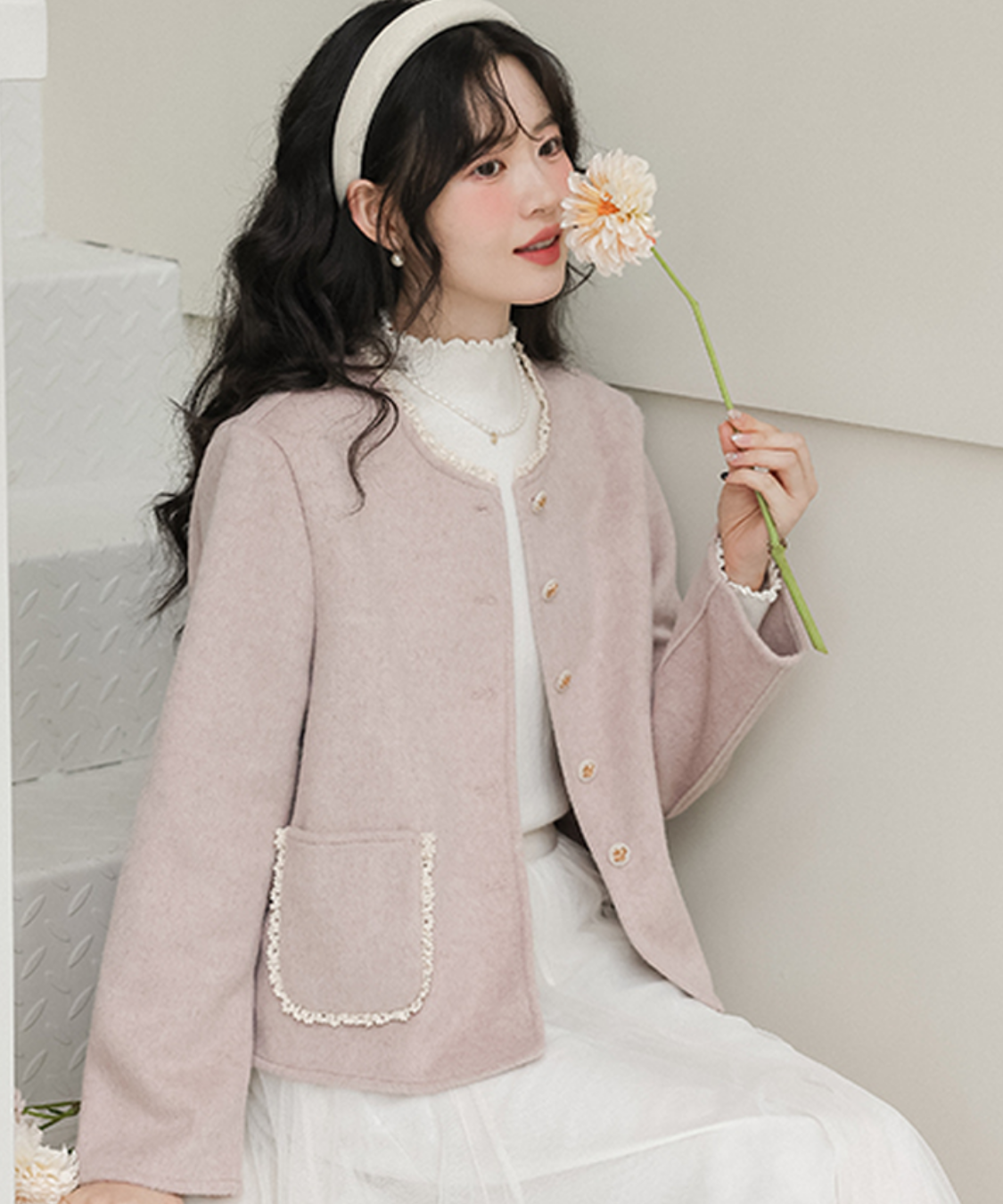 柔らかな雰囲気を演出する、配色フリルパイピングが可愛らしいジャケットです。