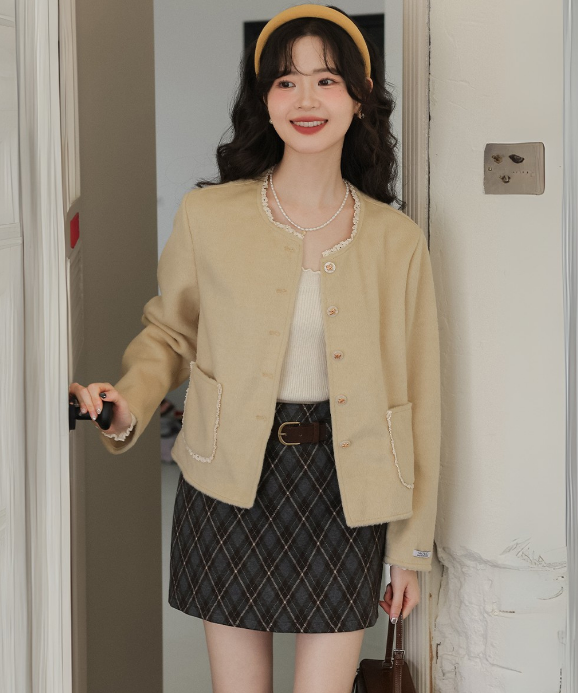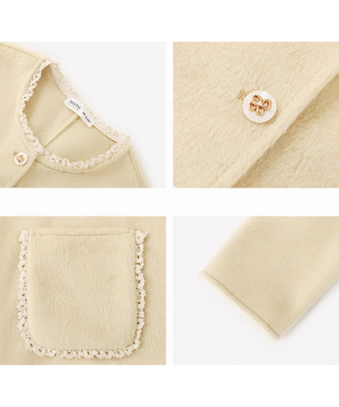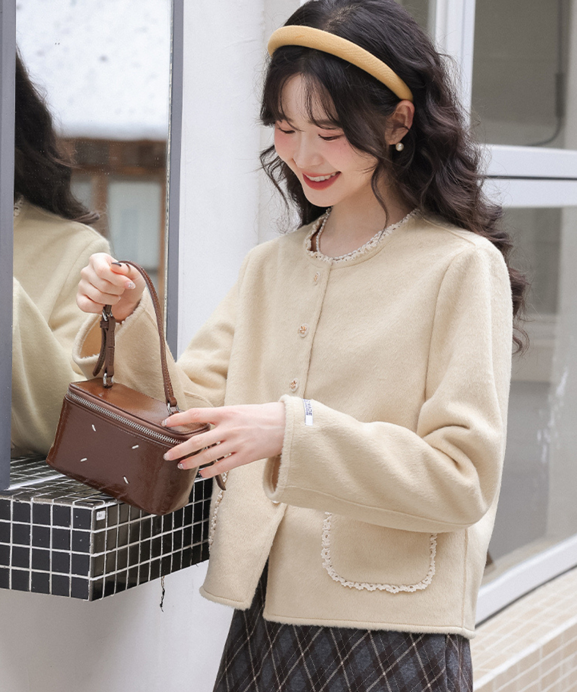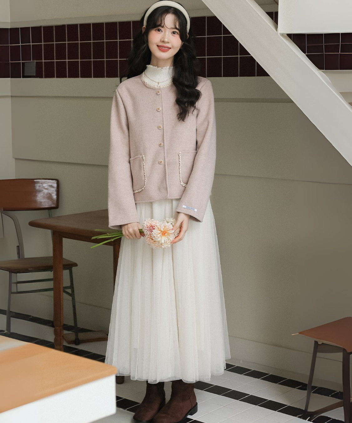 柔らかな雰囲気を演出する、配色フリルパイピングが可愛らしいジャケットです。