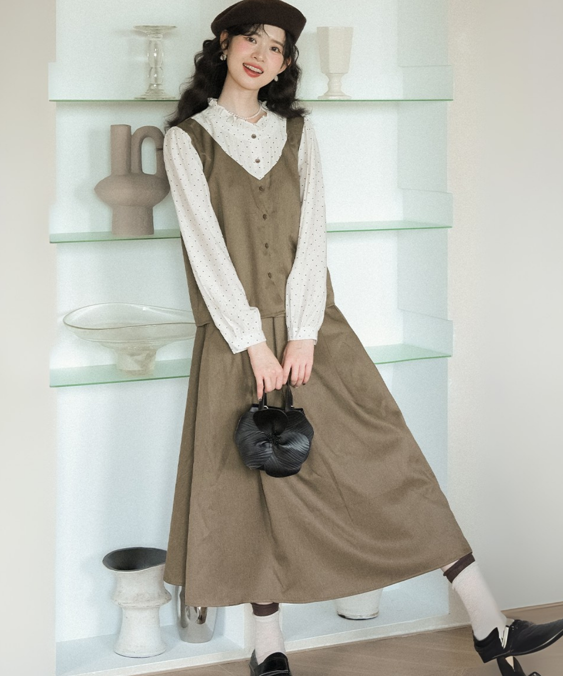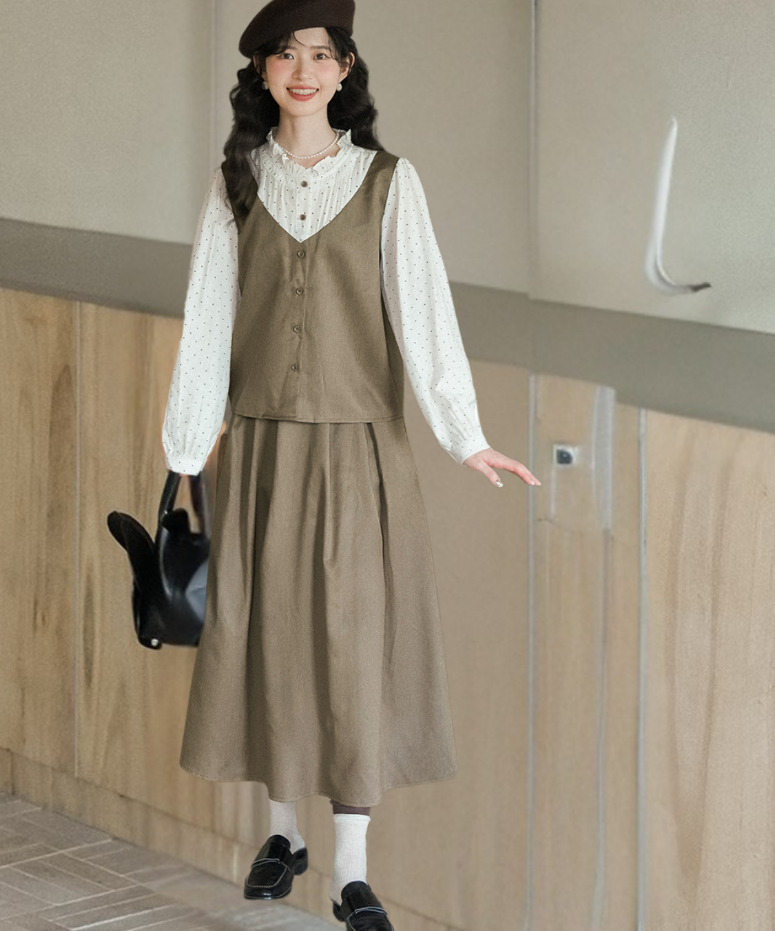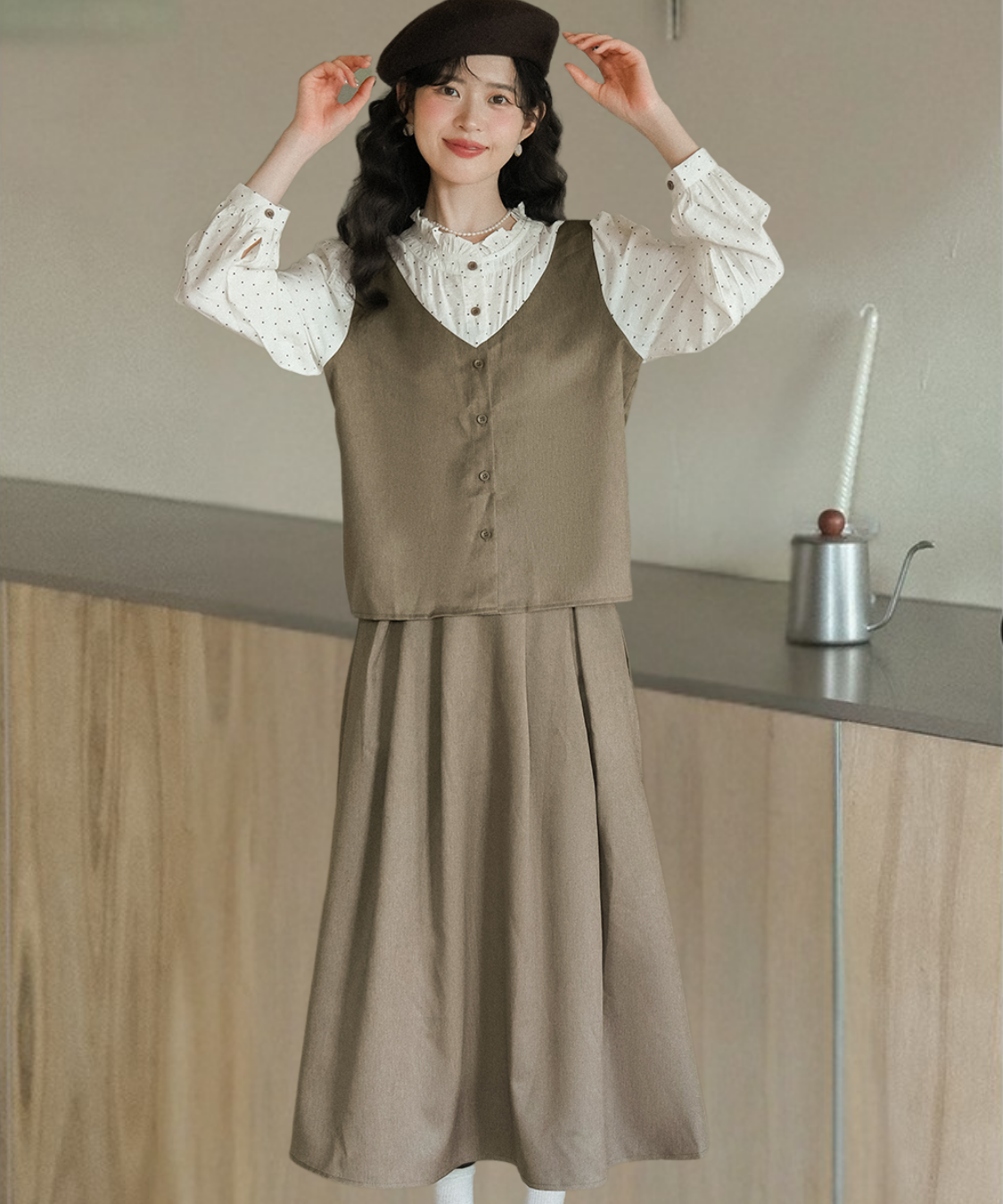 レトロ感があってすごくかわいい♡ベストとブラウスがドッキングだから、着るだけで一気にこなれ見え!