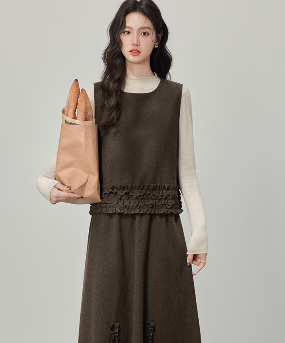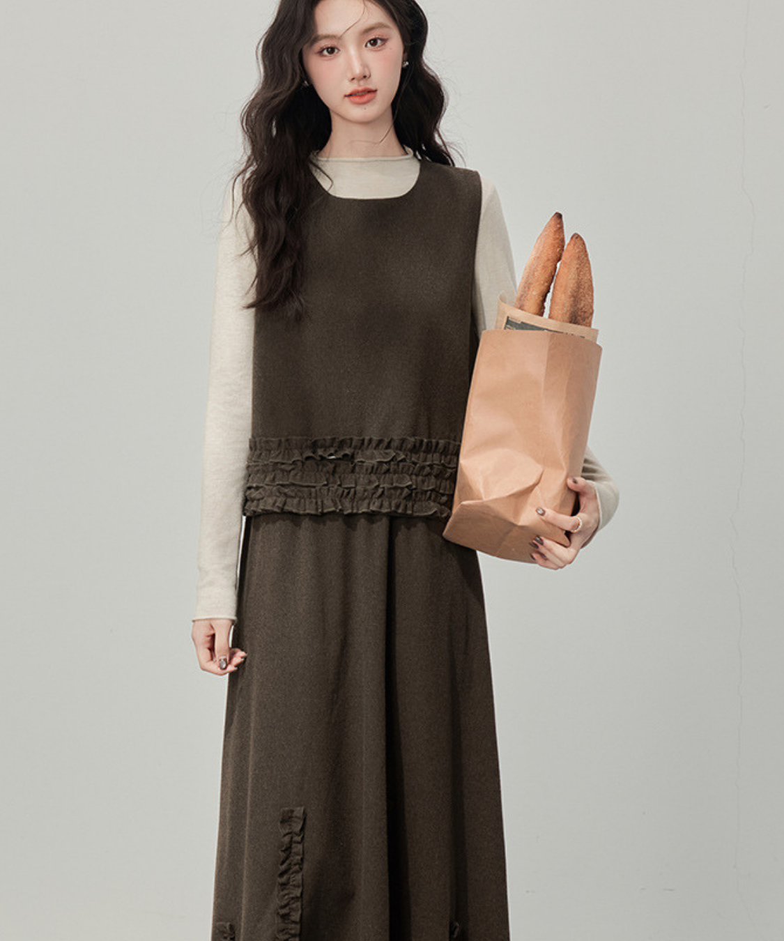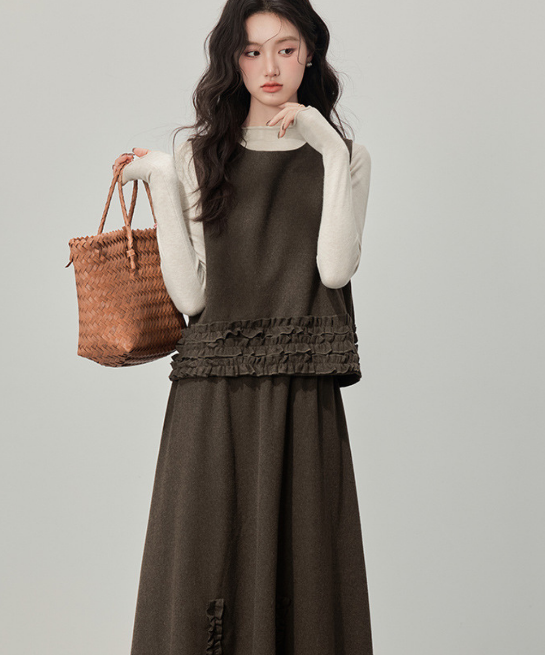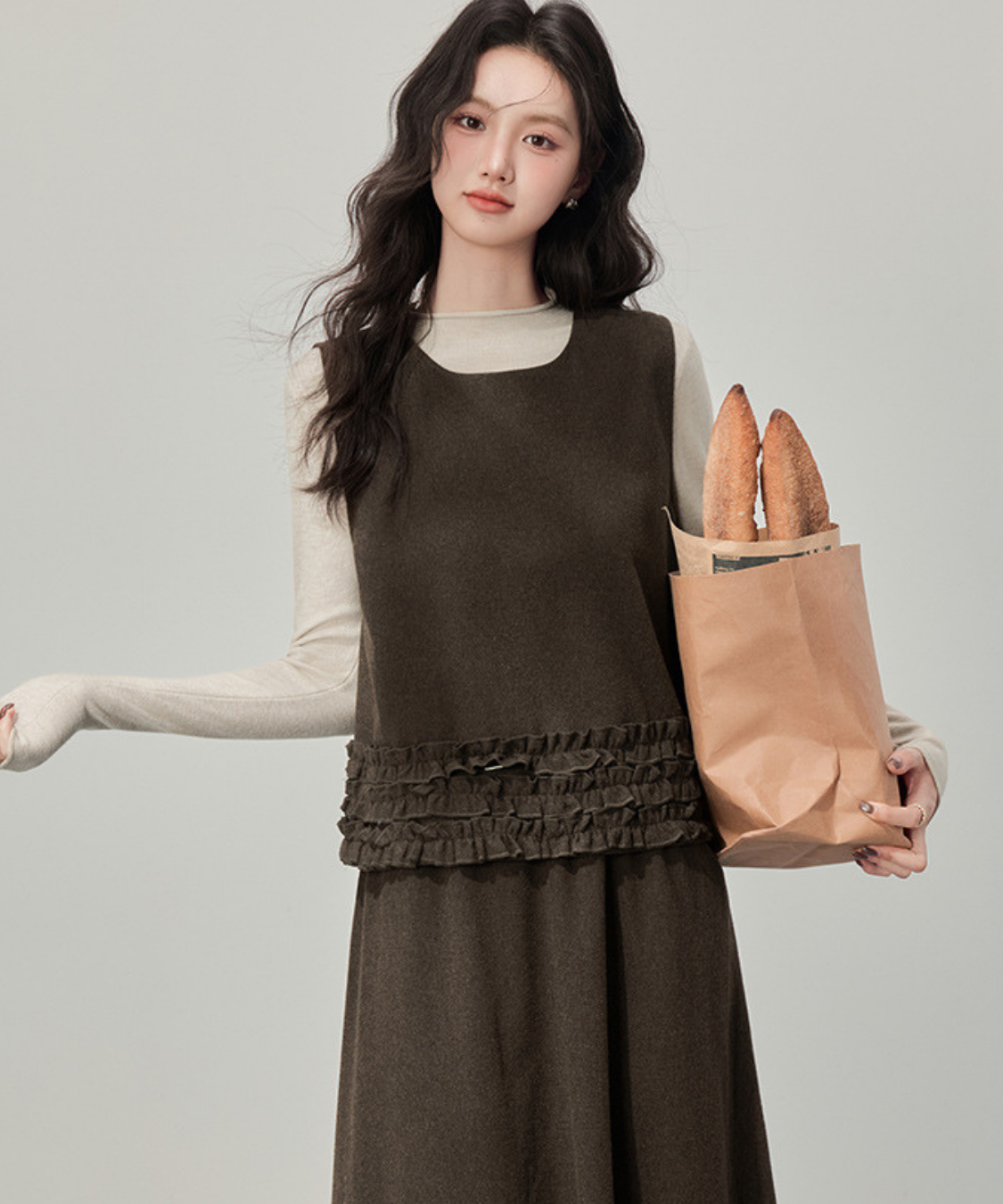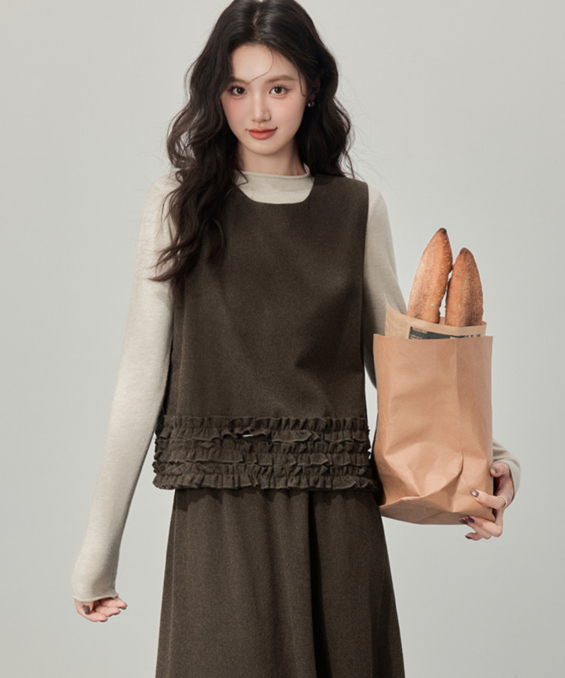フリルデザインベスト+カットソー+フロントフリルスカート 3点セット