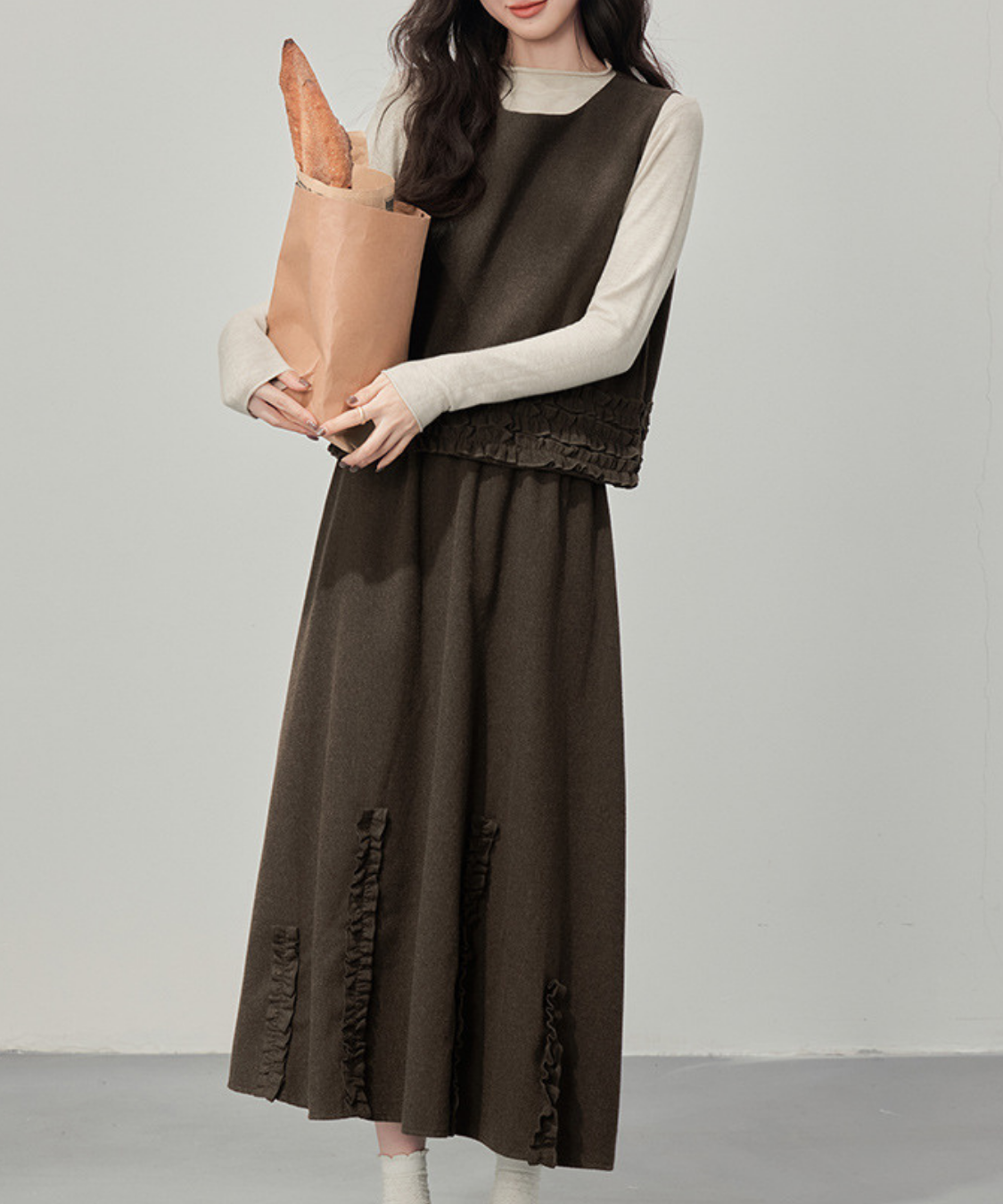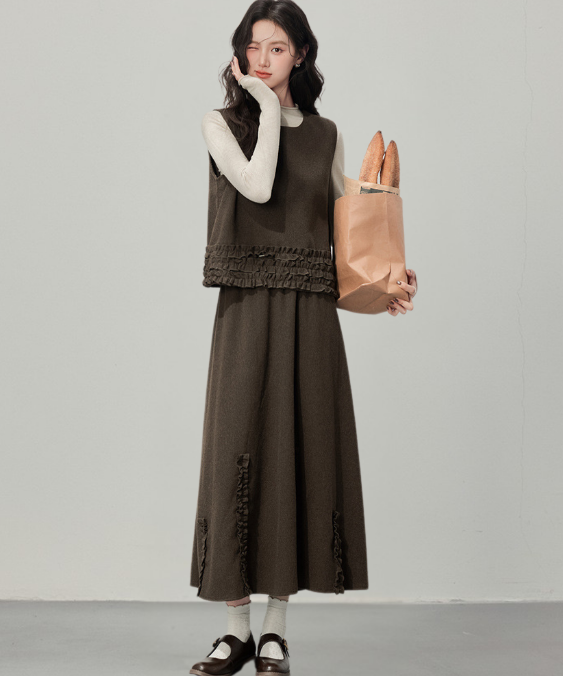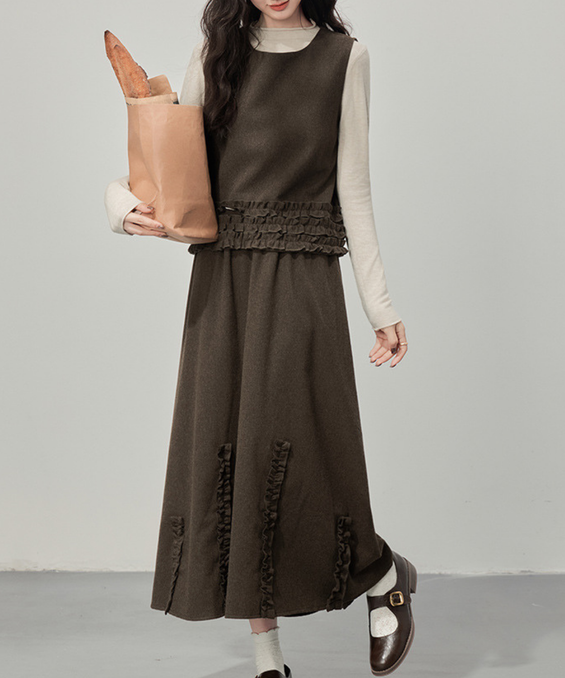 ナチュラルな雰囲気が魅力のフリル付きベストとスカートのセットアップです。