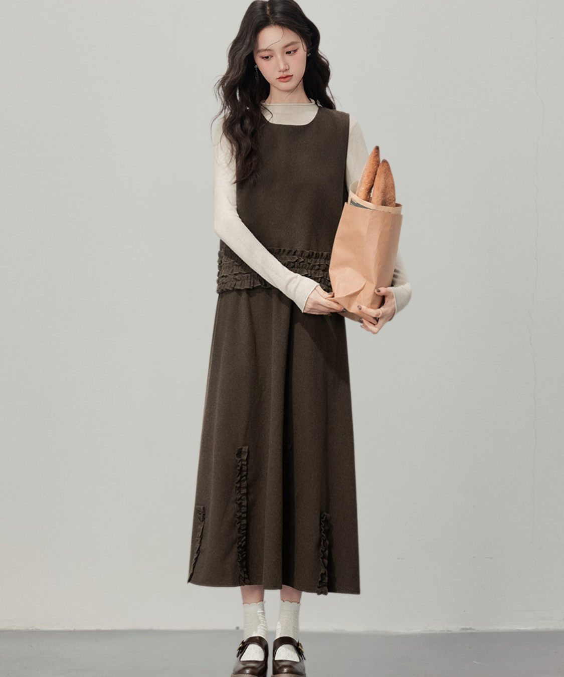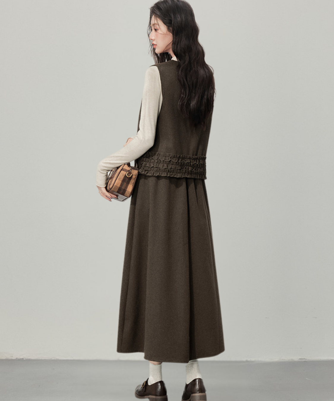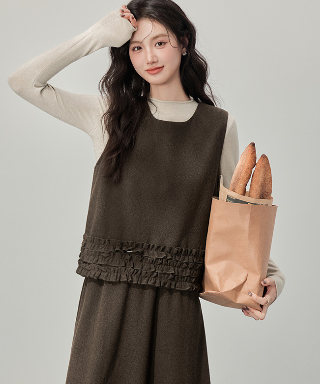ナチュラルな雰囲気が魅力のフリル付きベストとスカートのセットアップです。