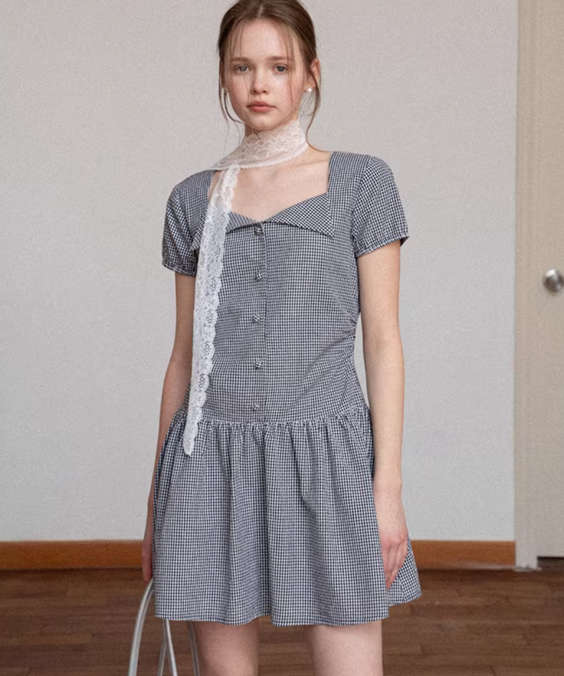 チョーカーやベルトにフリルを合わせた甘辛テイストな1着◎