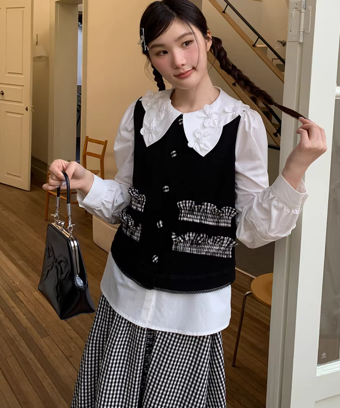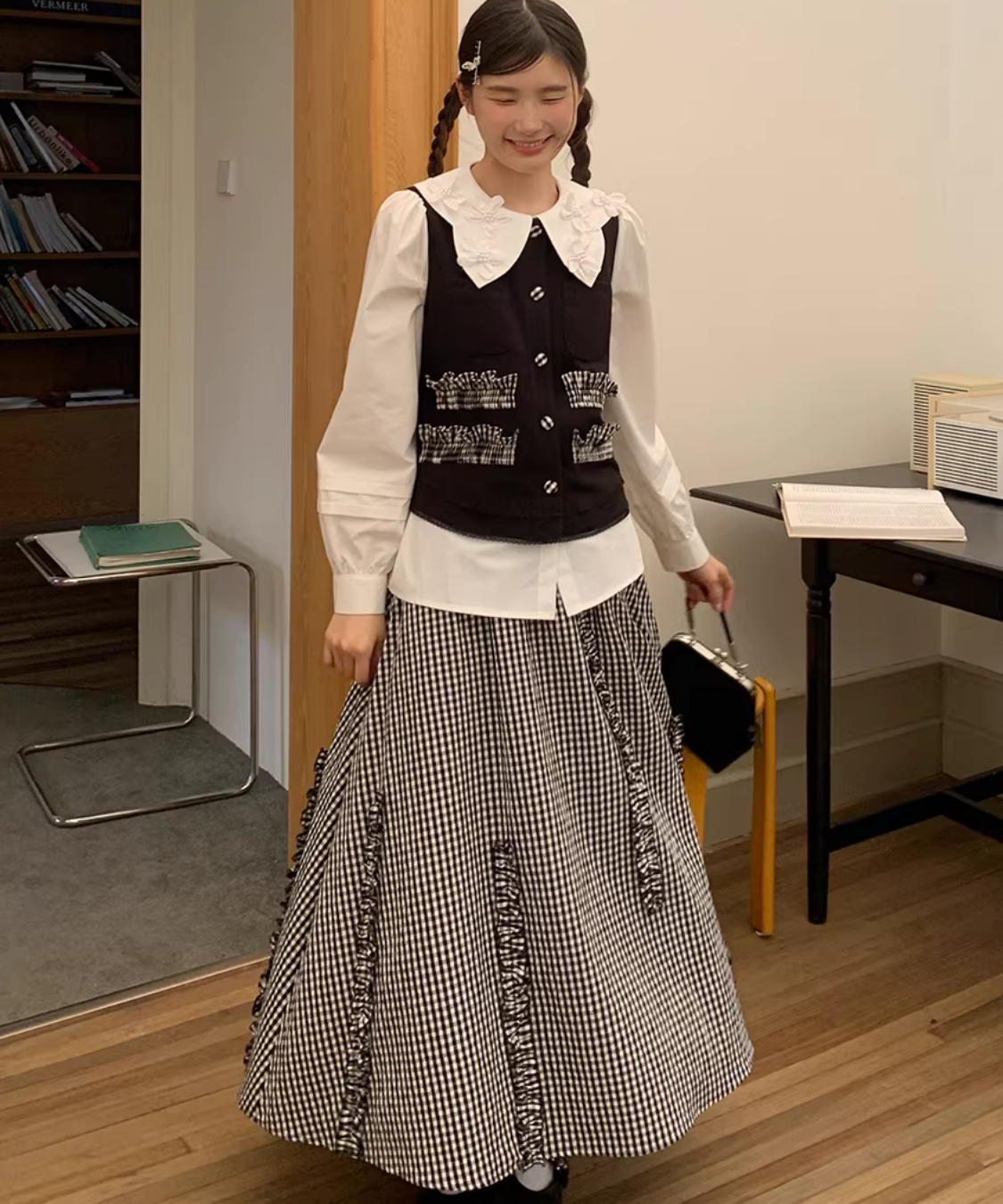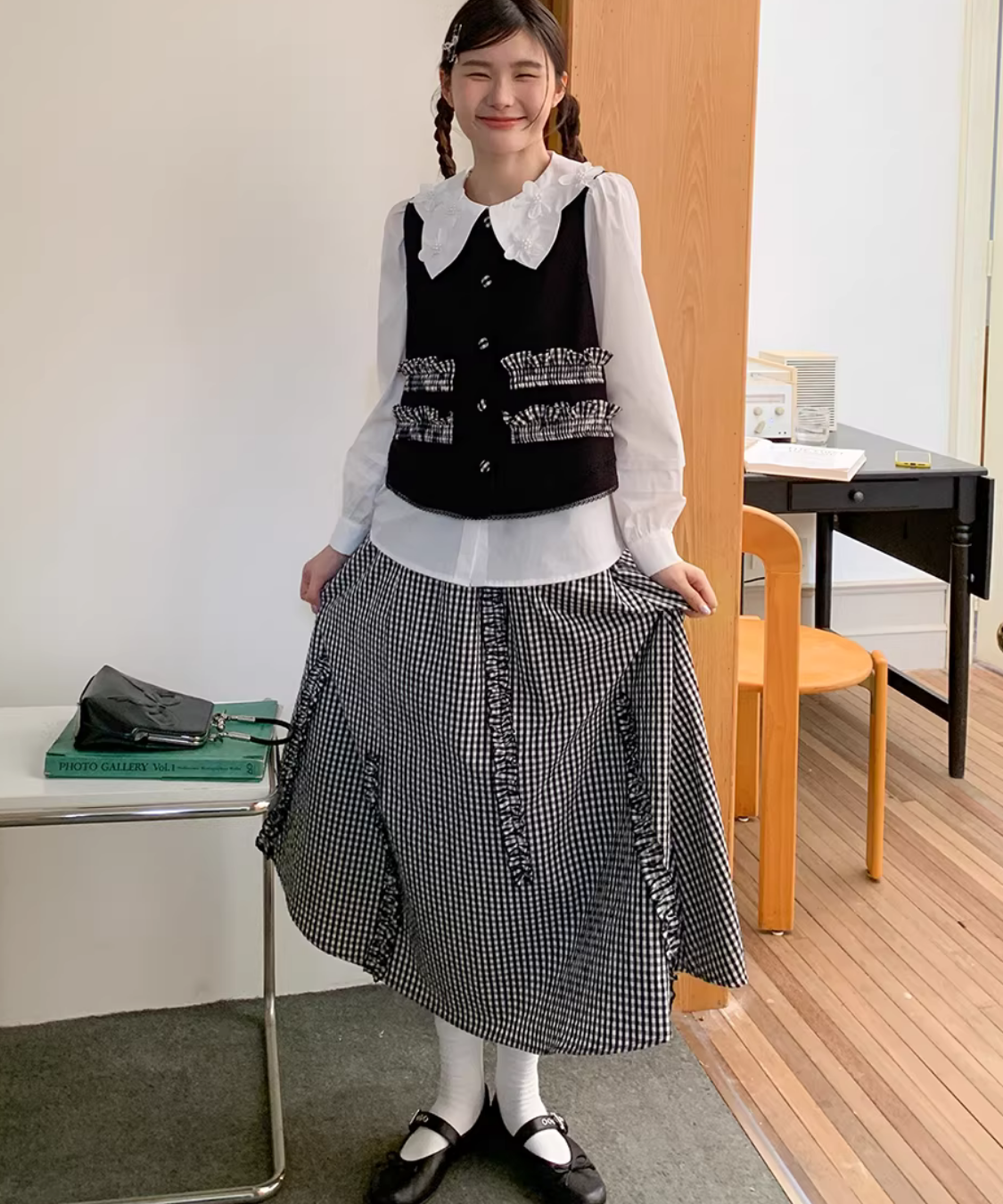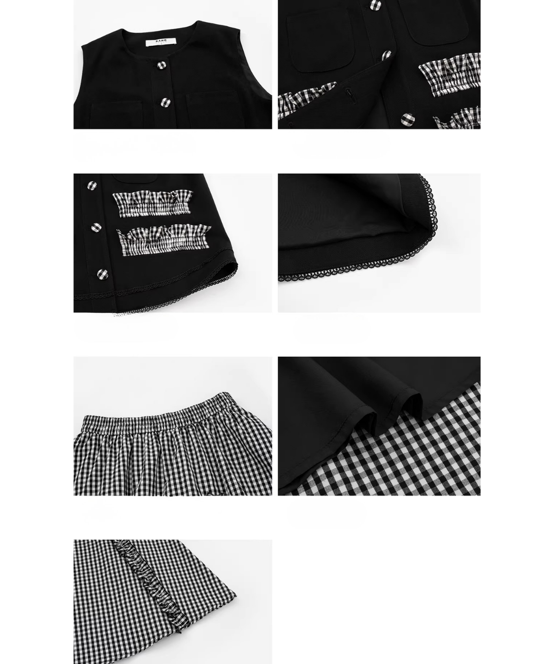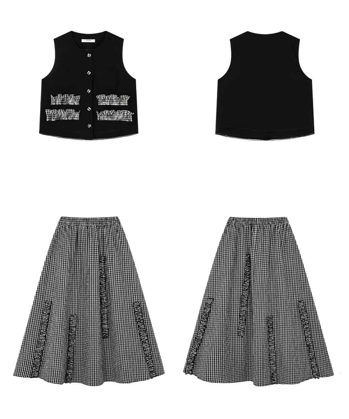 配色フリルデザインベスト+ギンガムチェックフリンジ切り替えスカート 2点セット