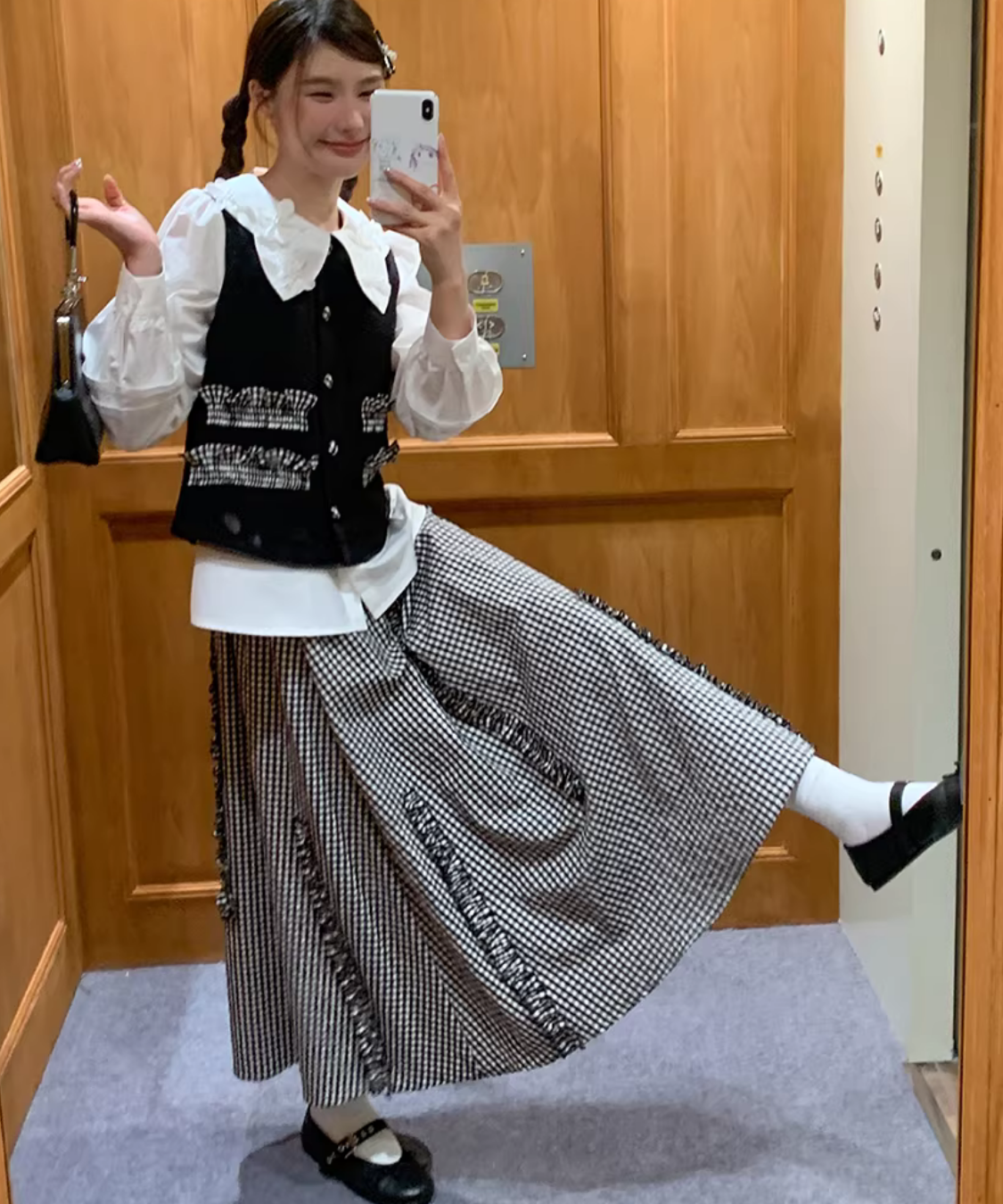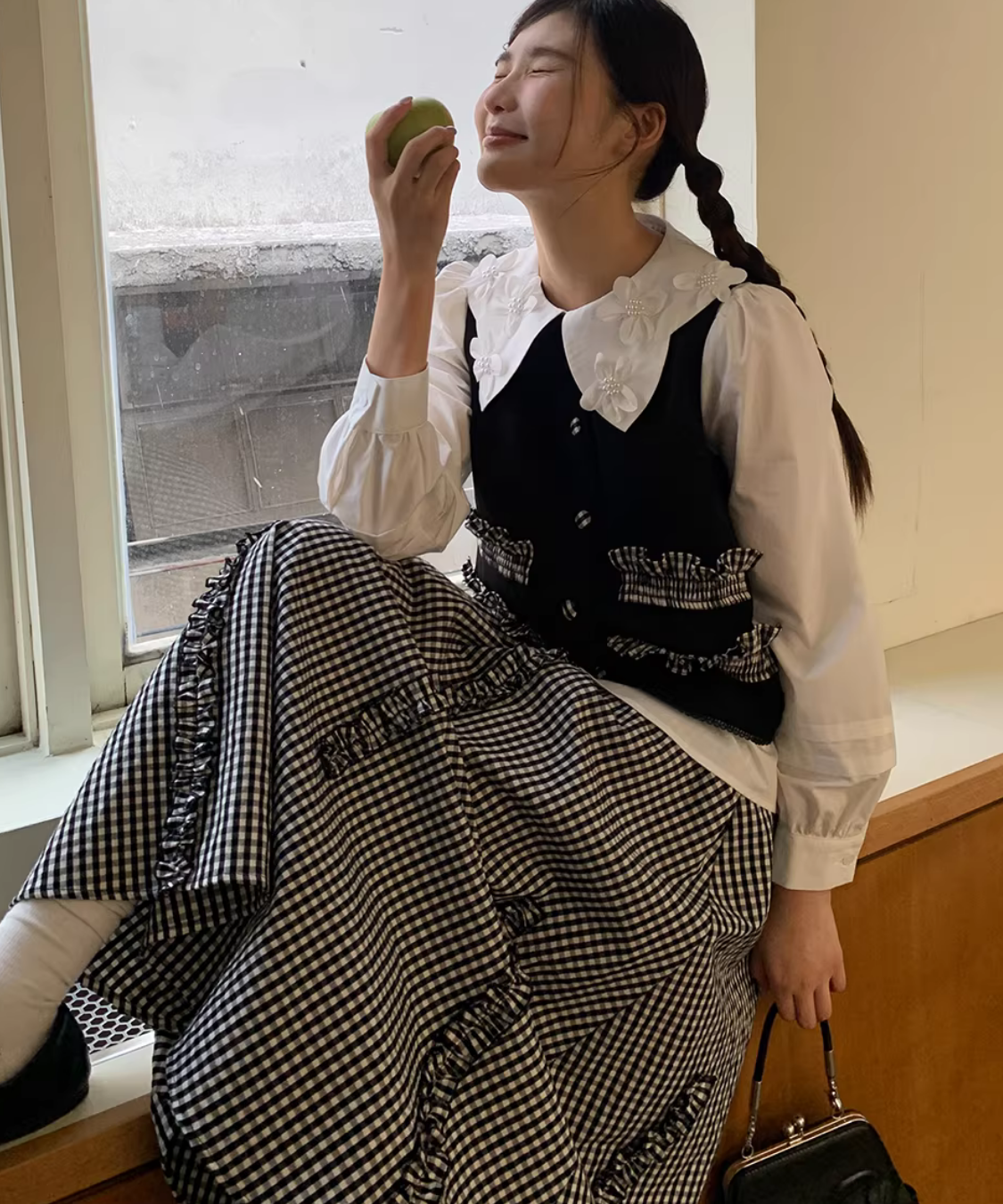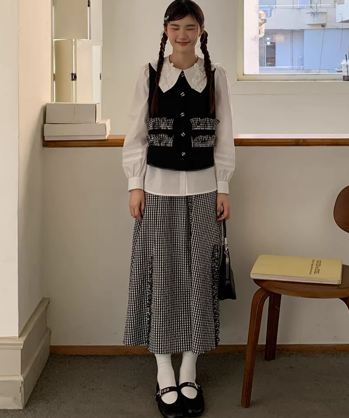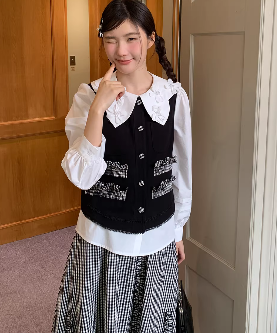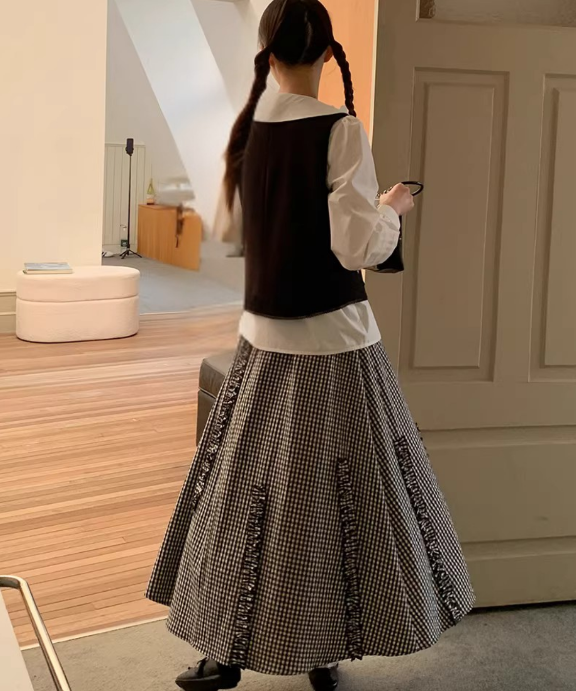 配色フリルデザインベスト+ギンガムチェックフリンジ切り替えスカート 2点セット