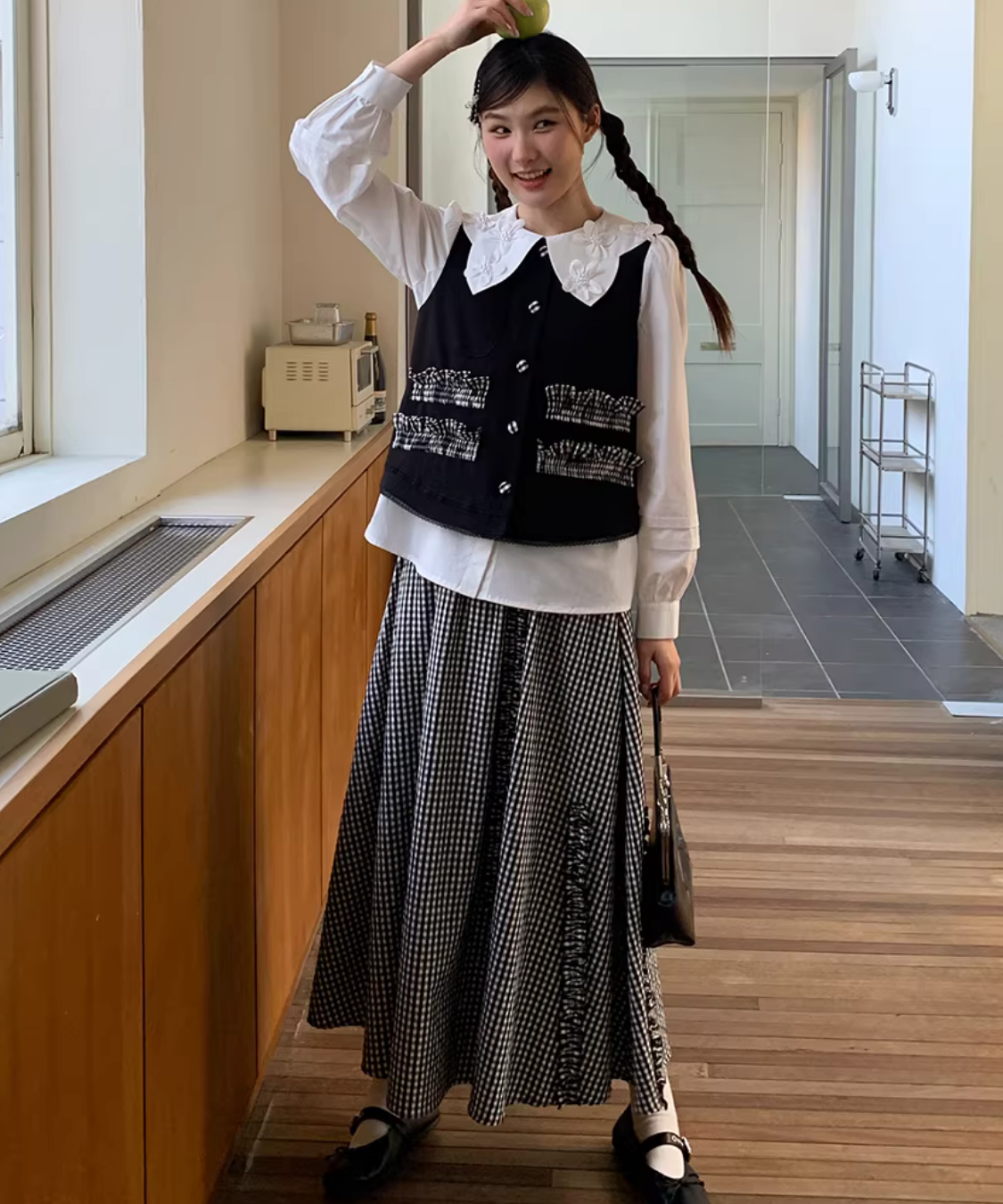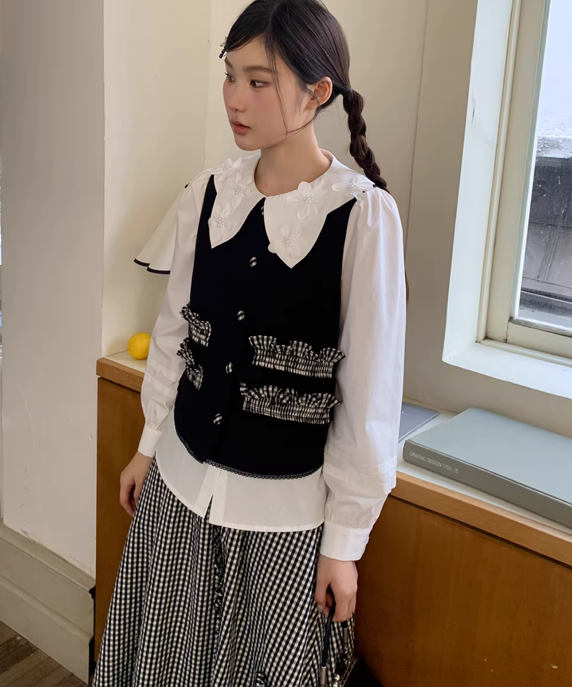 配色フリルがアクセントになるベストとギンガム切り替えスカートの、着映えする2点セットです。