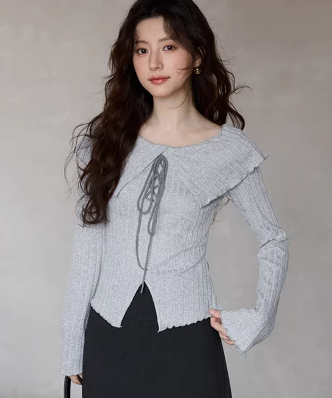 きちんとしたシーンやオフィスにもおすすめな綺麗めニットトップスです。