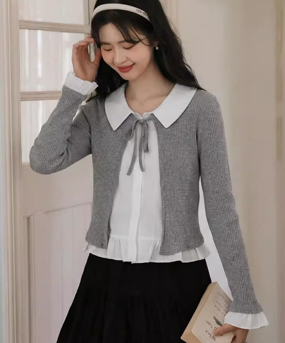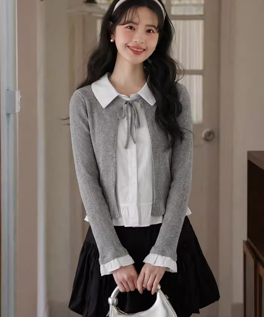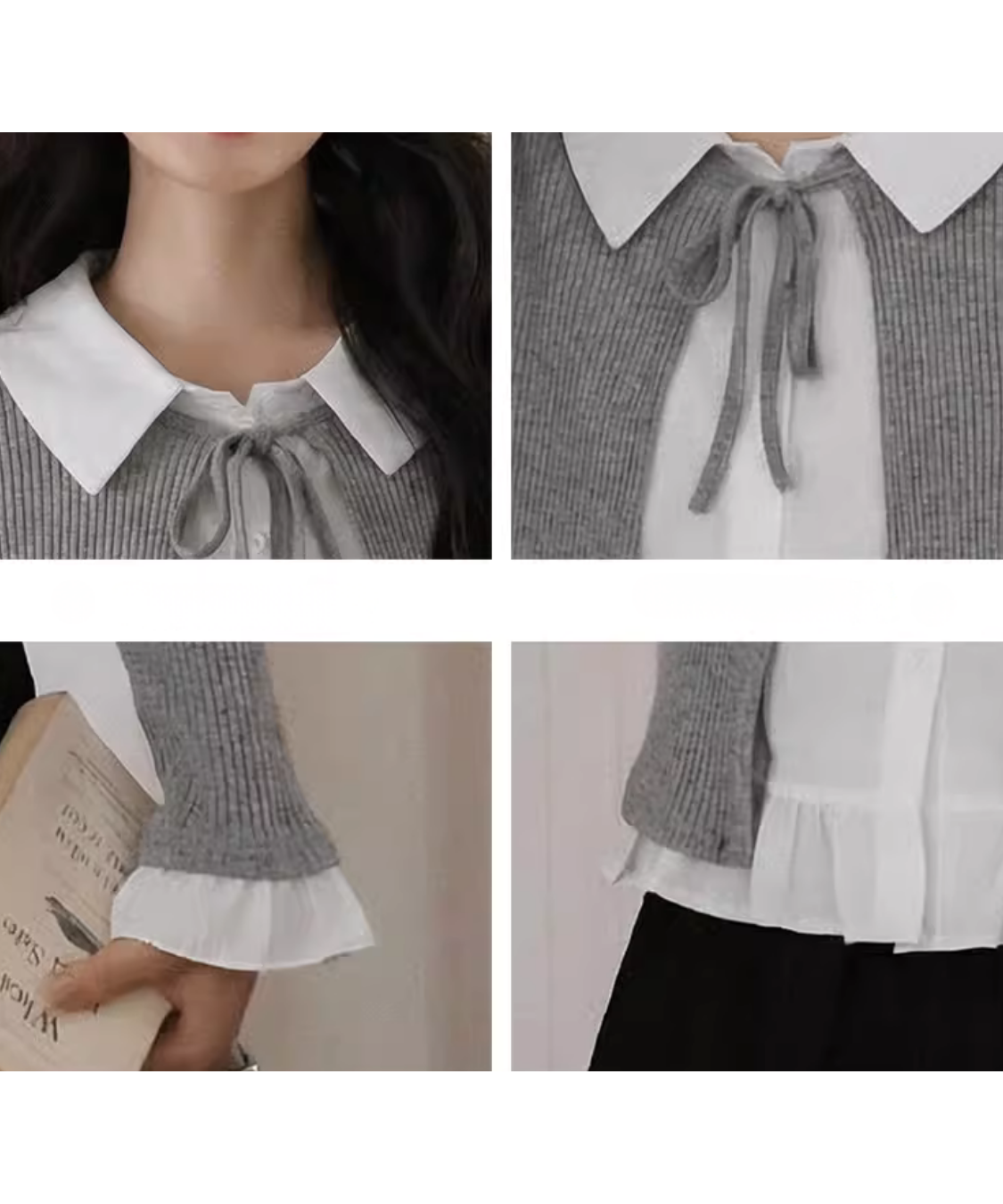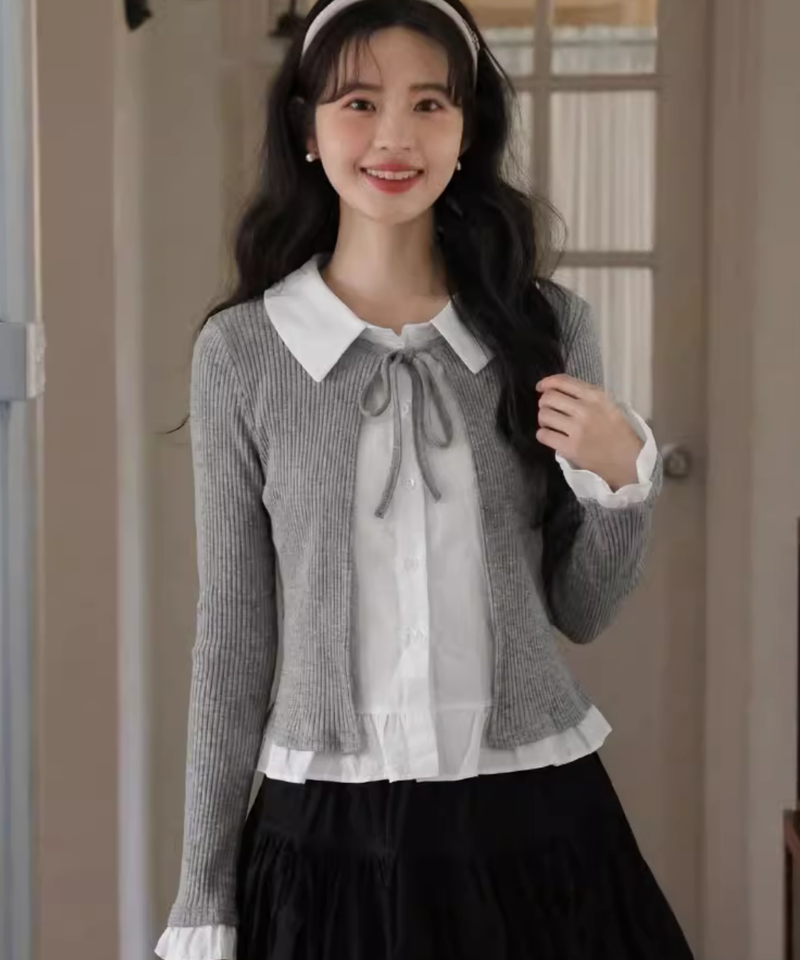 シャツにカーディガンを重ねたようなフェイクレイヤードで、これ一枚でコーデが整うトップスです。