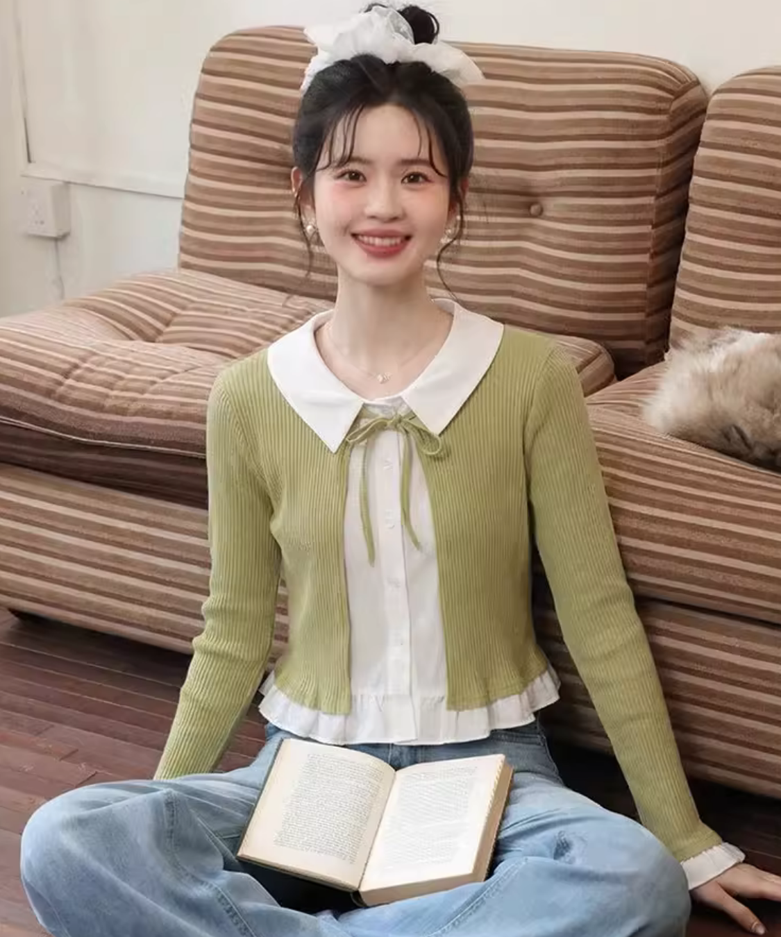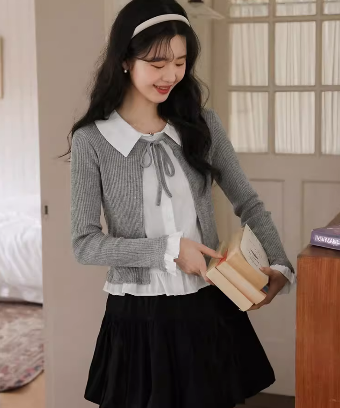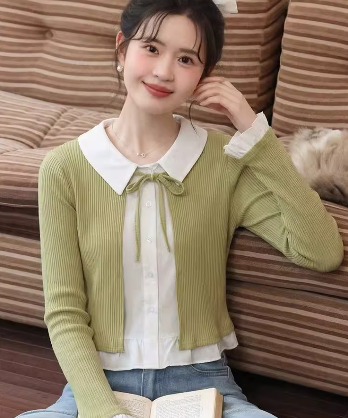 シャツにカーディガンを重ねたようなフェイクレイヤードで、これ一枚でコーデが整うトップスです。
