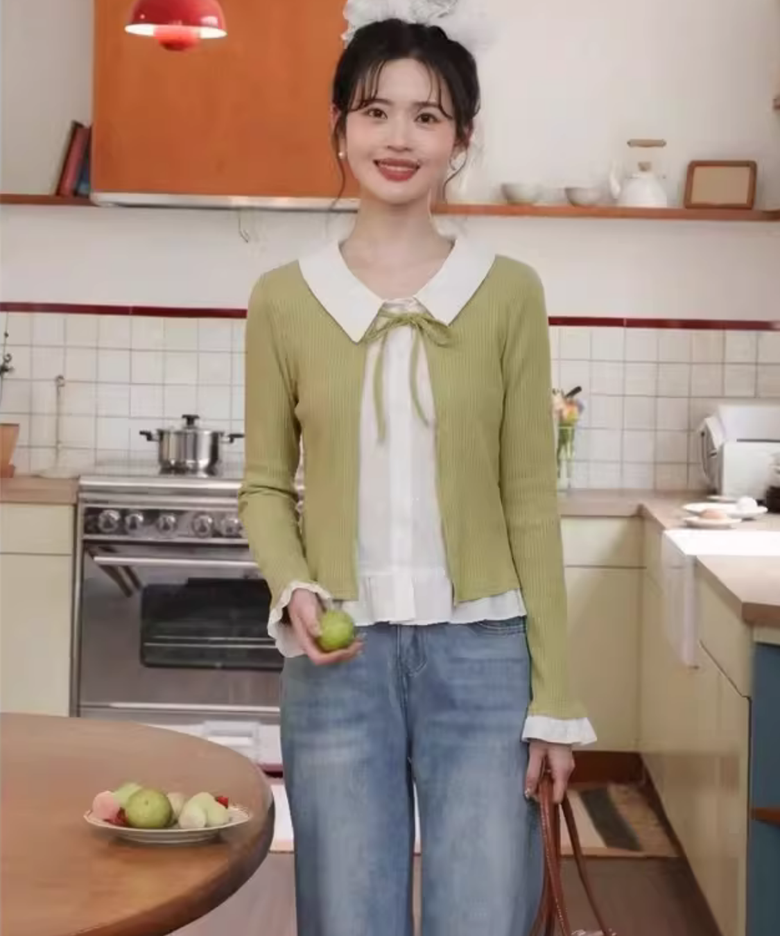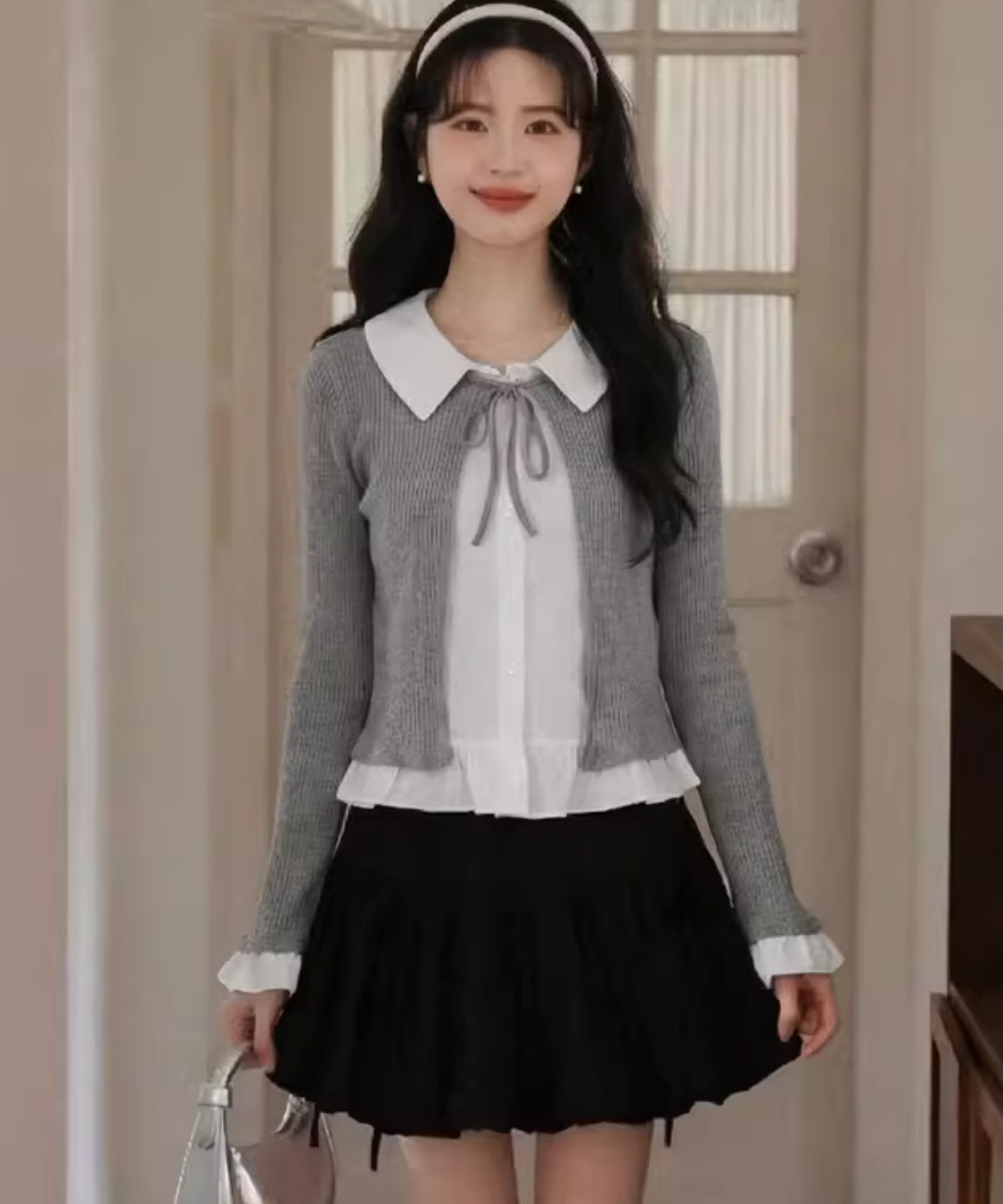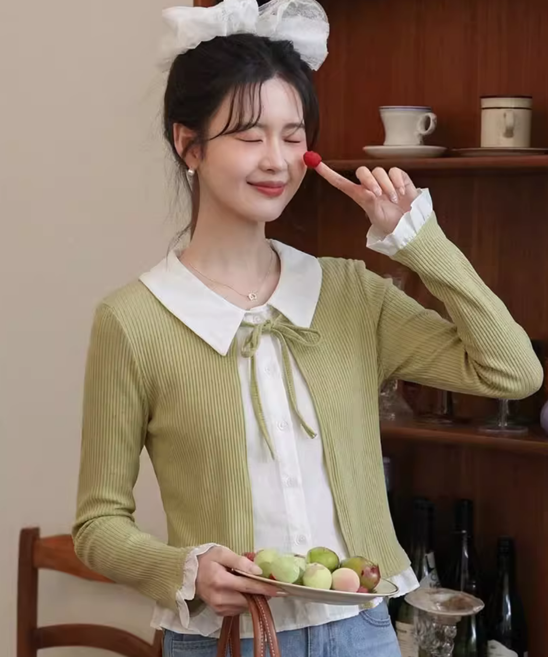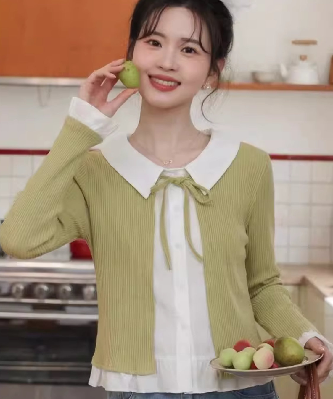 シャツにカーディガンを重ねたようなフェイクレイヤードで、これ一枚でコーデが整うトップスです。