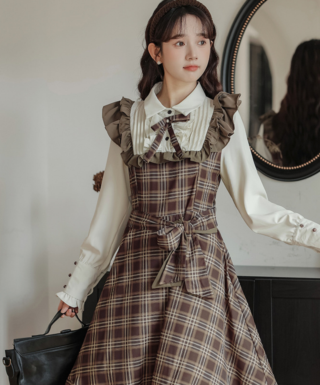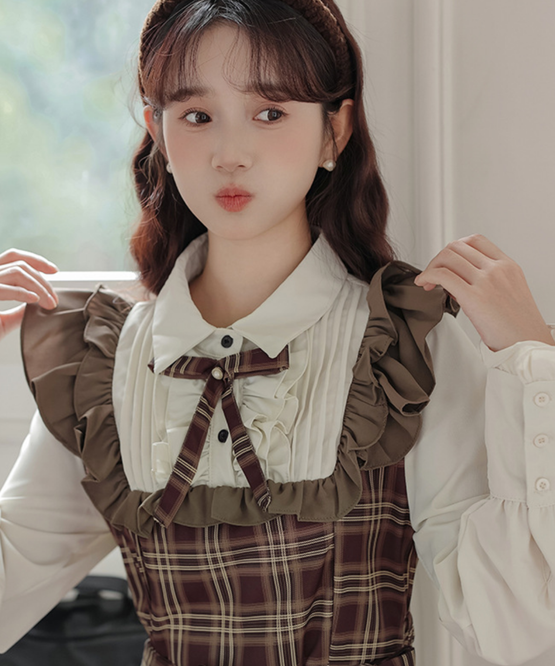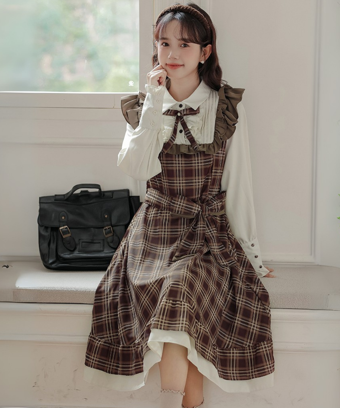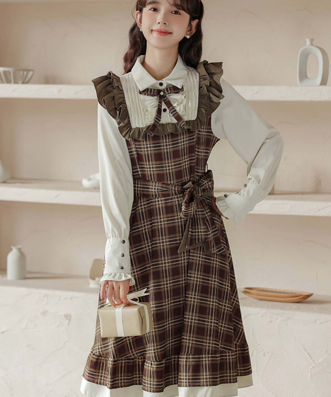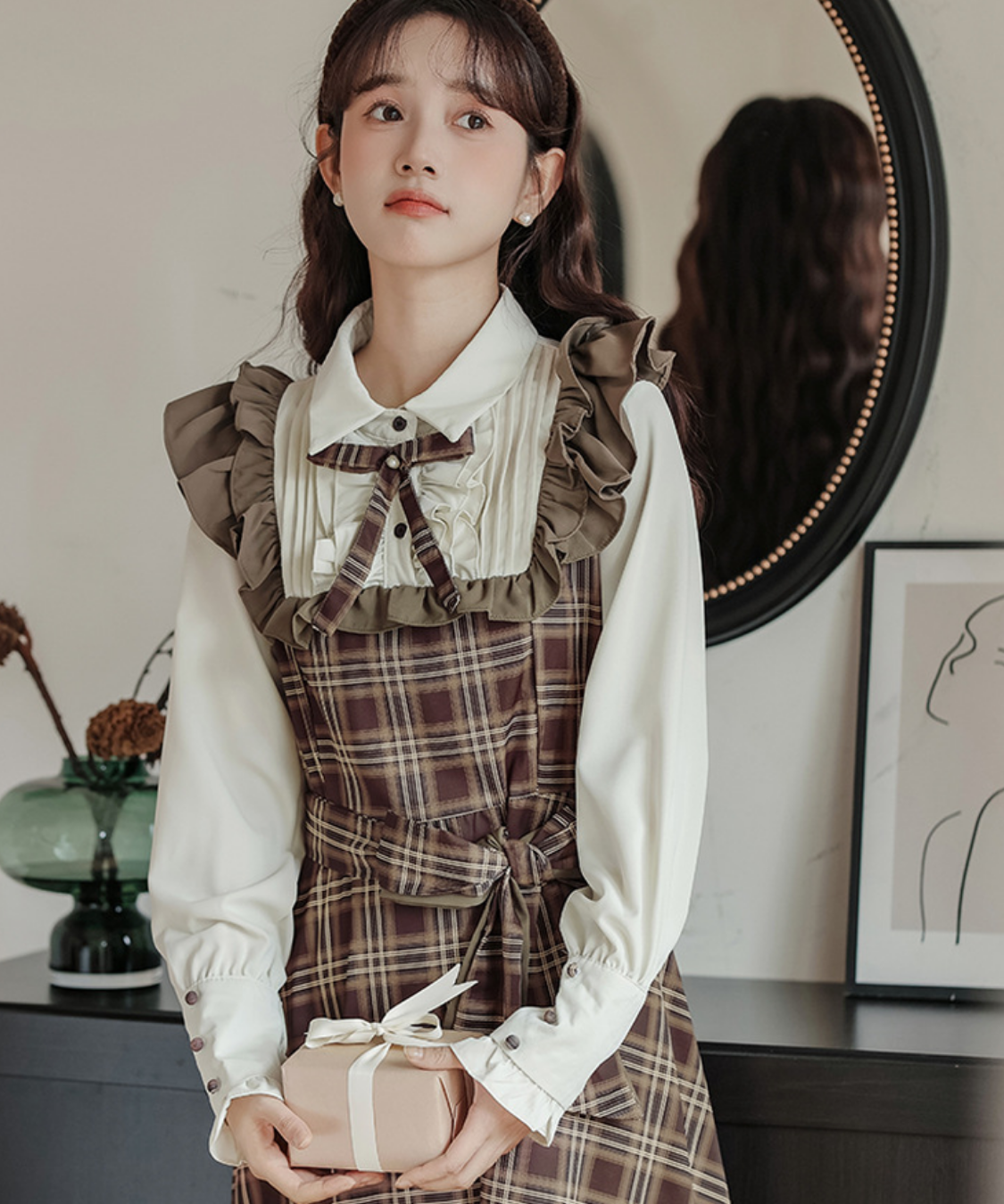 フリルたっぷりのブラウスとチェック柄ジャンスカが一緒になったドッキングワンピースです。
