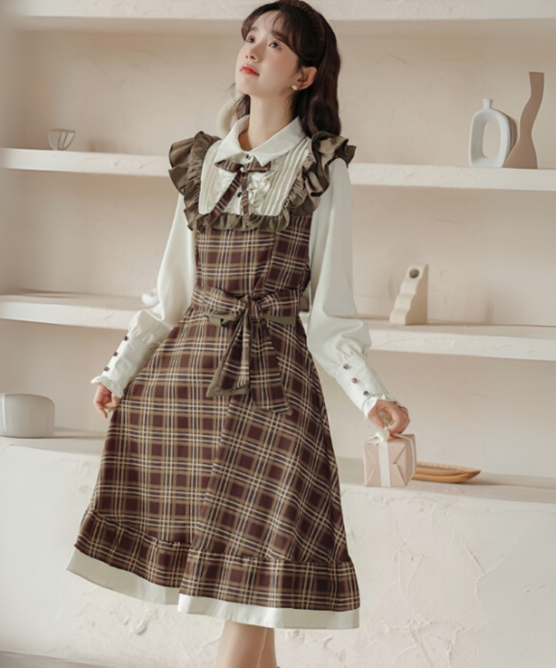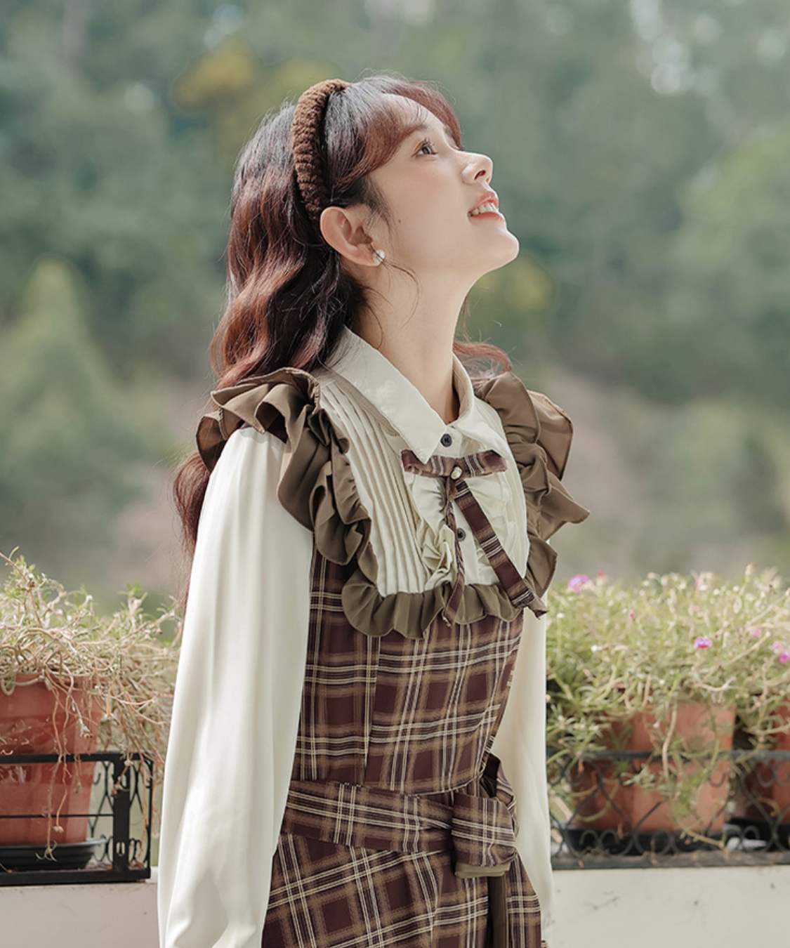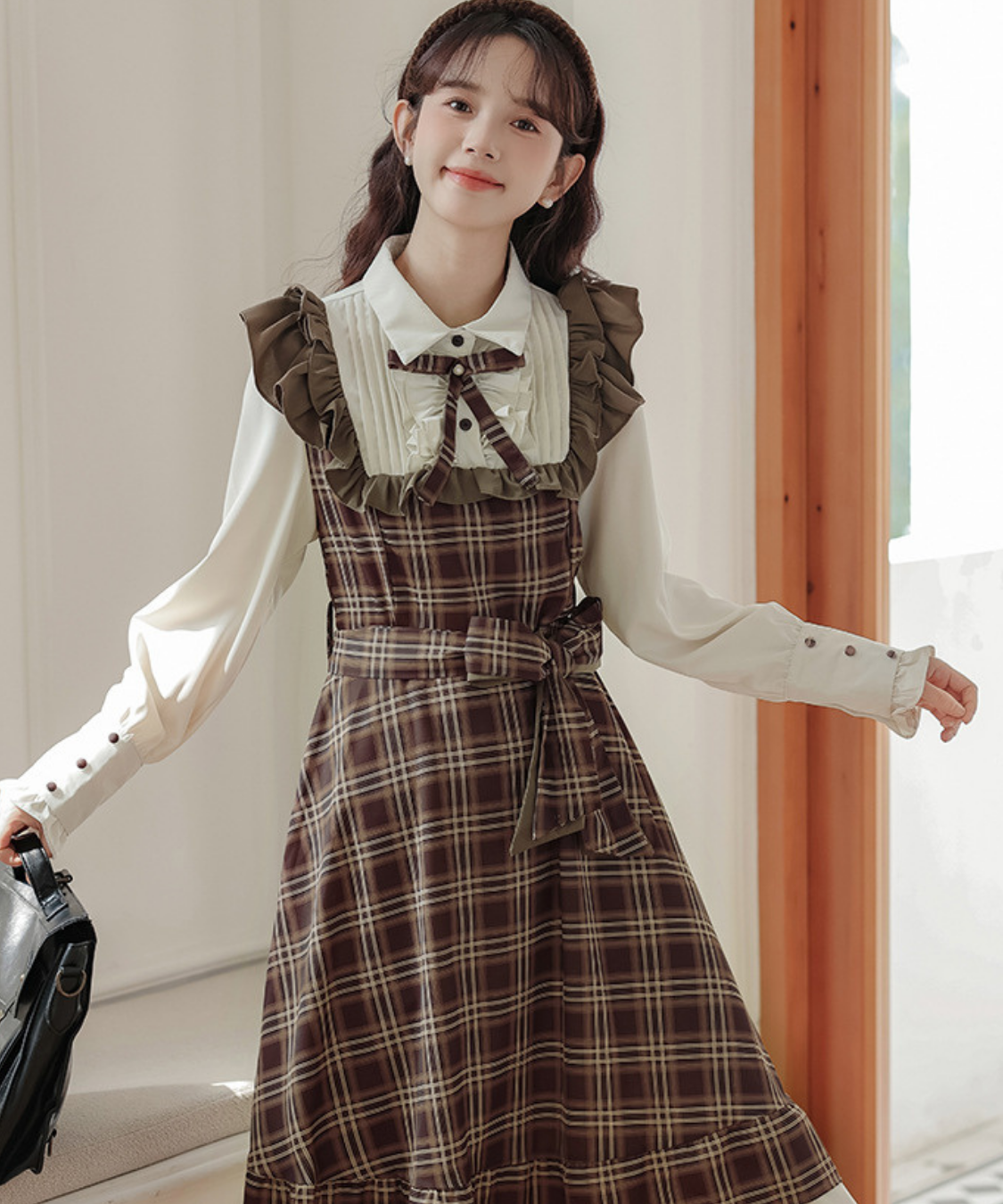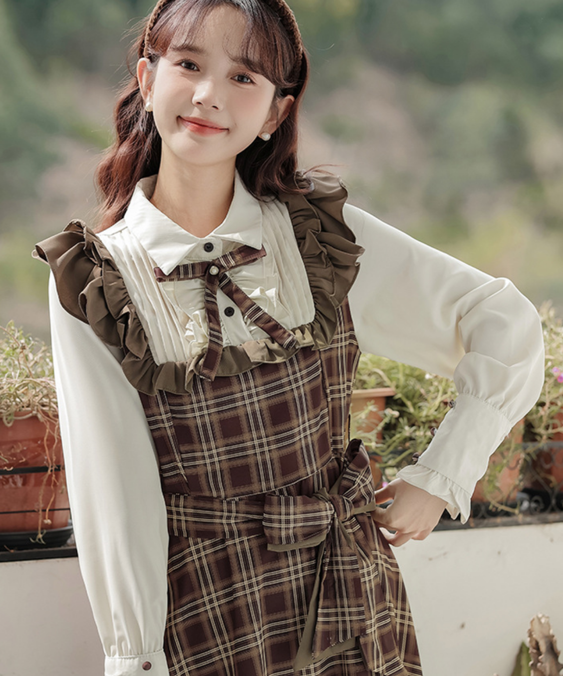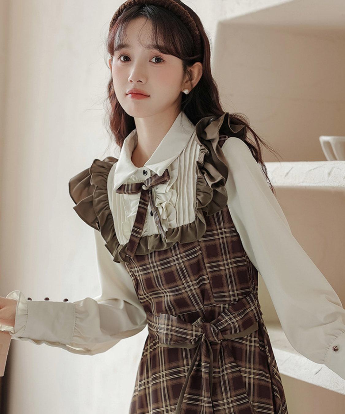 フリルたっぷりのブラウスとチェック柄ジャンスカが一緒になったドッキングワンピースです。