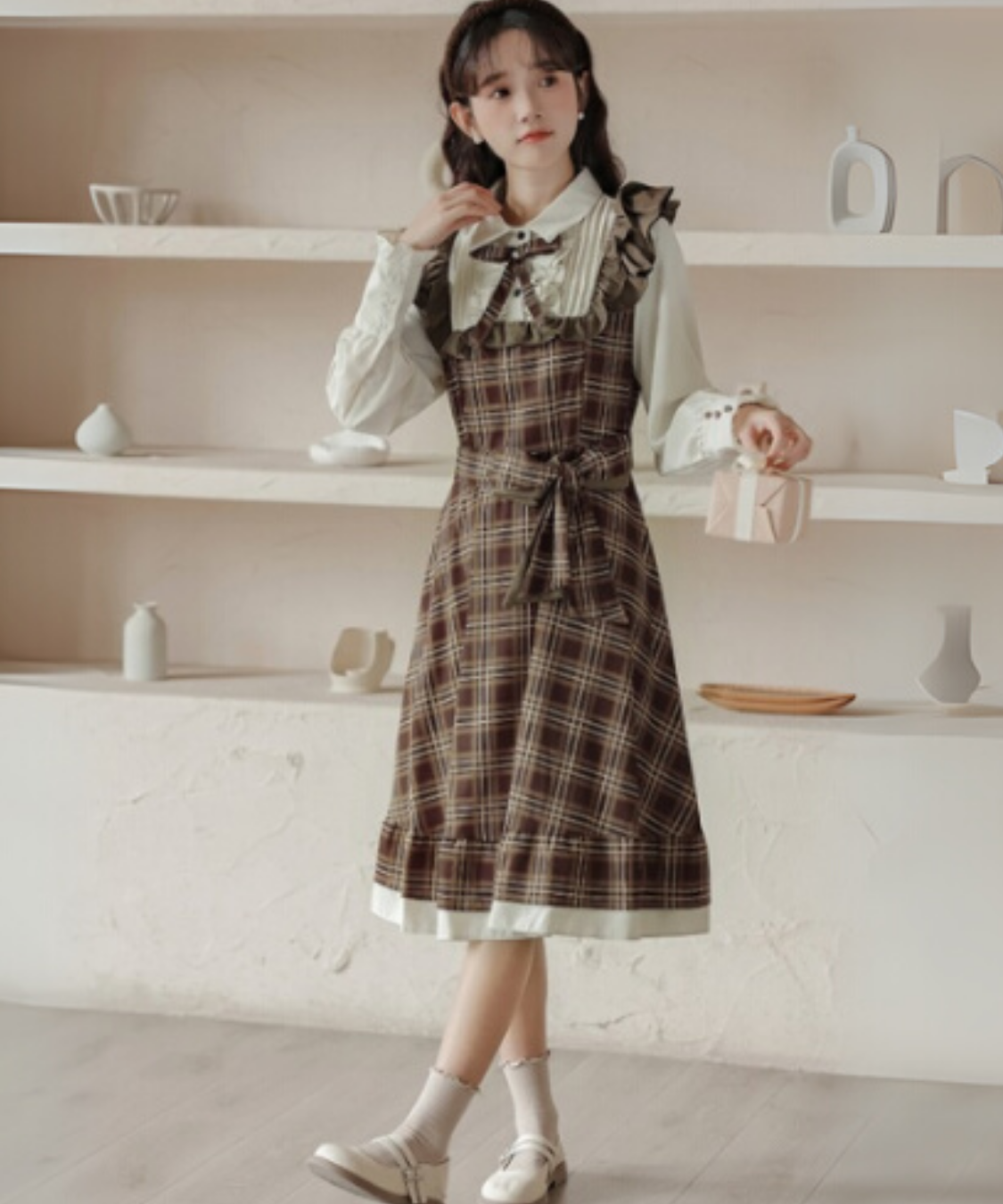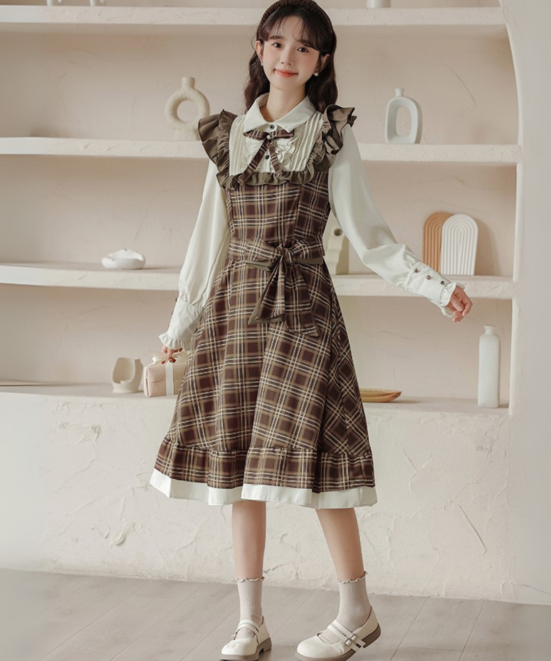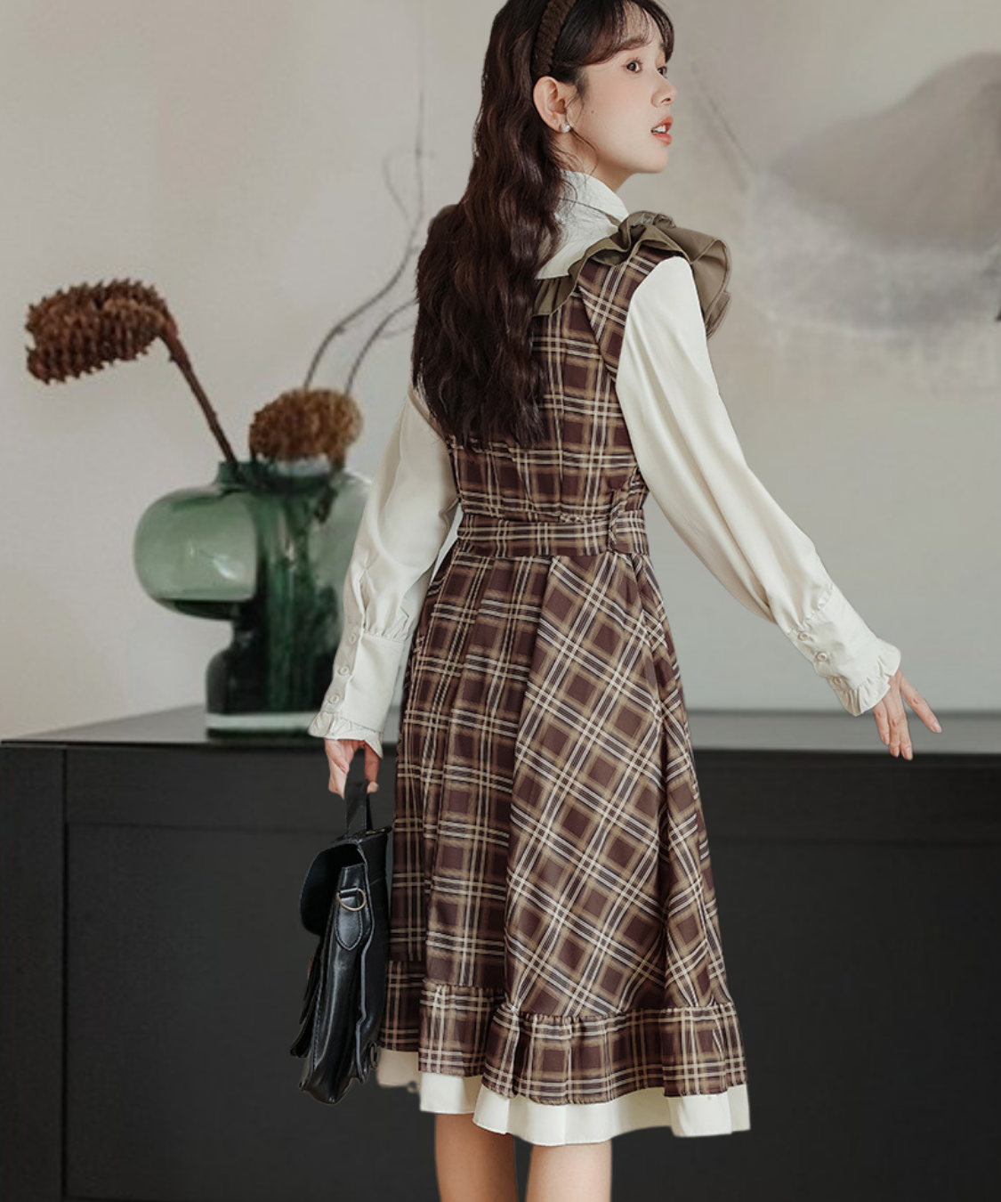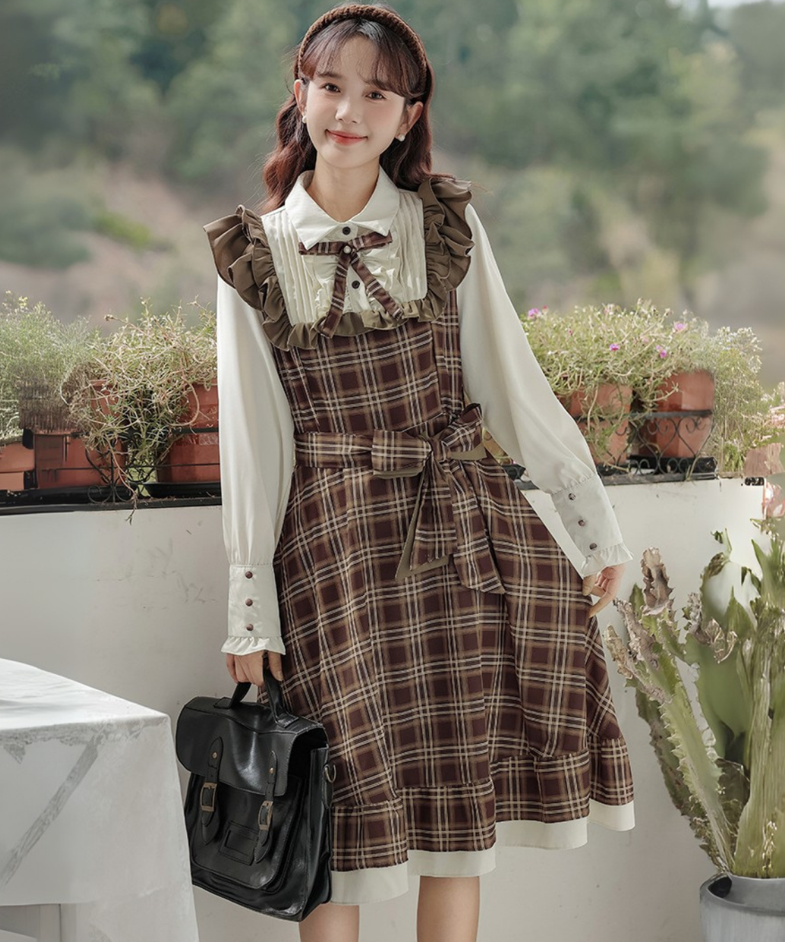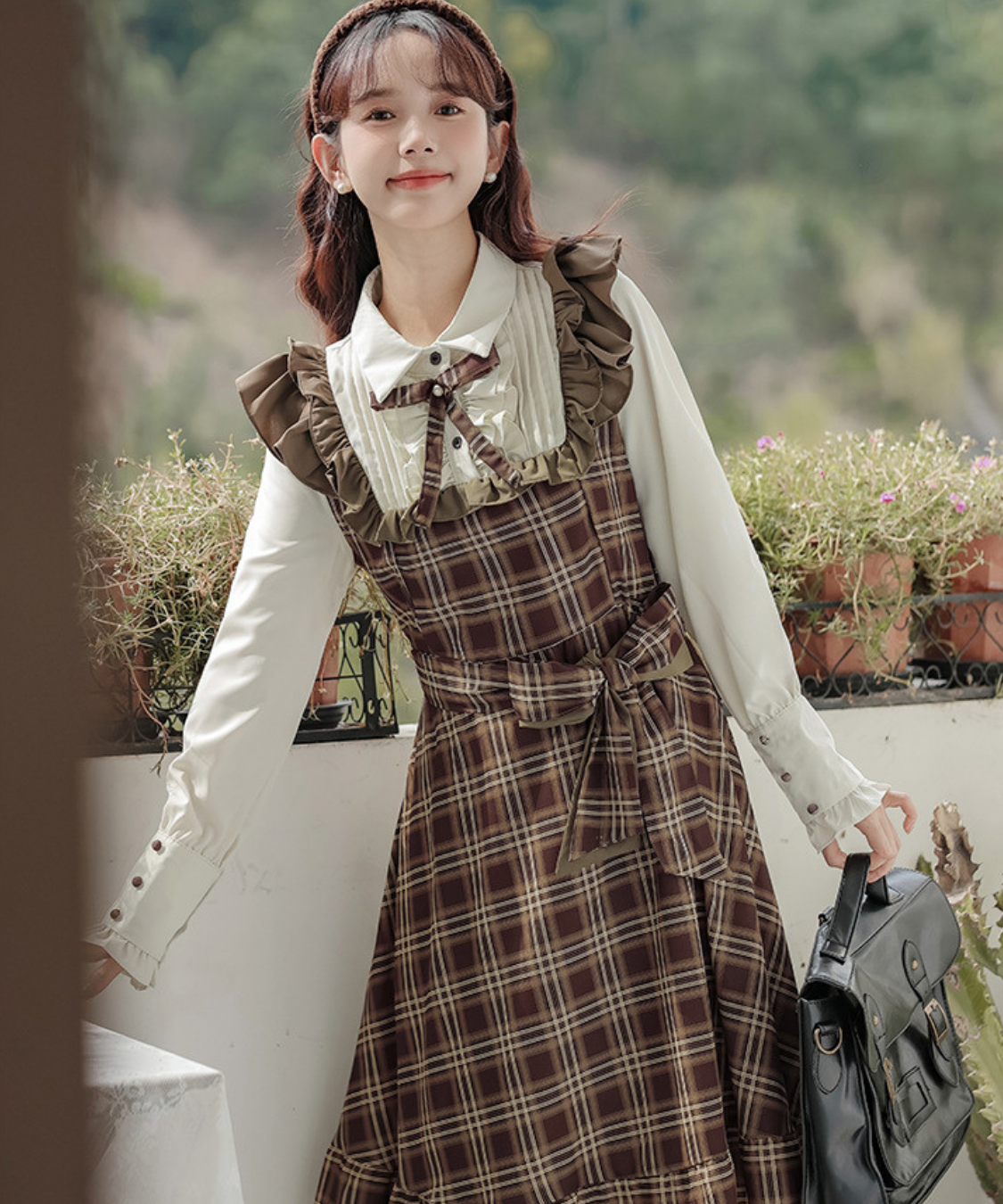 フリルたっぷりのブラウスとチェック柄ジャンスカが一緒になったドッキングワンピースです。