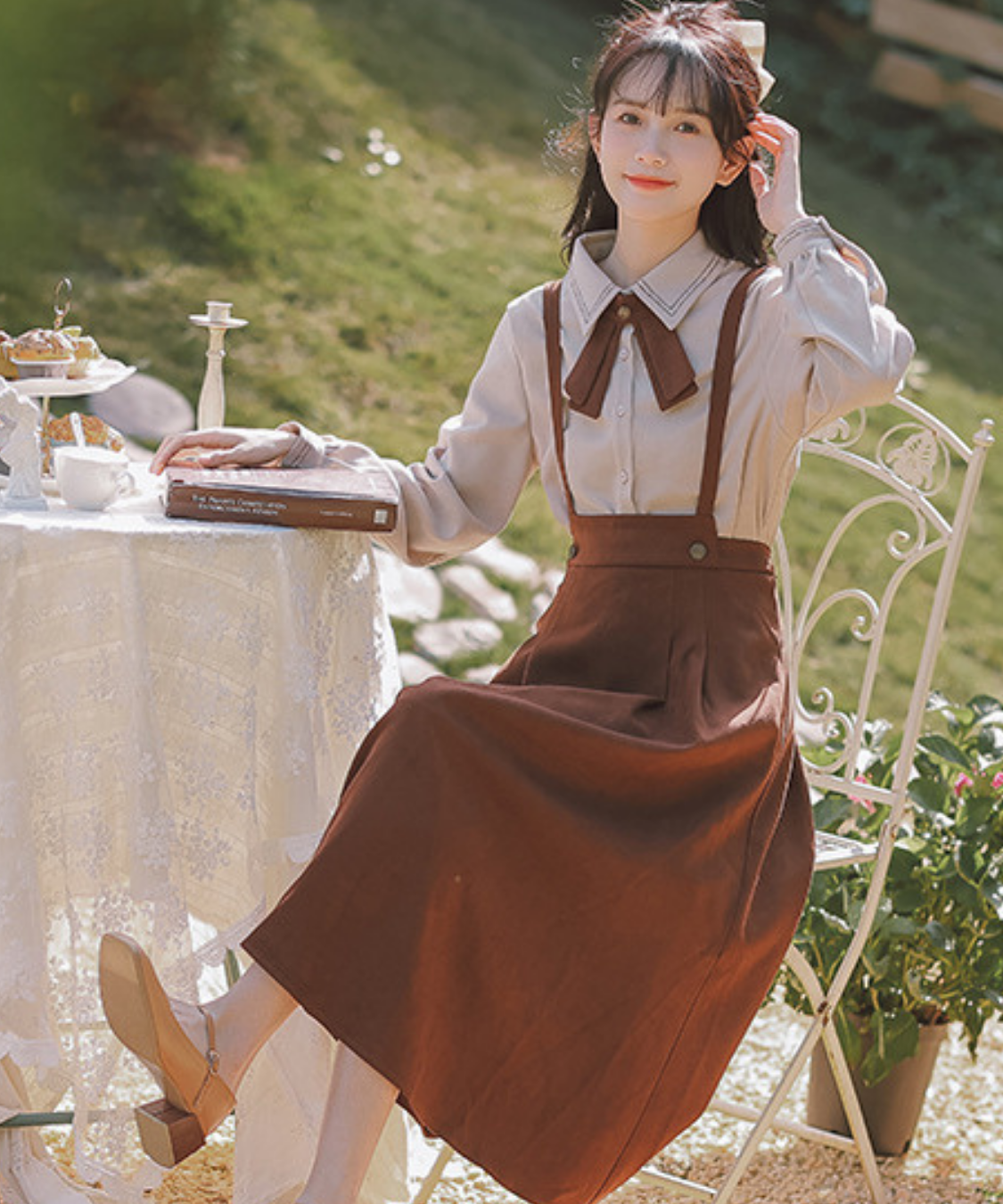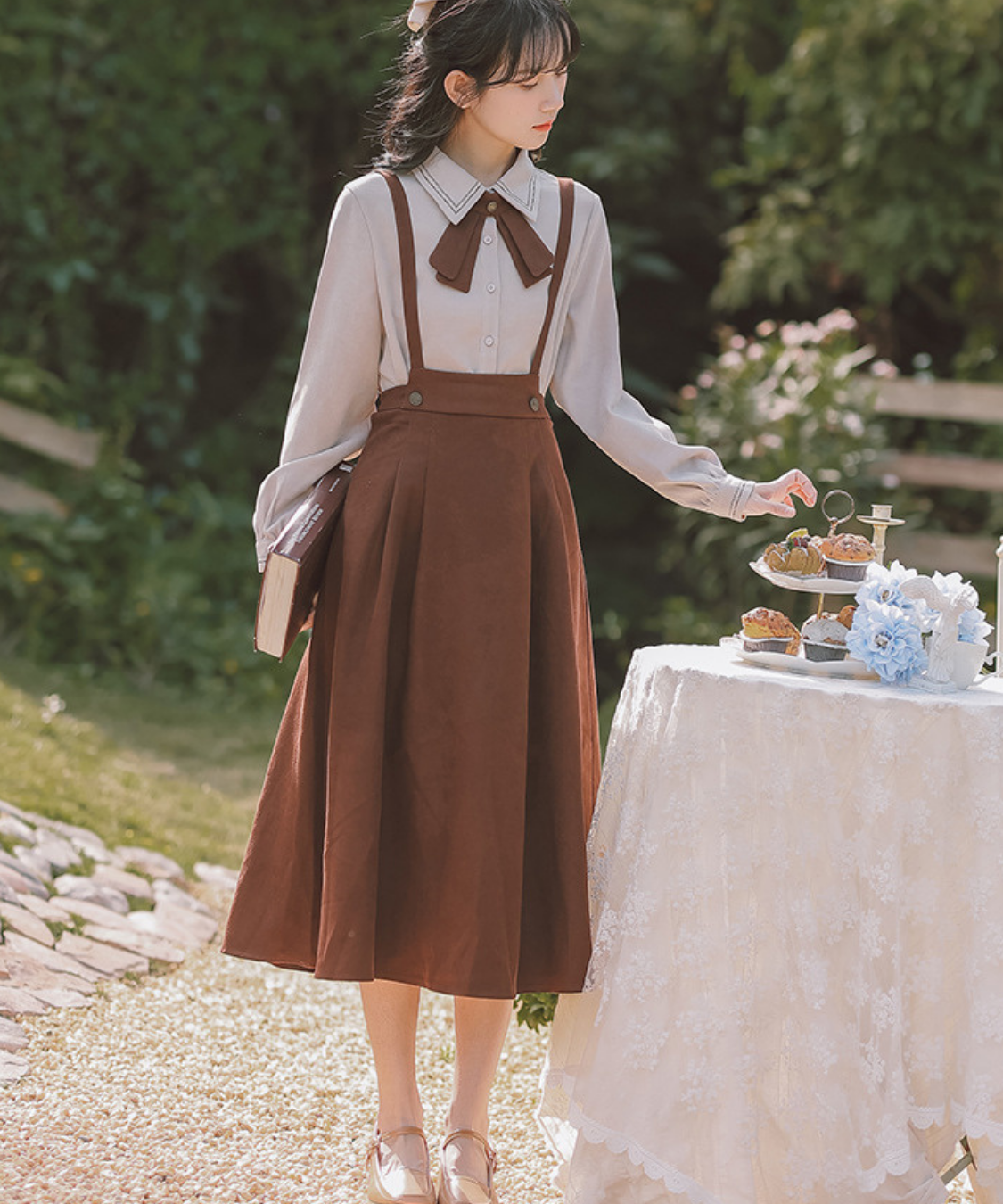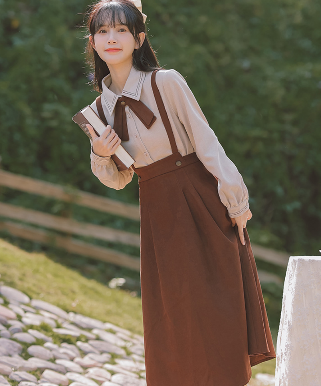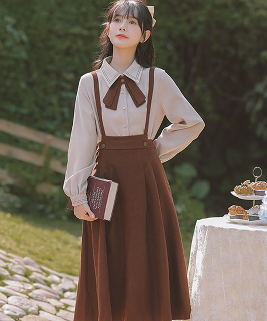 配色リボンが目を惹くクラシカルなブラウスと、上品なサスペンダースカートのセットです。