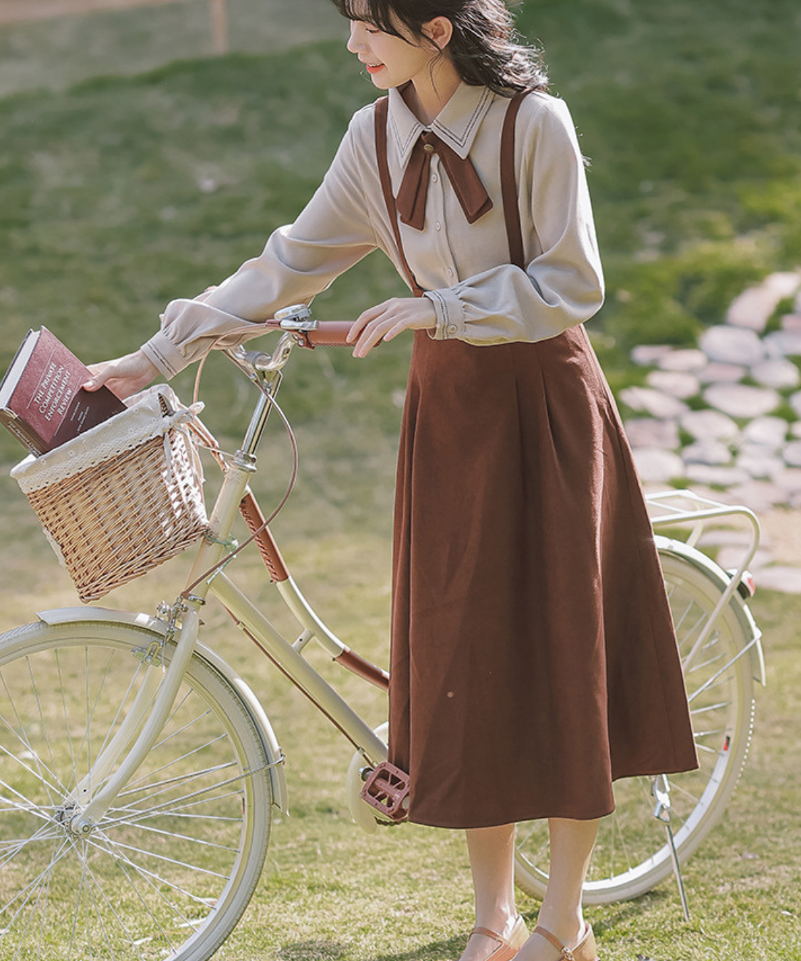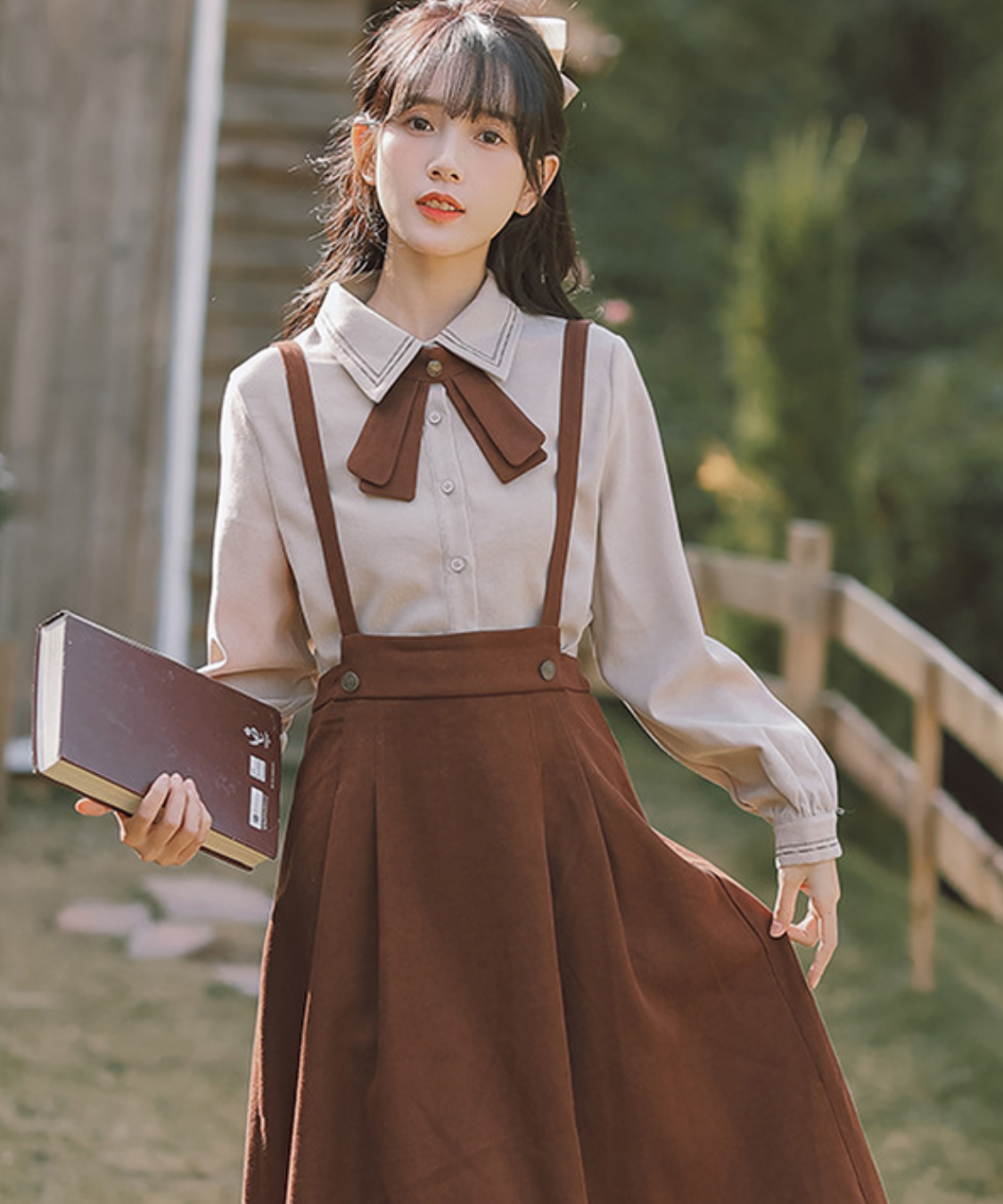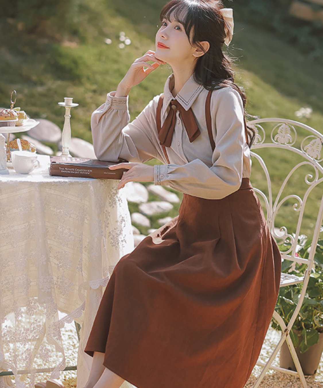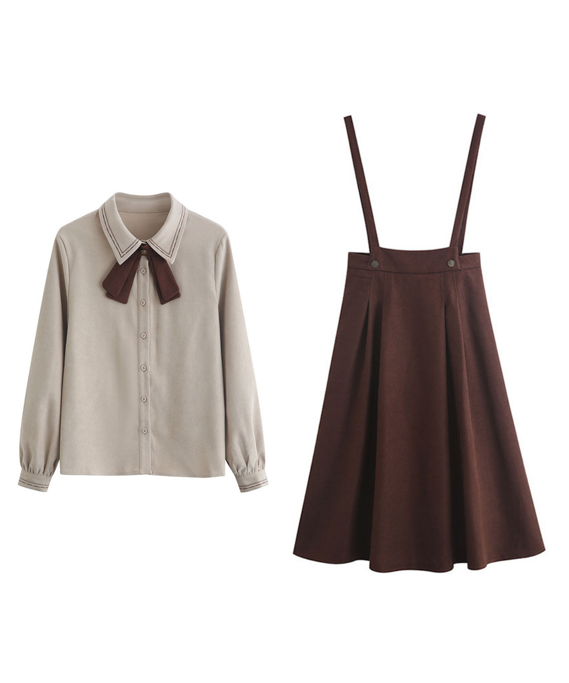 配色リボンが目を惹くクラシカルなブラウスと、上品なサスペンダースカートのセットです。