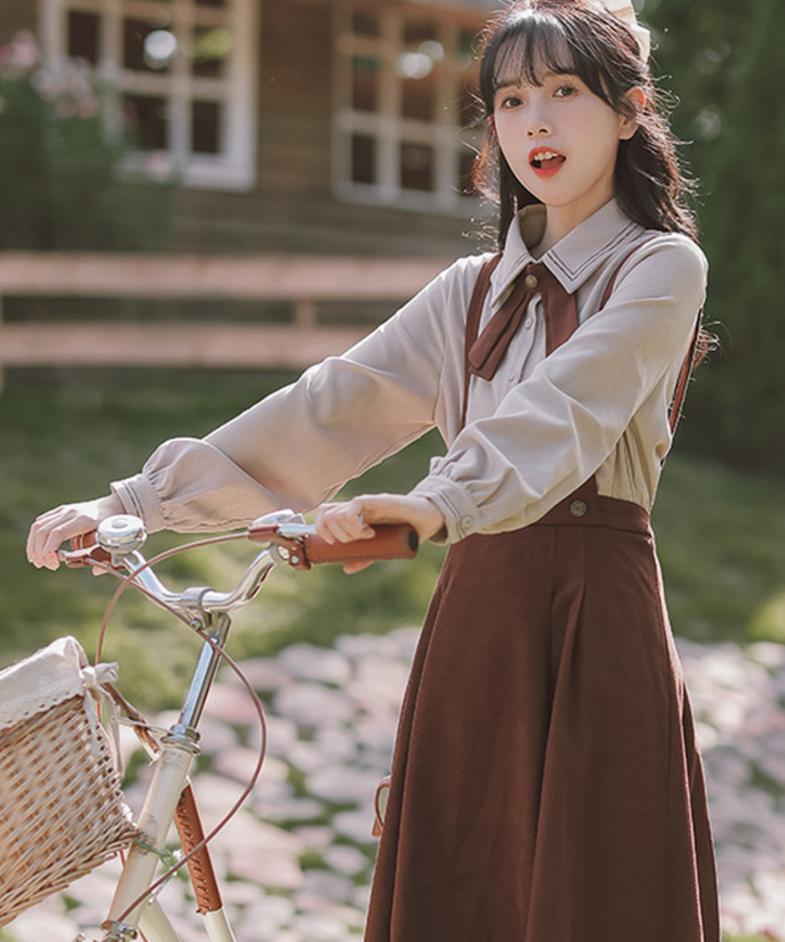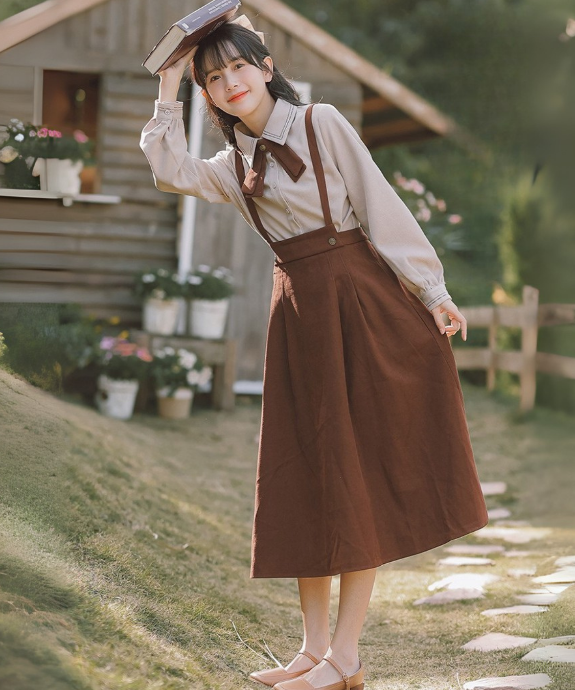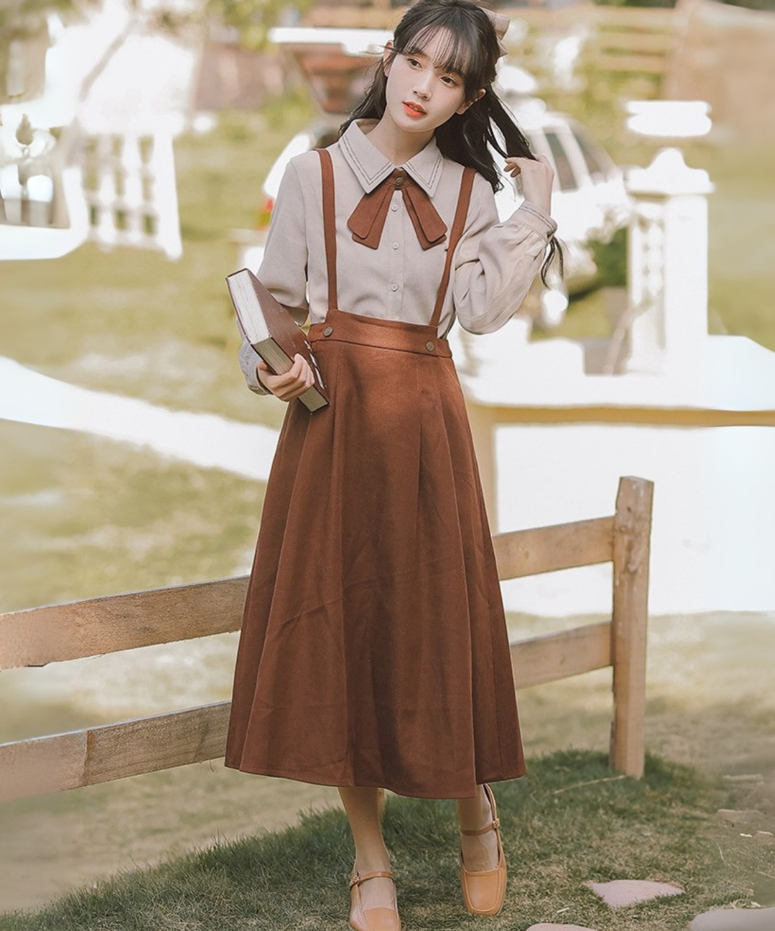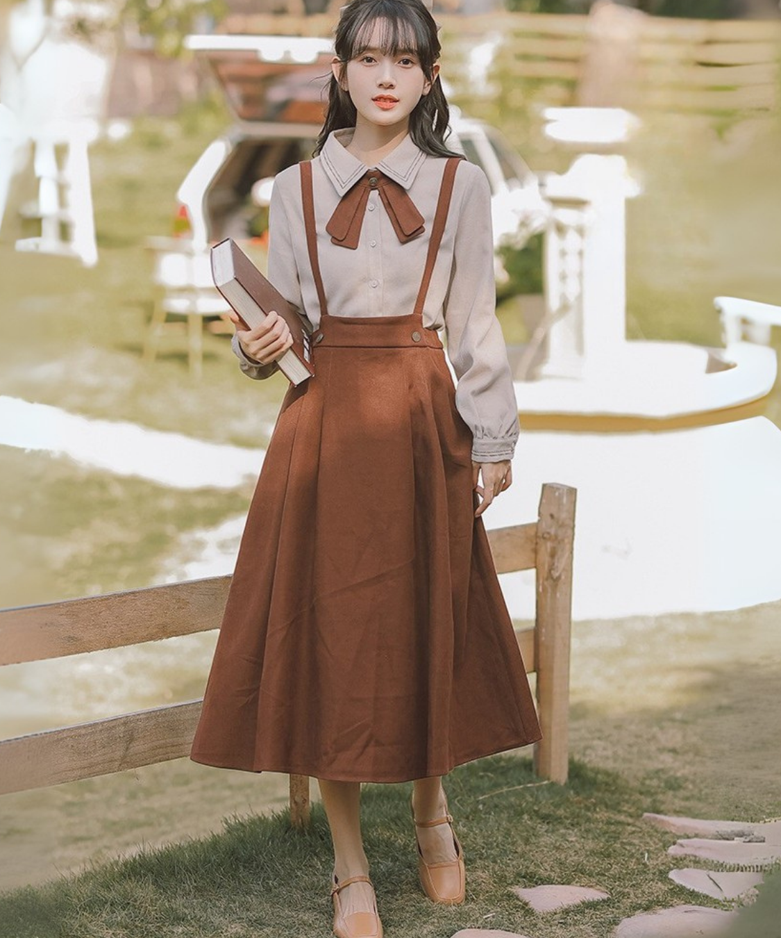 配色リボンが目を惹くクラシカルなブラウスと、上品なサスペンダースカートのセットです。