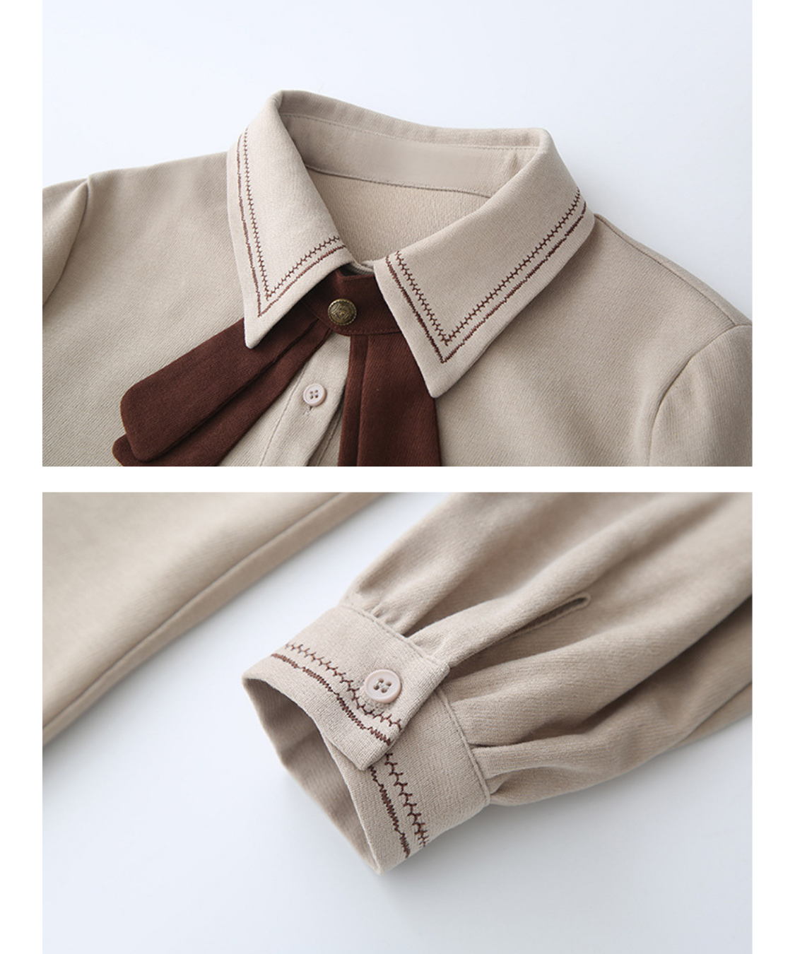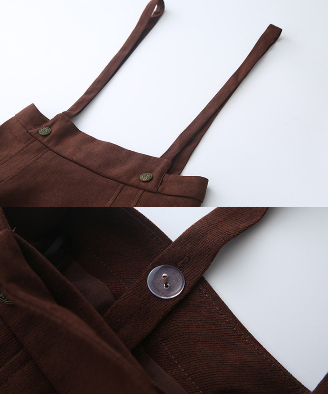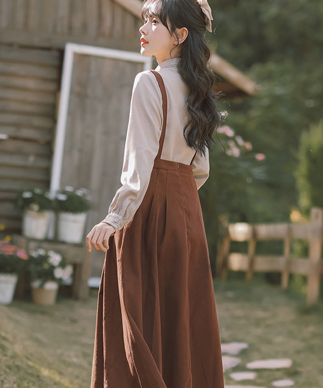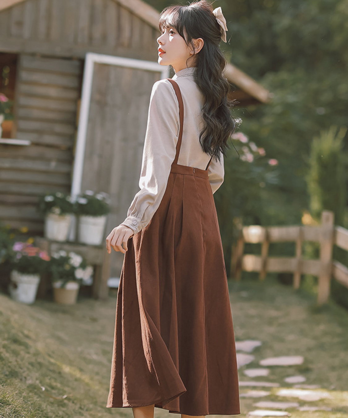配色リボンが目を惹くクラシカルなブラウスと、上品なサスペンダースカートのセットです。