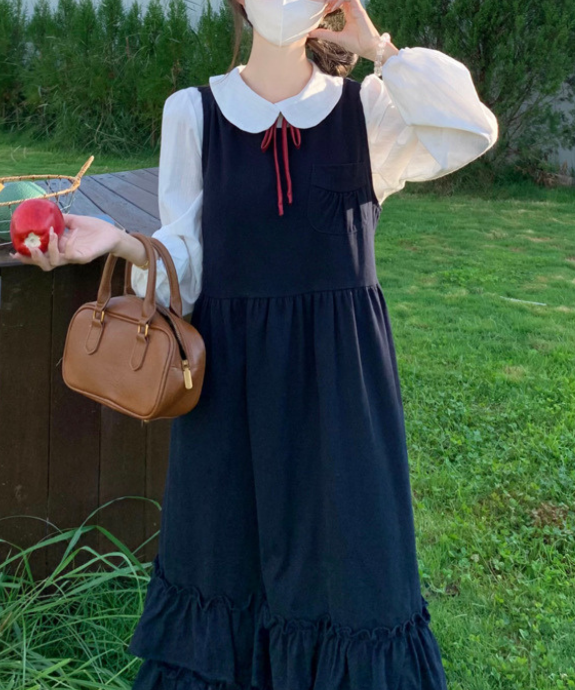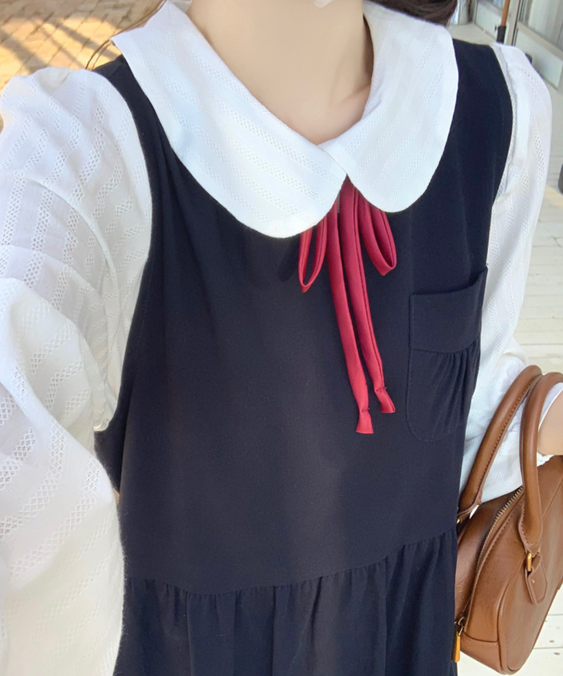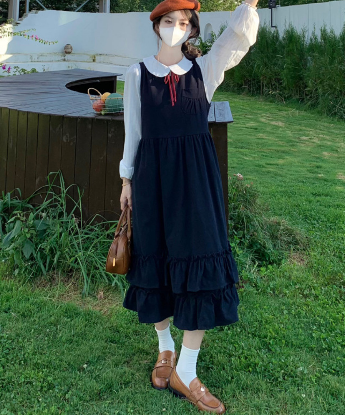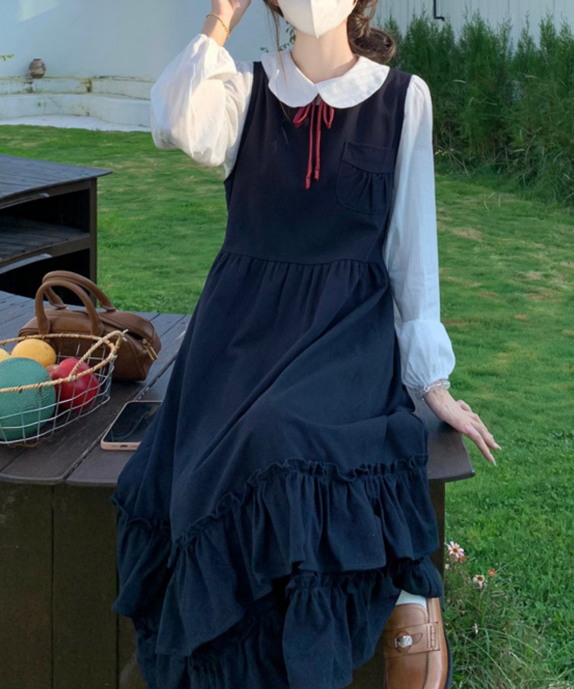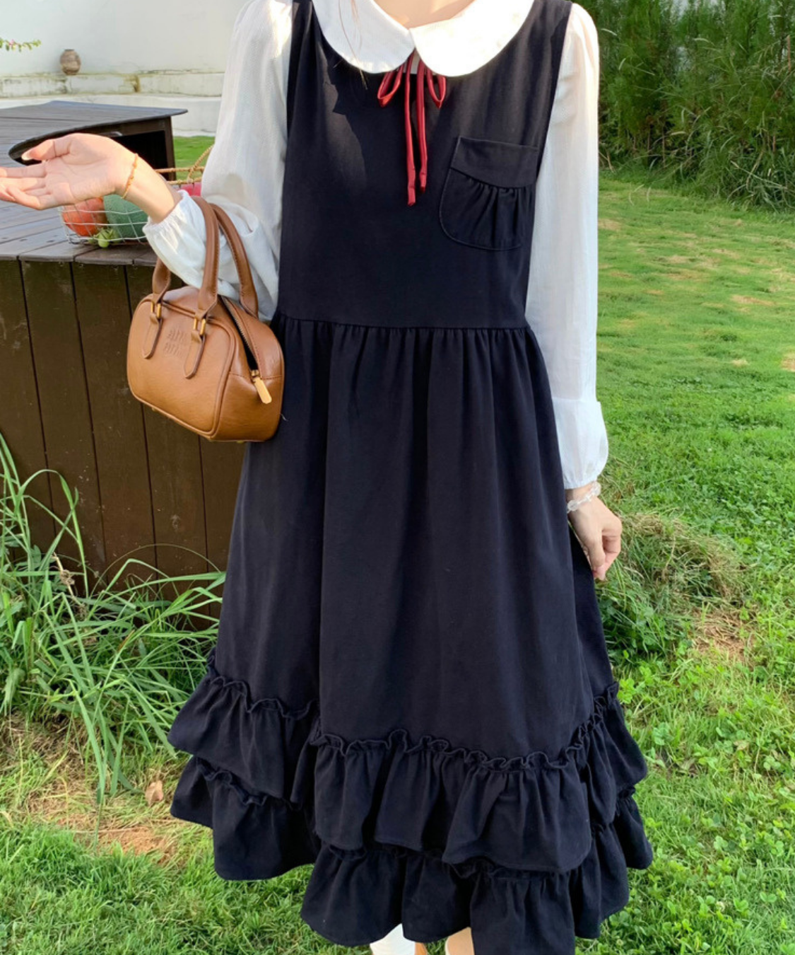 細リボンタイ付きブラウス+ティアードフリルジャンパースカート 2点セット