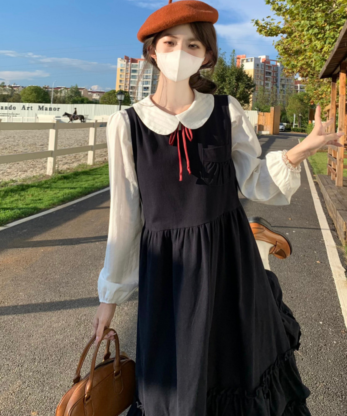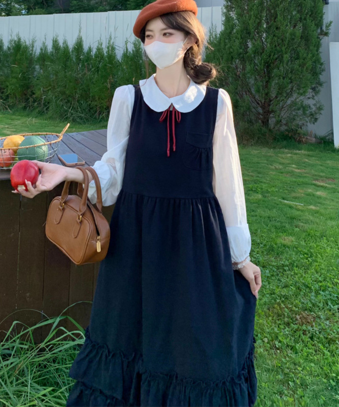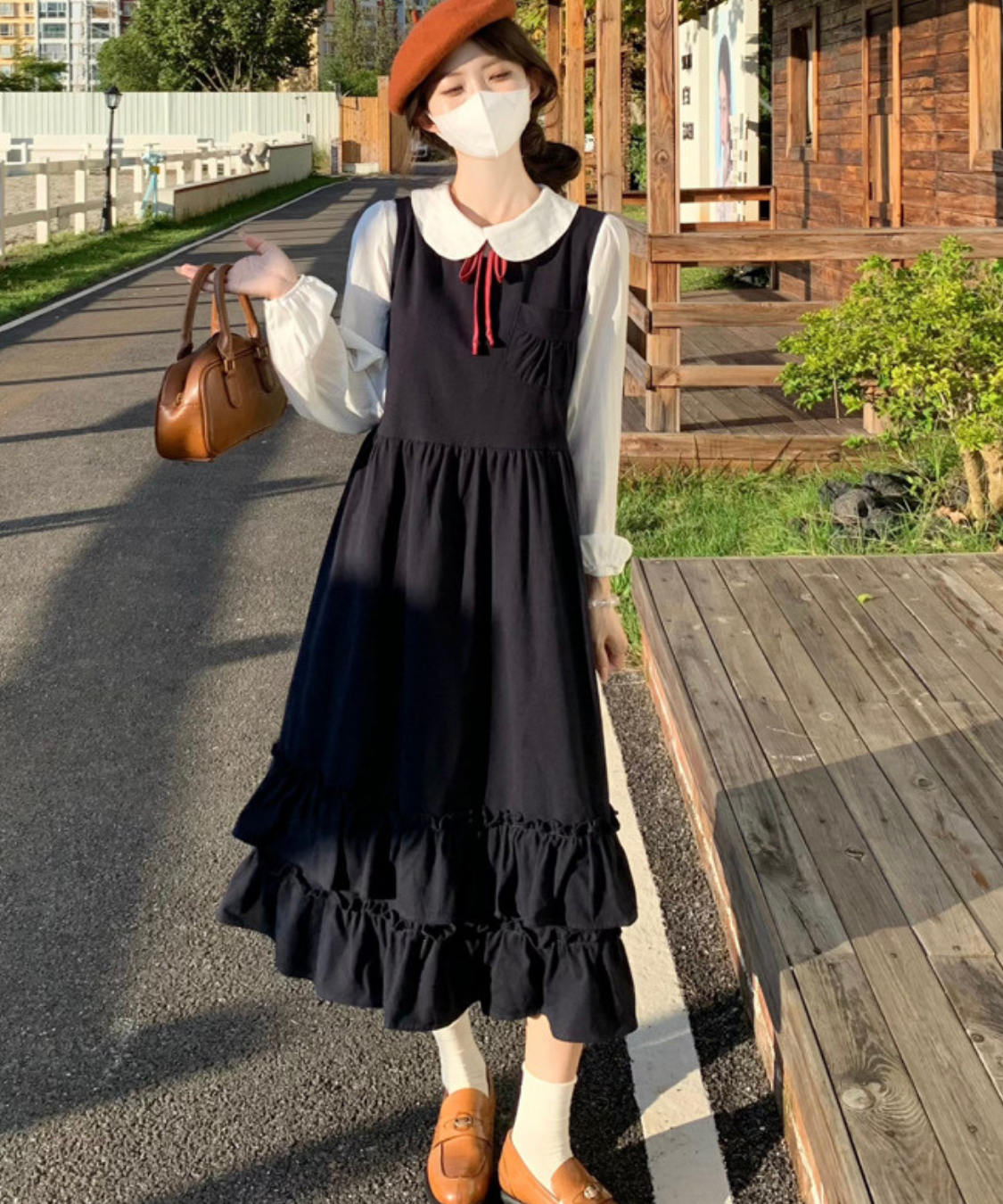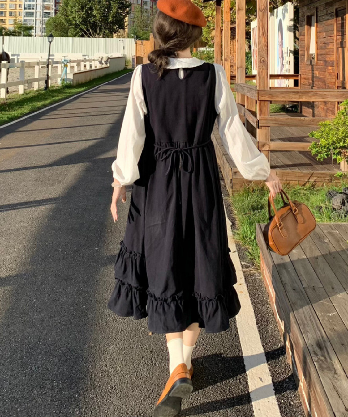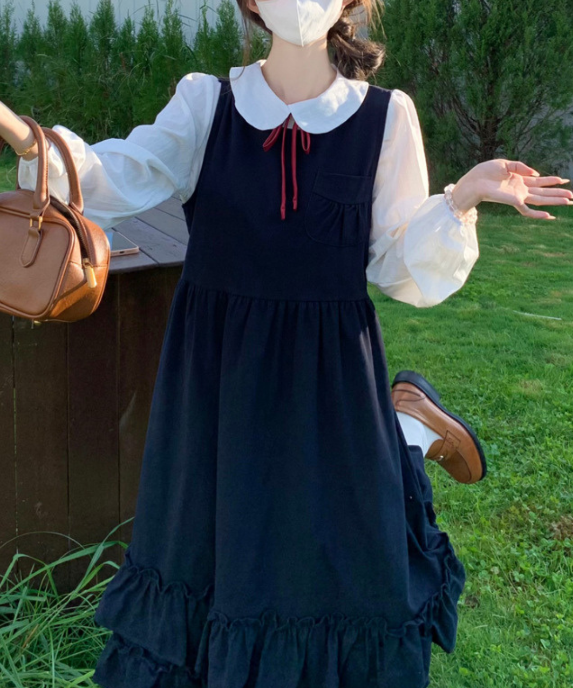 細リボンタイ付きブラウス+ティアードフリルジャンパースカート 2点セット