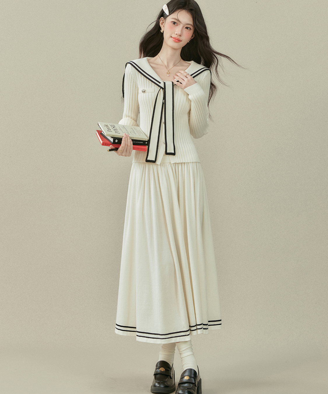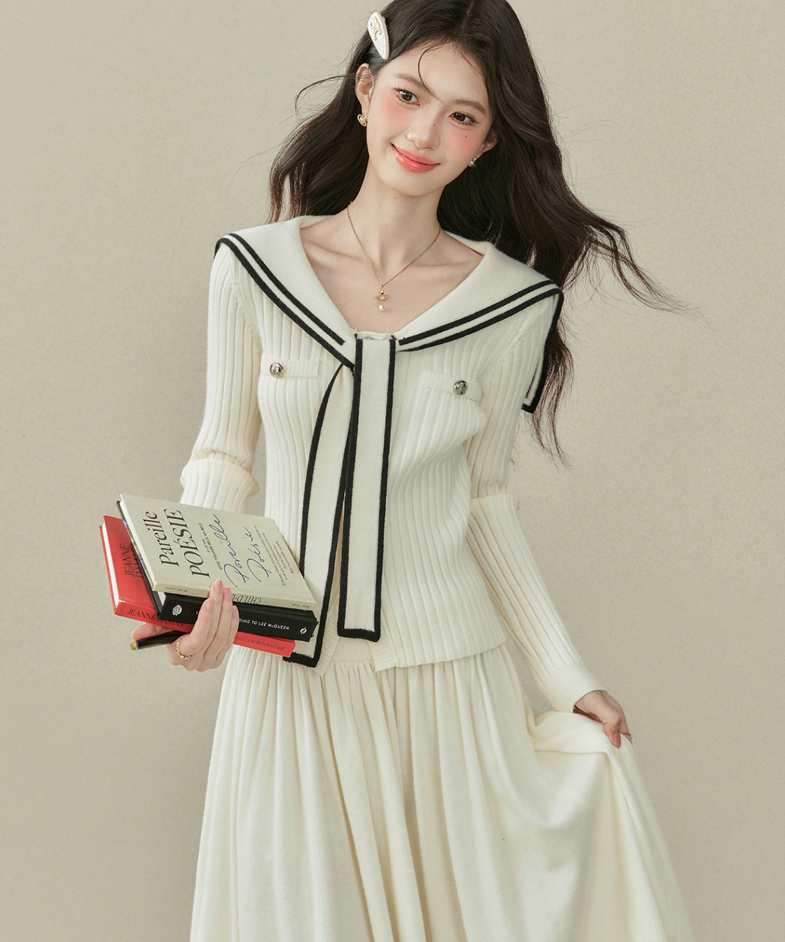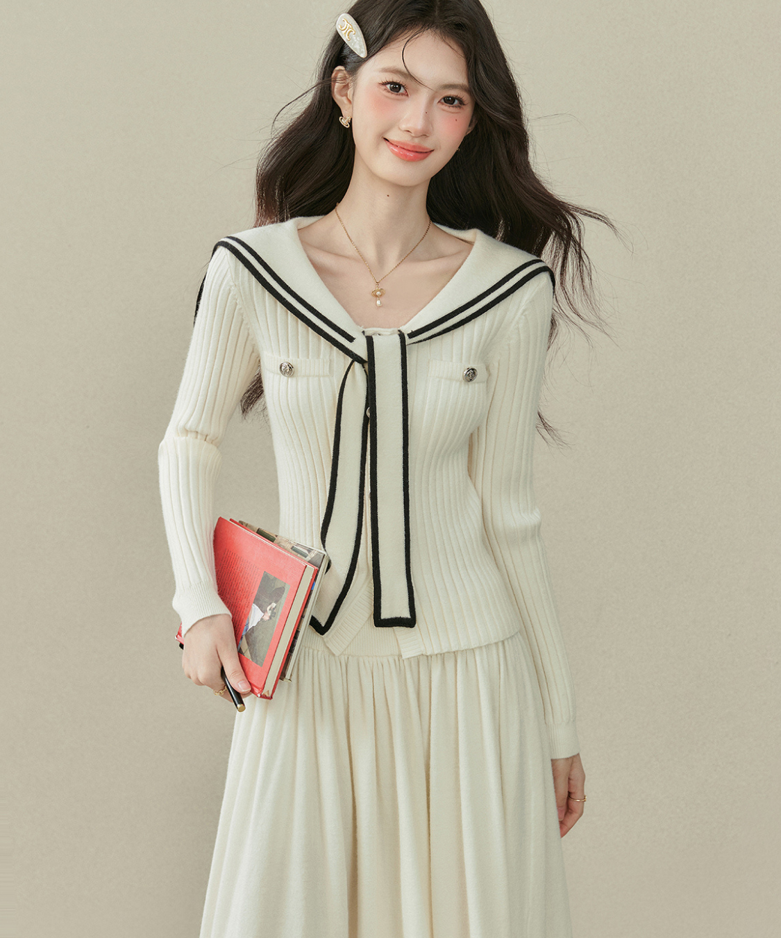 セーラーカラーが上品で、甘すぎない絶妙なバランス◎スカートのWラインもアクセントになっていて、セットで着ると完成度高め♡