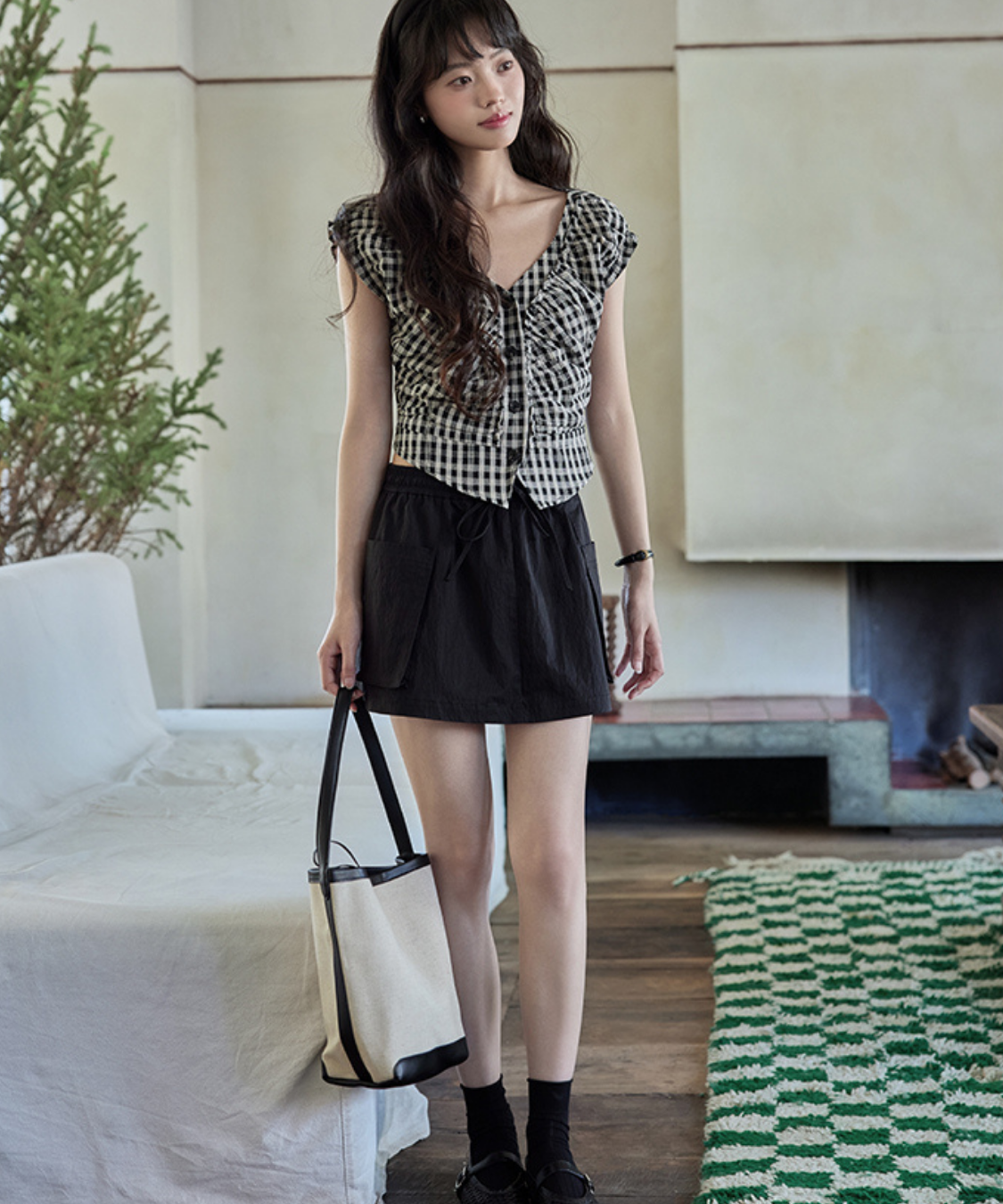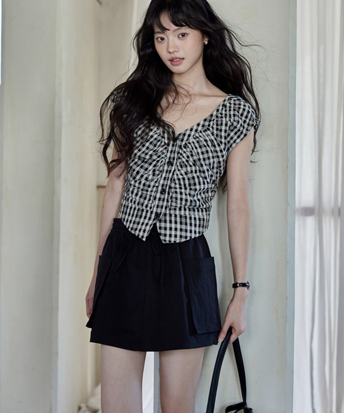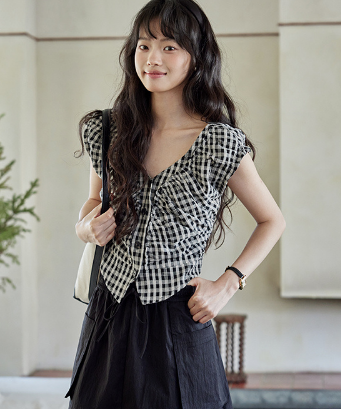 ギンガムチェックにシャーリングを効かせた女性らしいディテールが魅力のブラウスです。