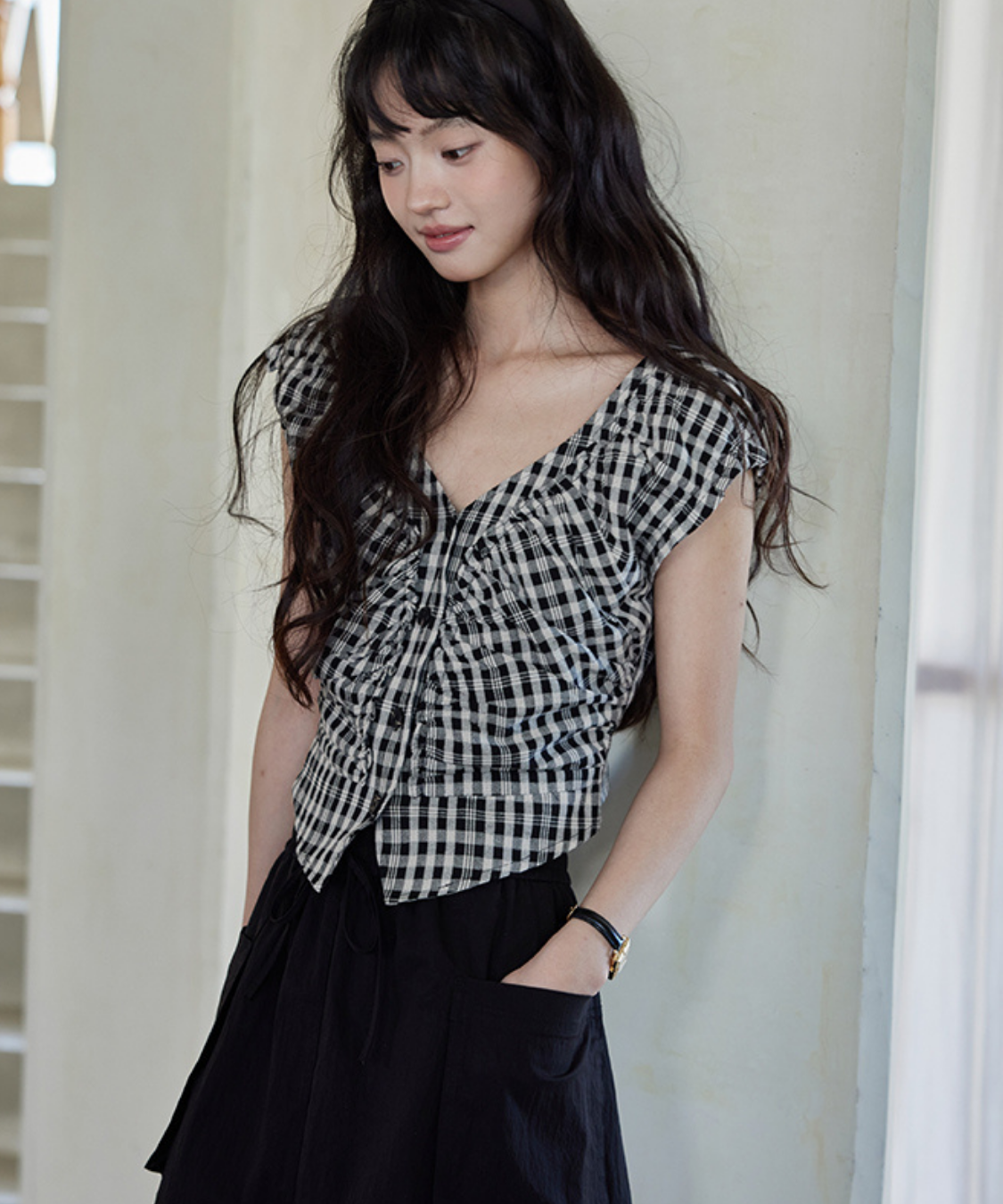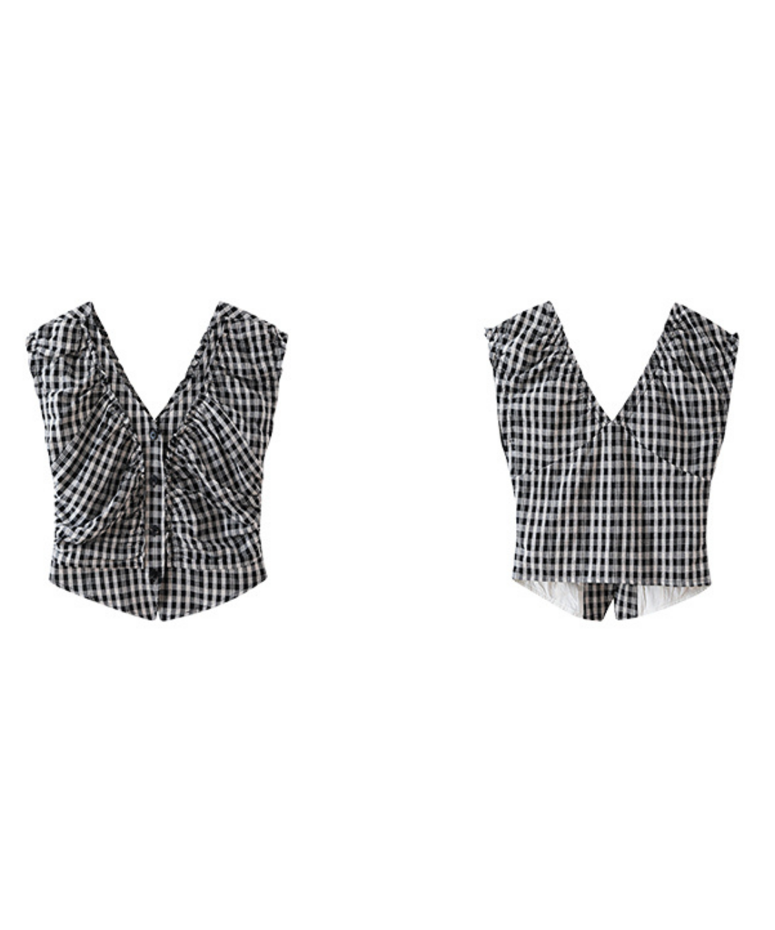 Vネックシャーリングギンガムチェックブラウス