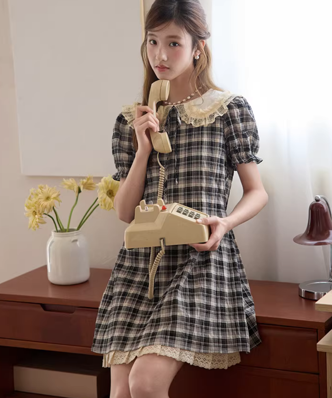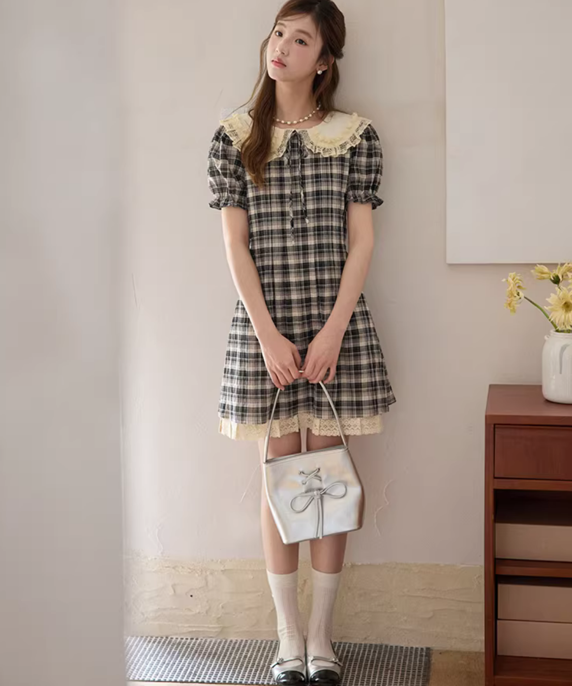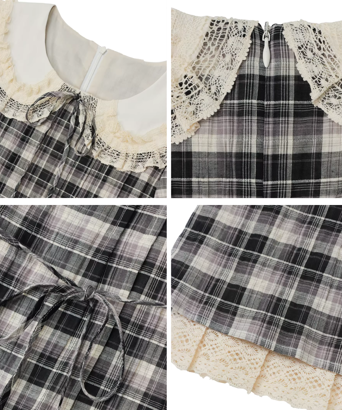 レースカラーが顔まわりを華やかに見せてくれる、ガーリーなチェック柄ワンピースです。