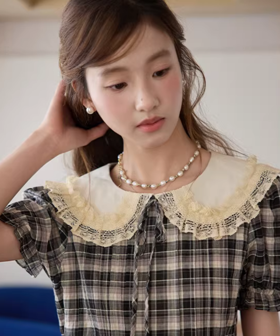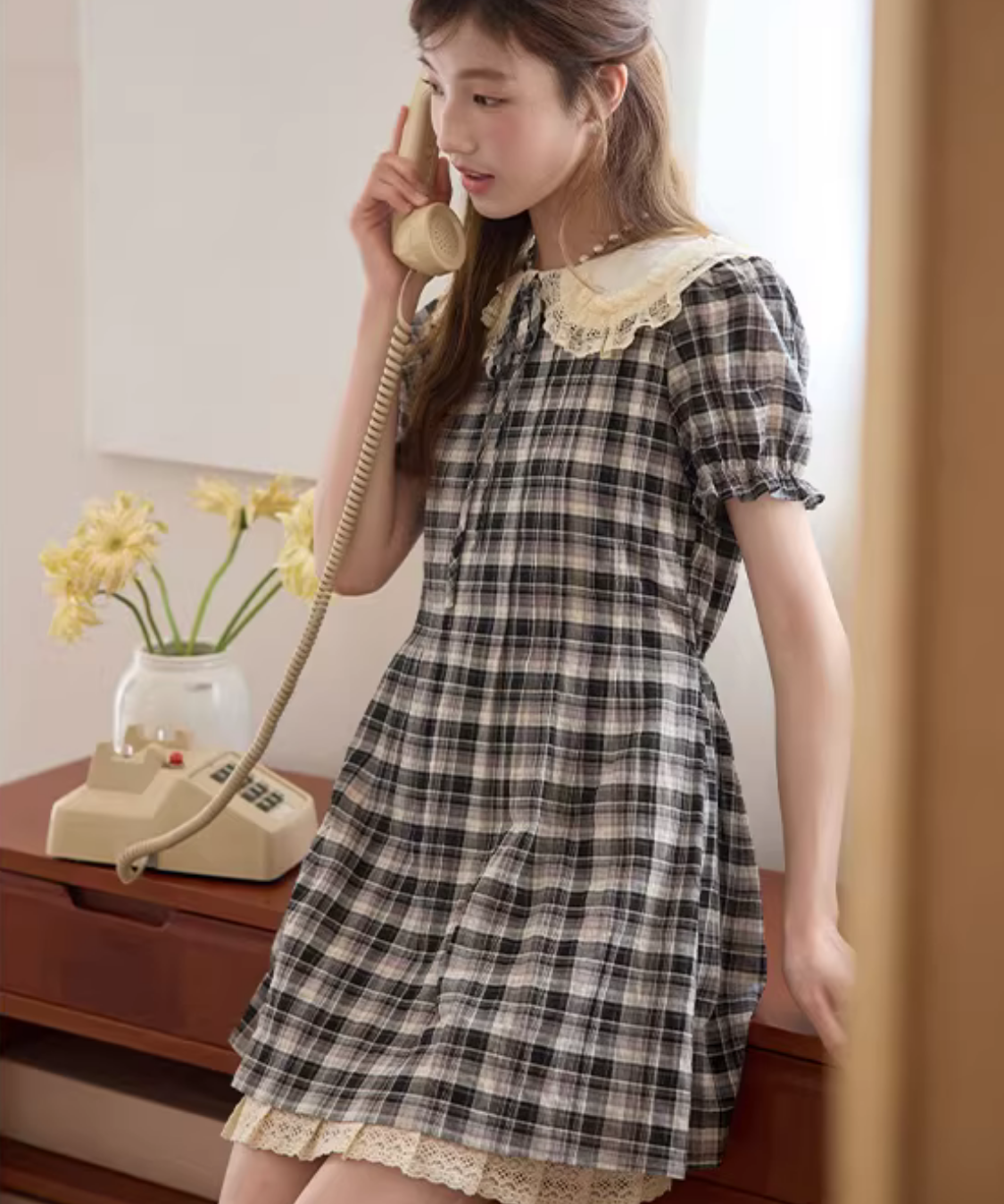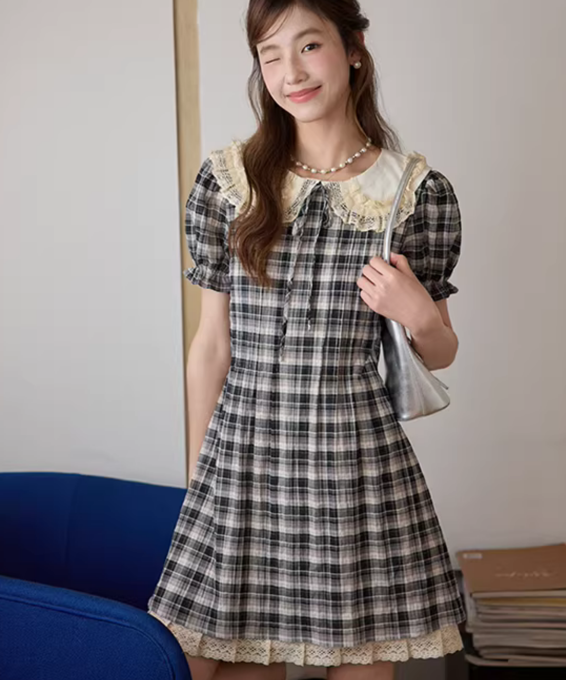 レースカラーが顔まわりを華やかに見せてくれる、ガーリーなチェック柄ワンピースです。