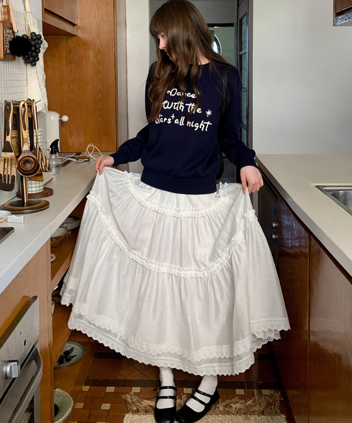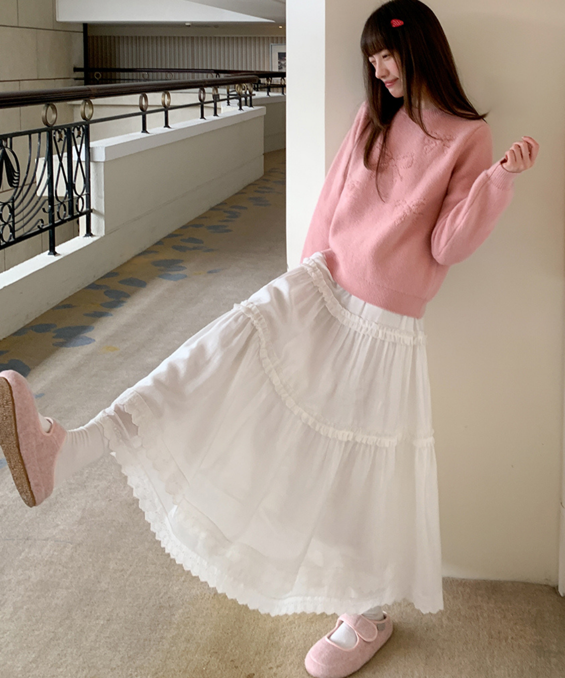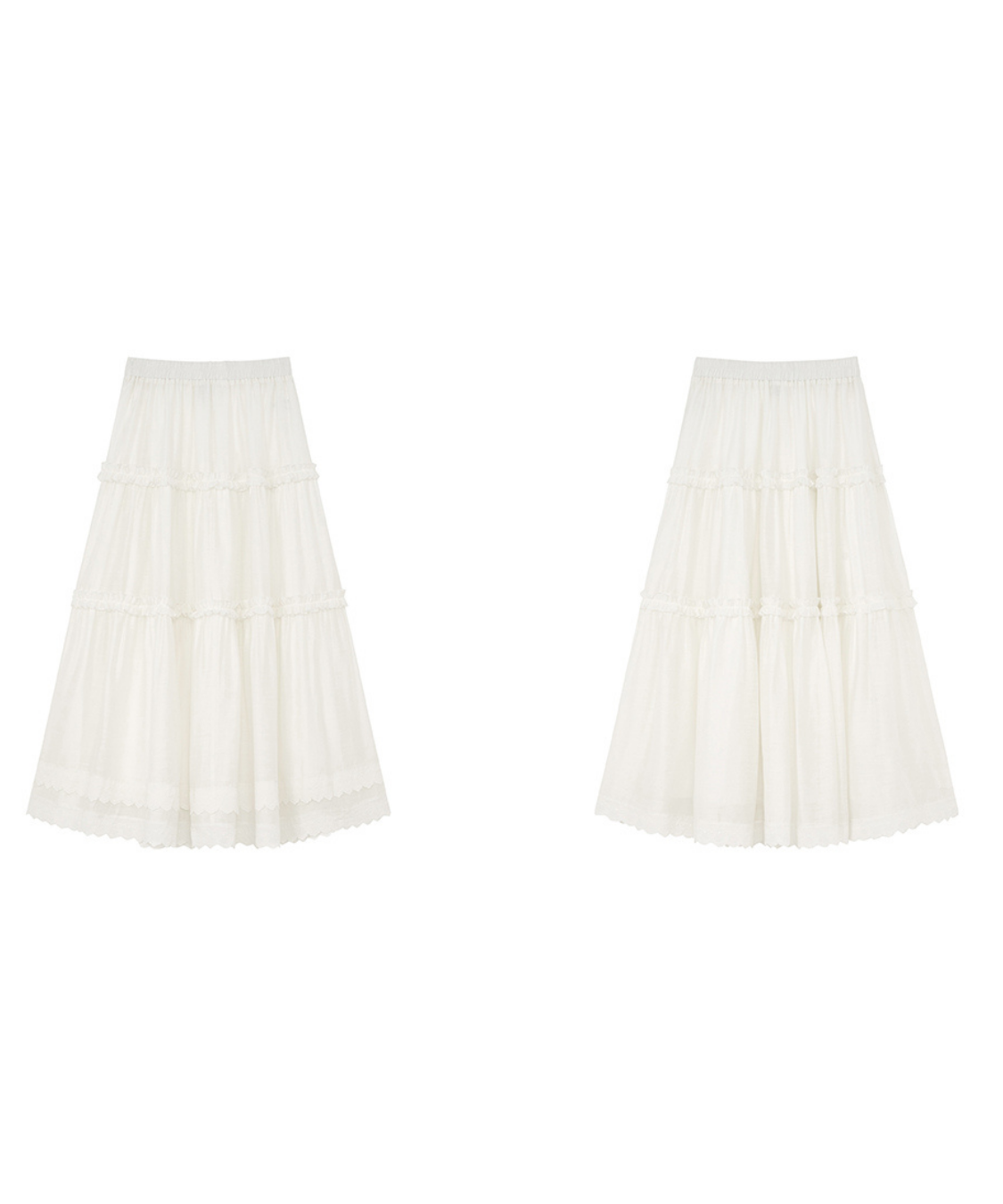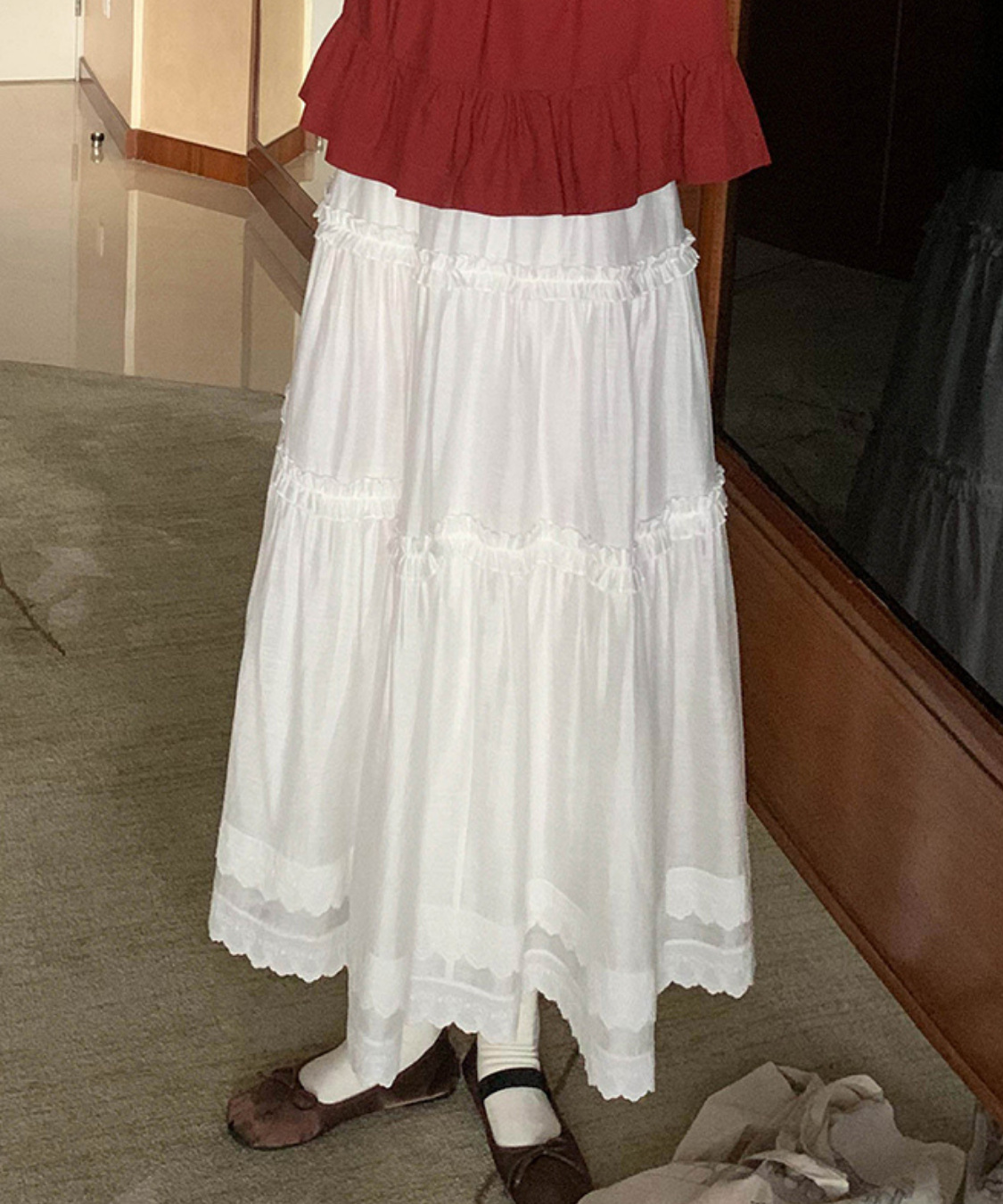 スカラップレースを贅沢にあしらったティアードデザインが、甘さたっぷりのロングスカートです。