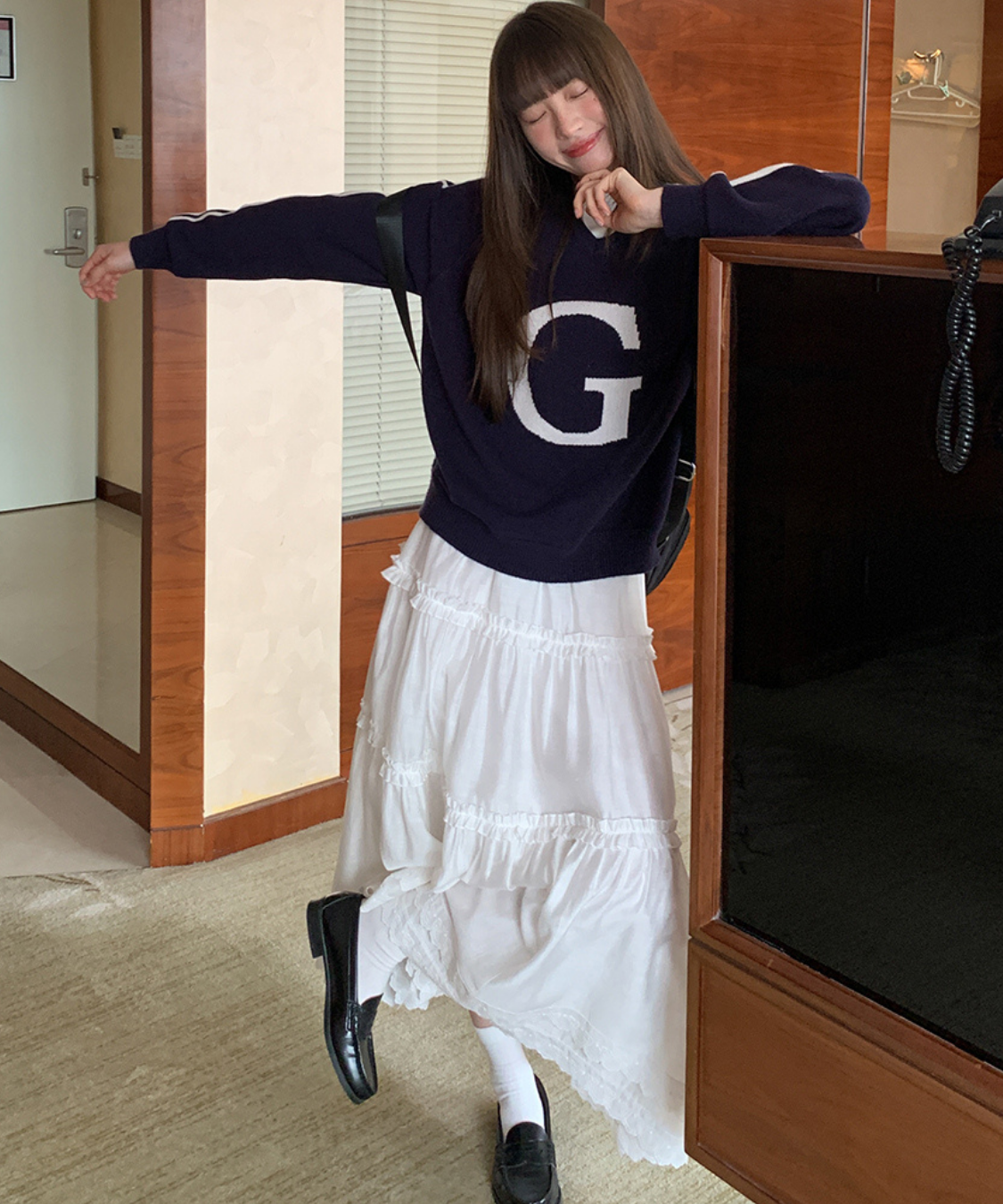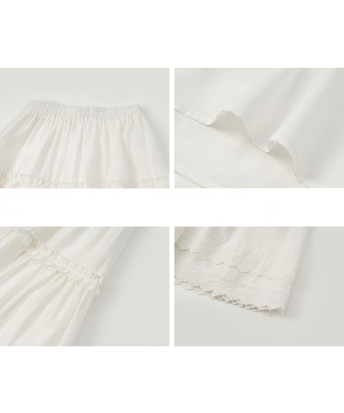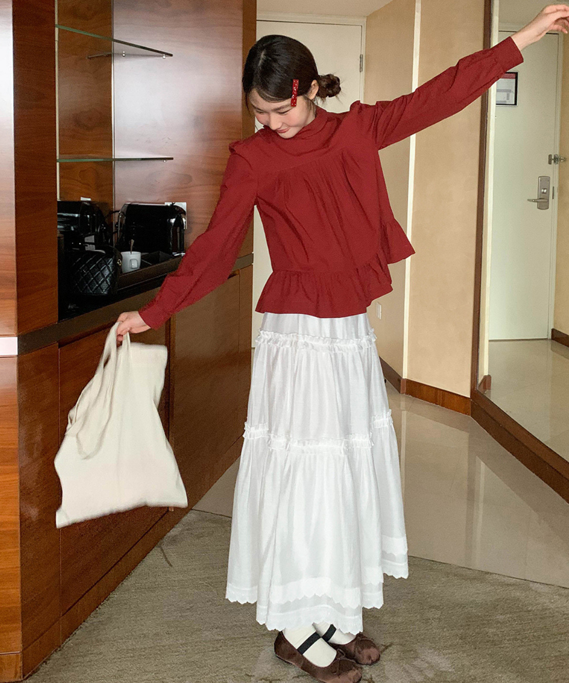 スカラップレースを贅沢にあしらったティアードデザインが、甘さたっぷりのロングスカートです。
