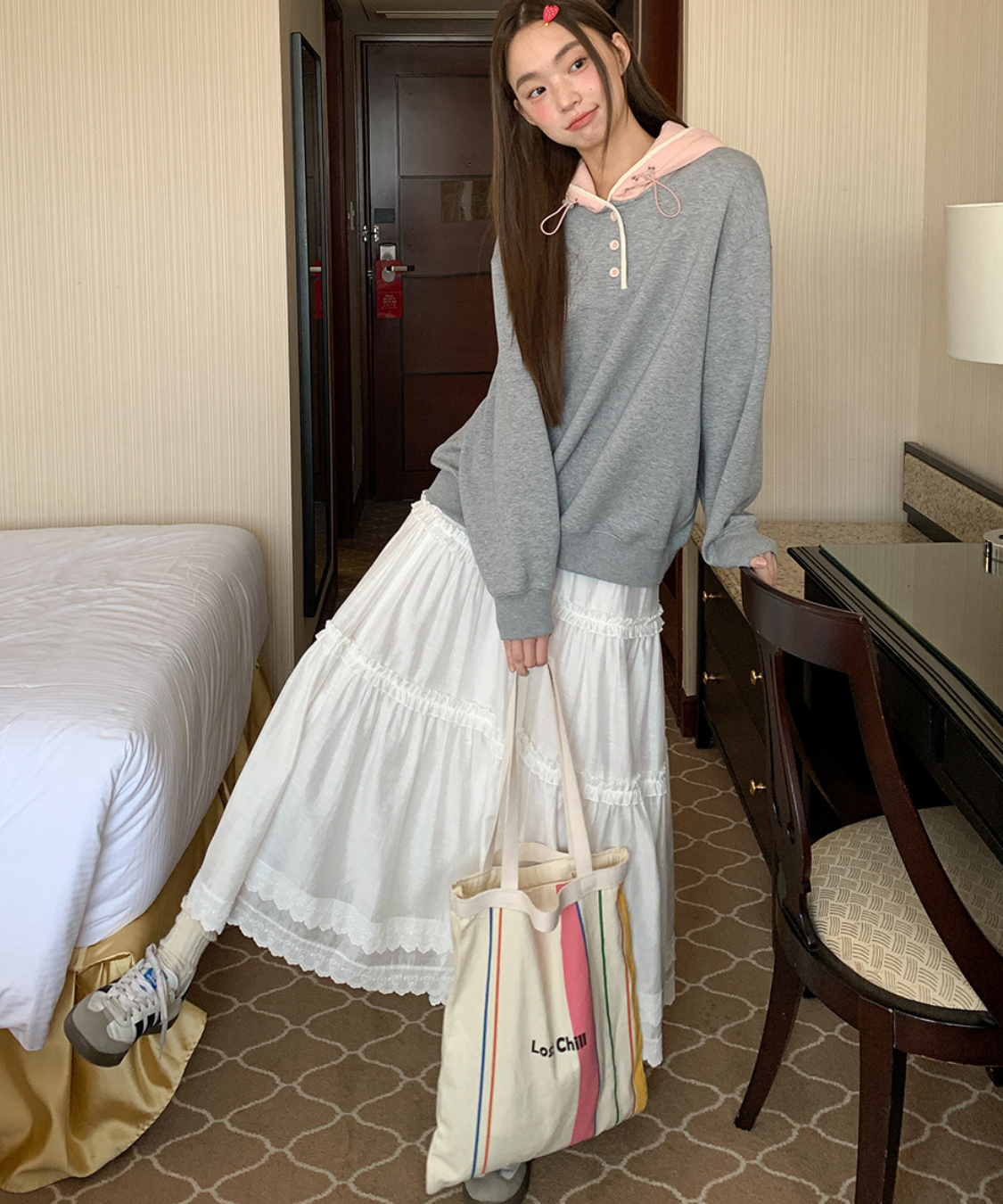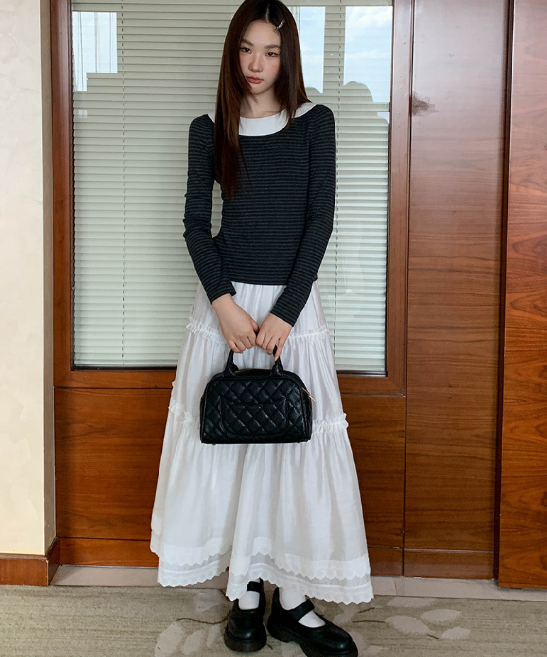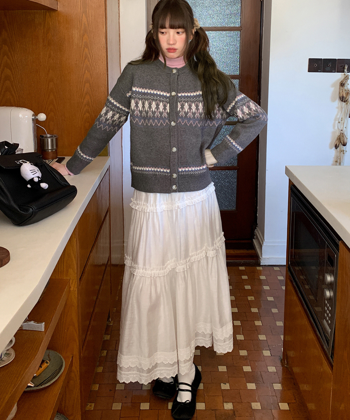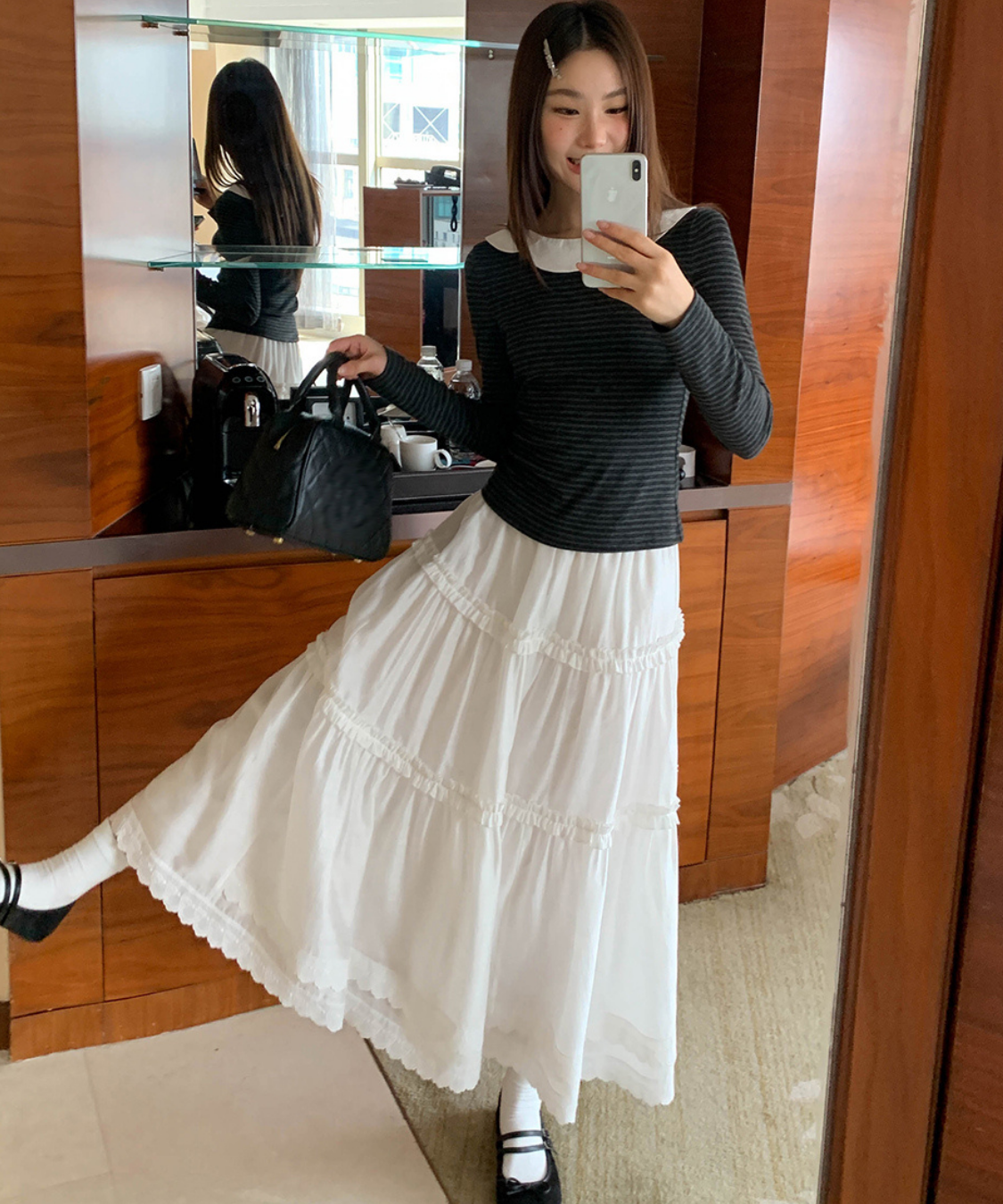 スカラップレースを贅沢にあしらったティアードデザインが、甘さたっぷりのロングスカートです。