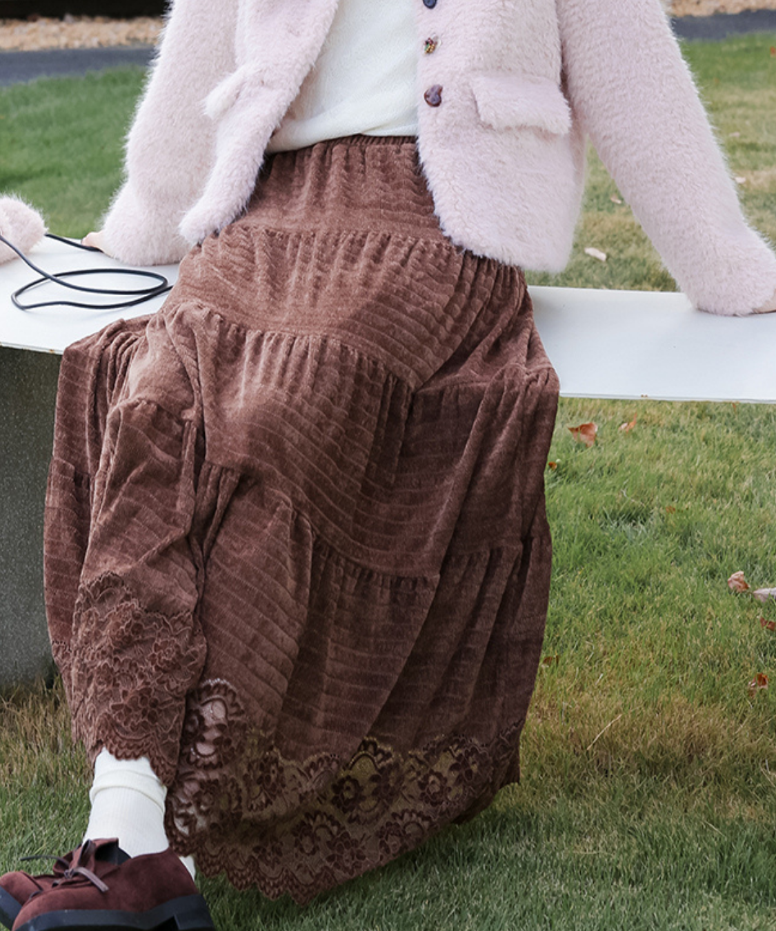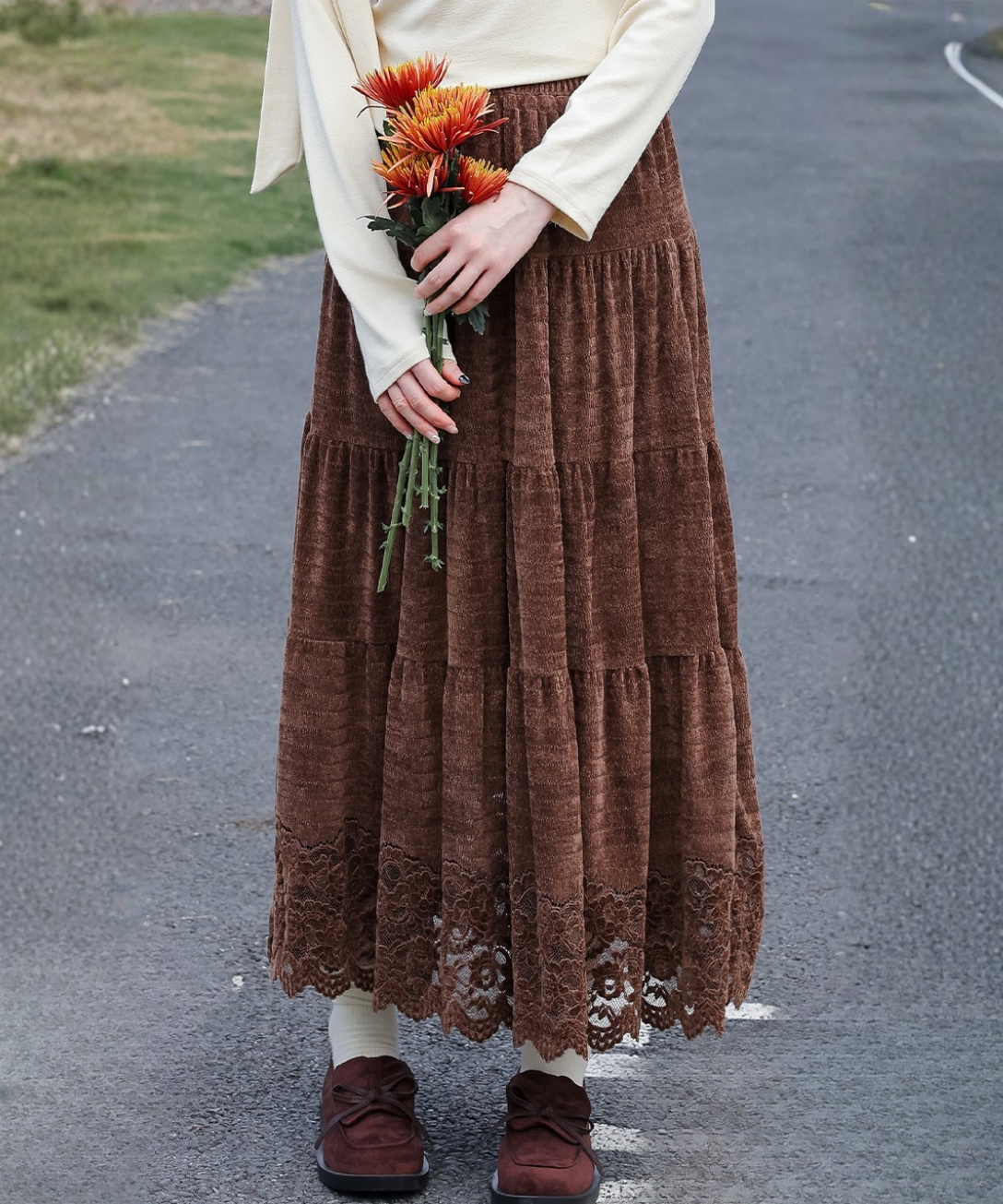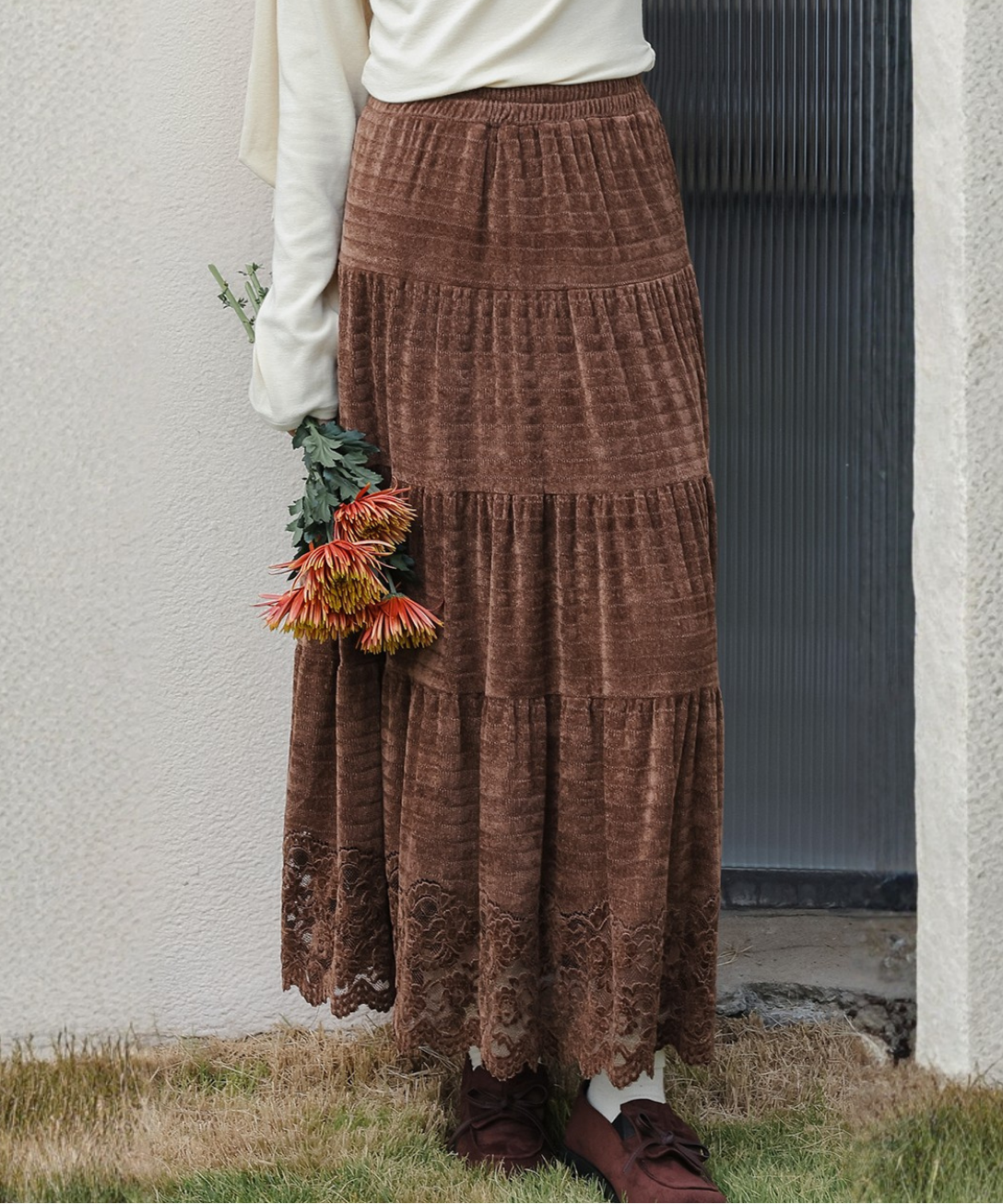 ティアード切り替えデザインが軽やかで女性らしいロングスカート。