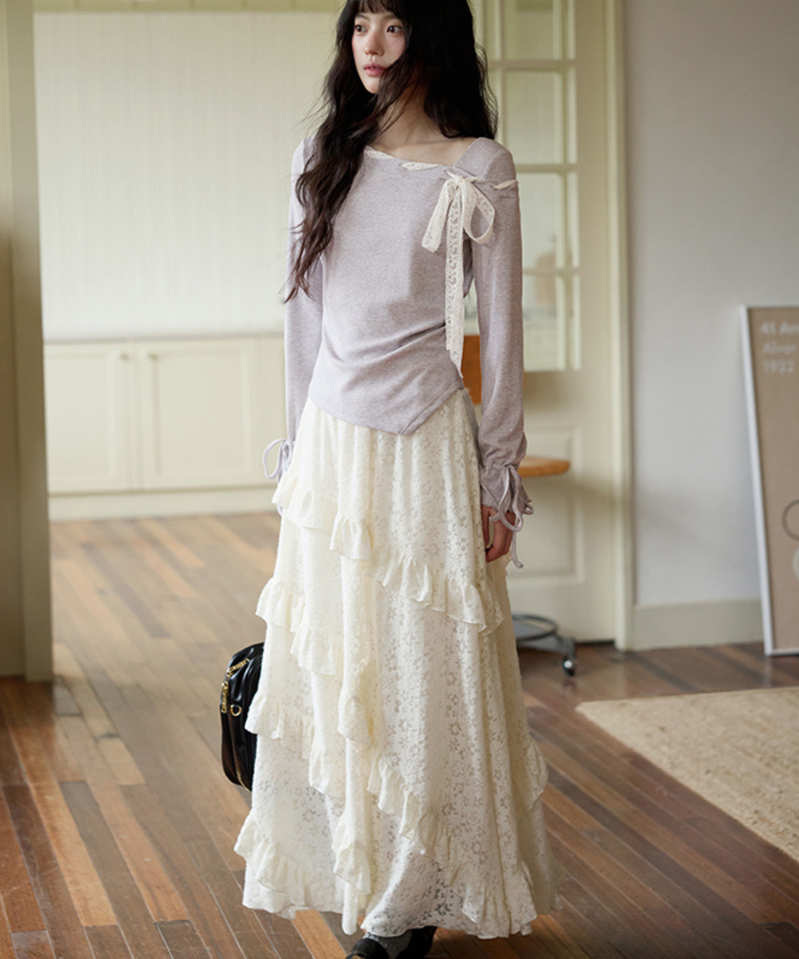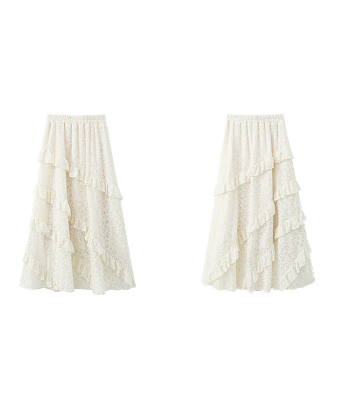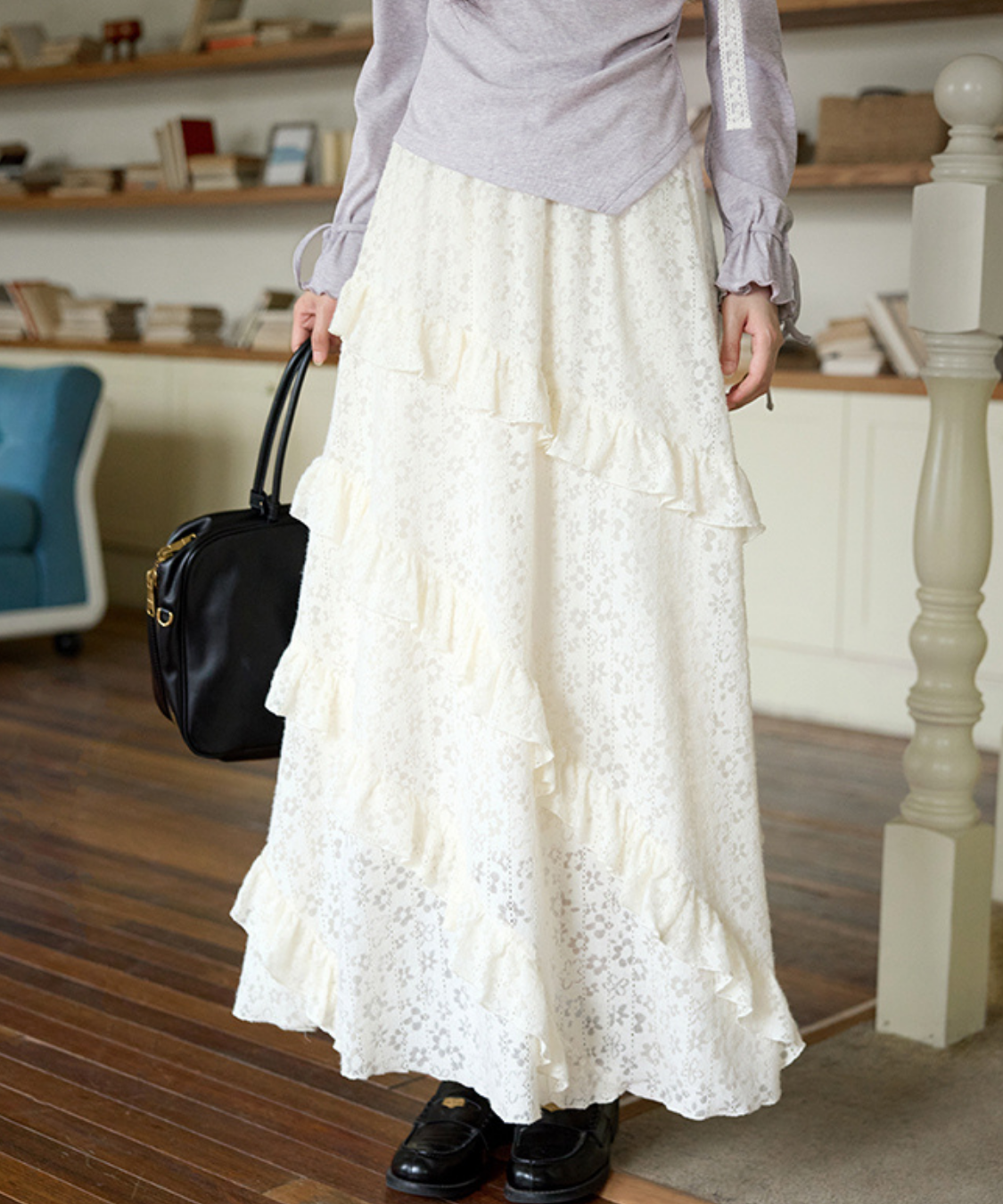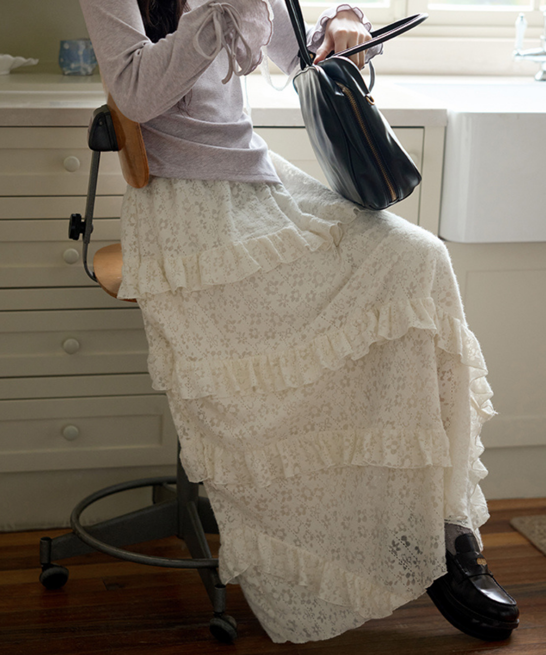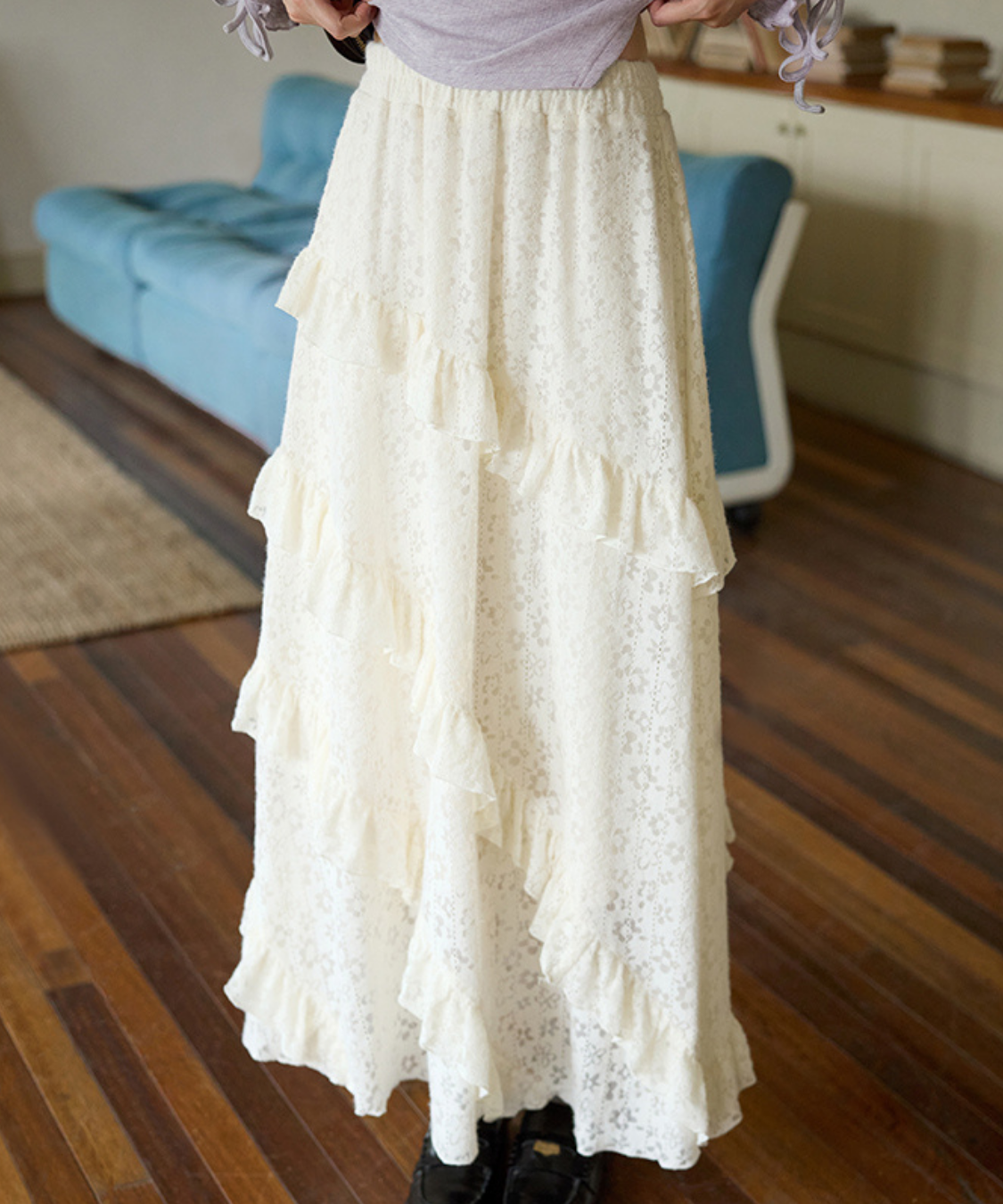 繊細なレース素材に斜めに重なるティアードフリルを施したロングスカートです。