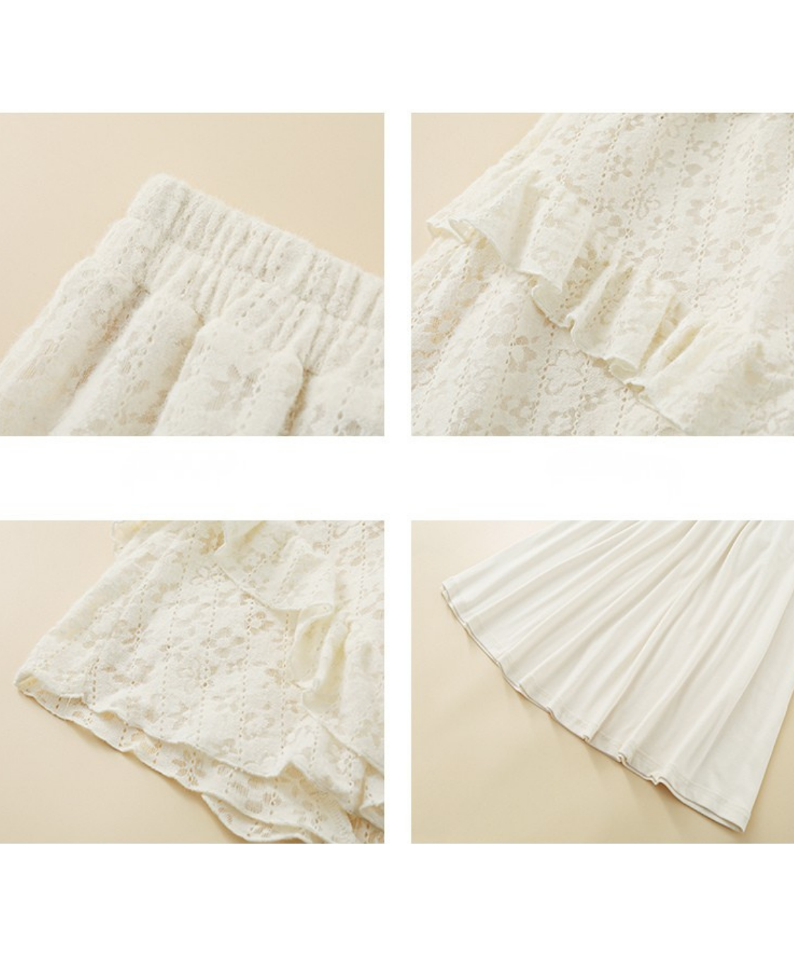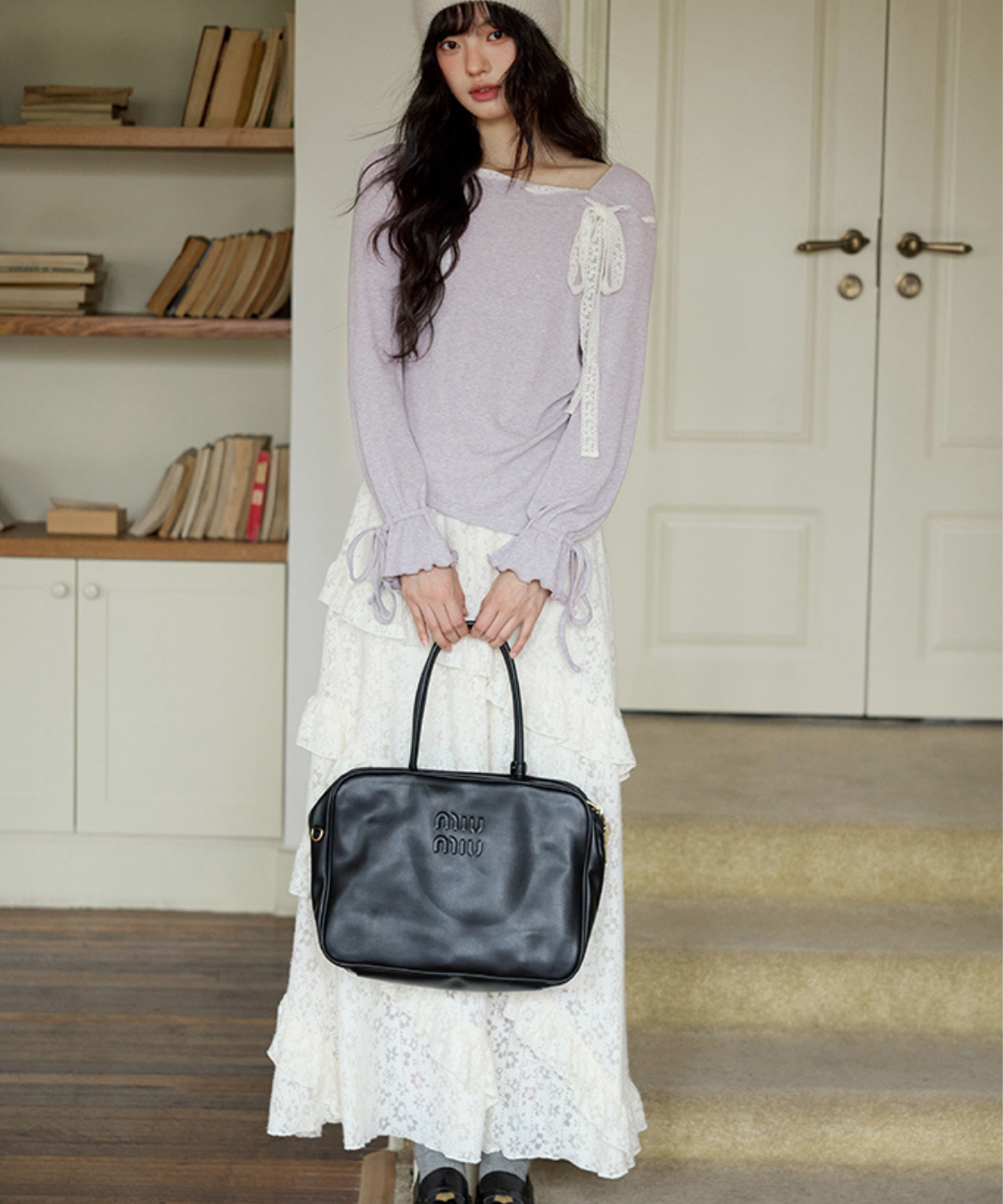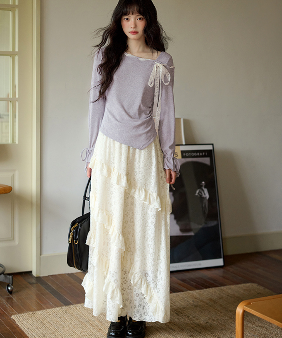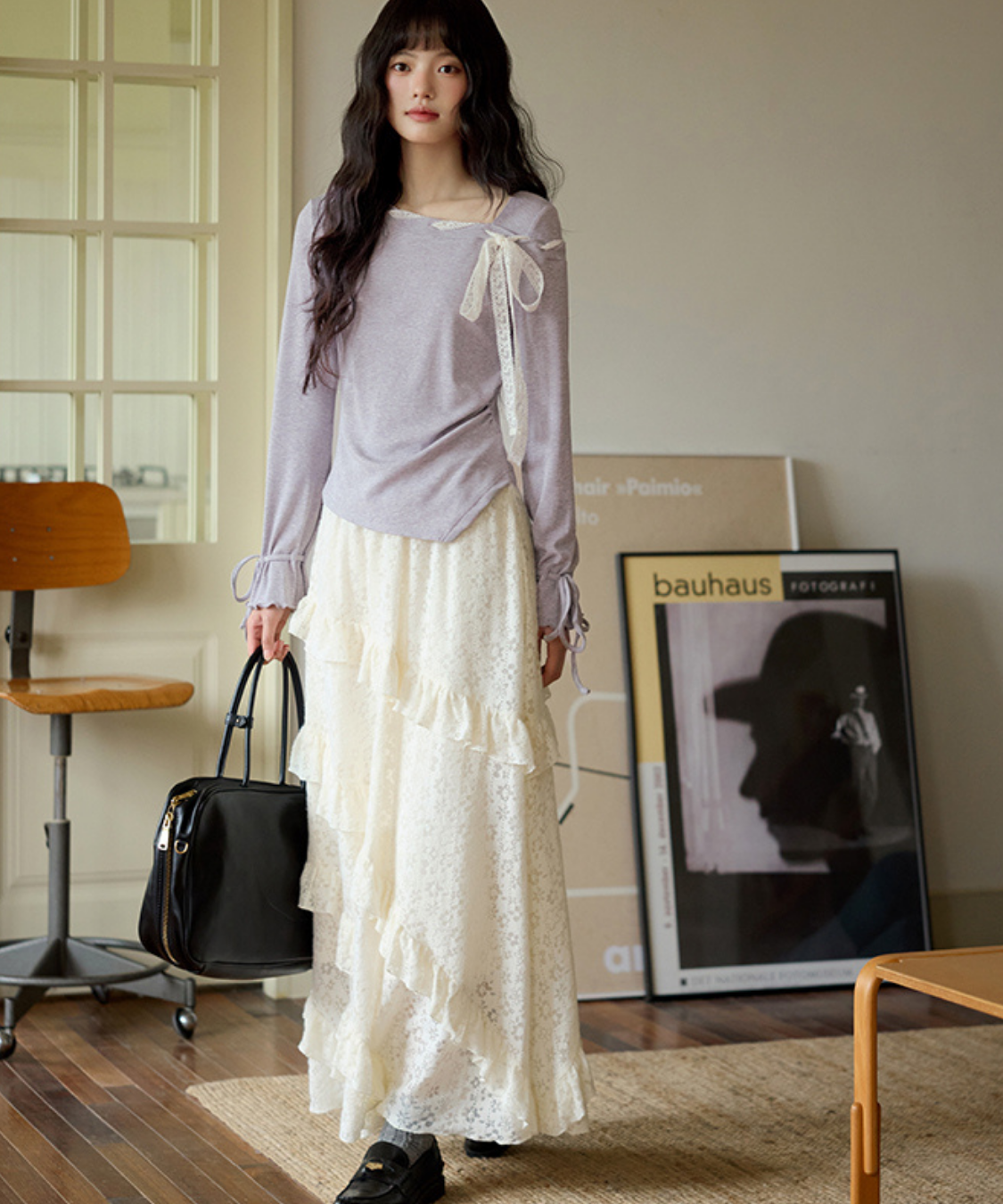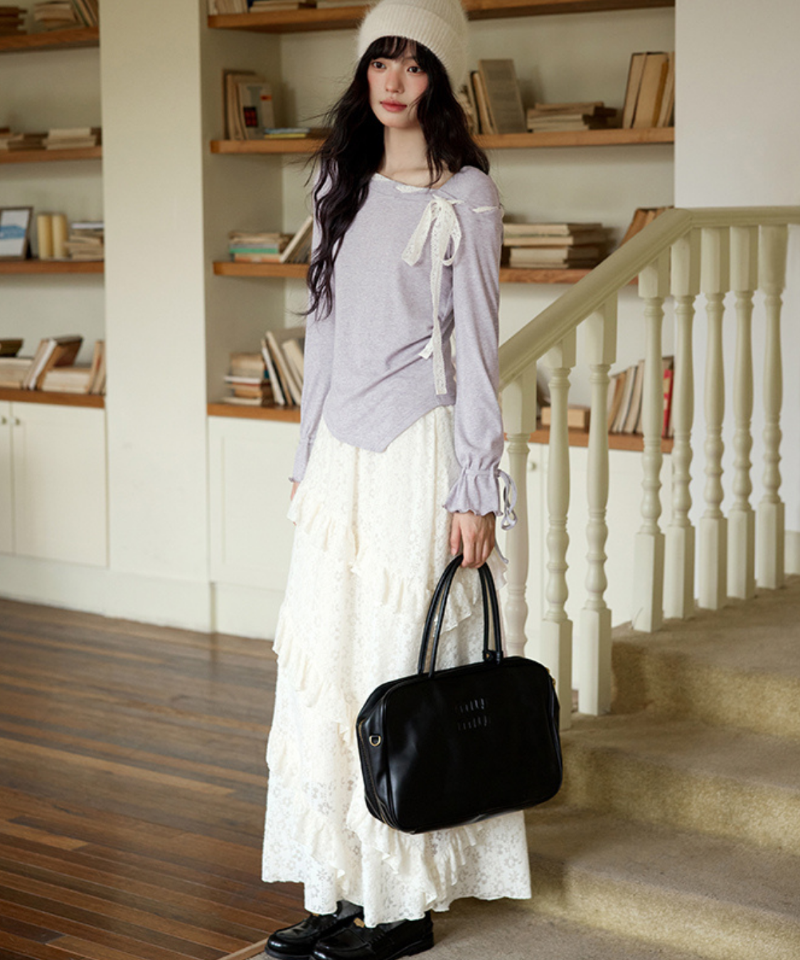 繊細なレース素材に斜めに重なるティアードフリルを施したロングスカートです。