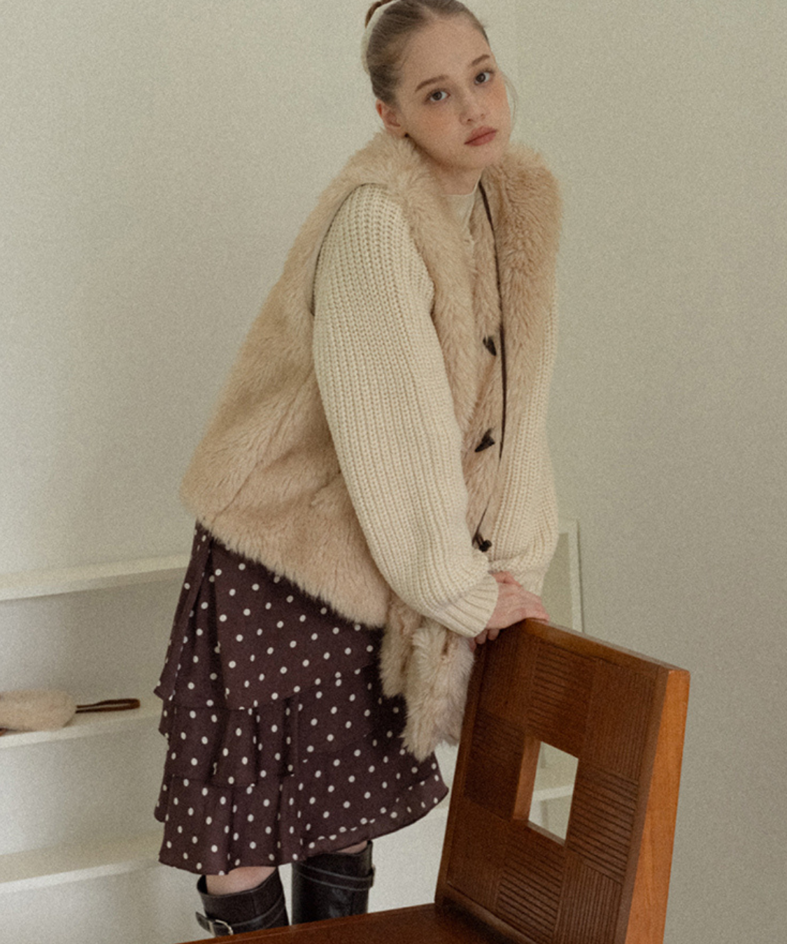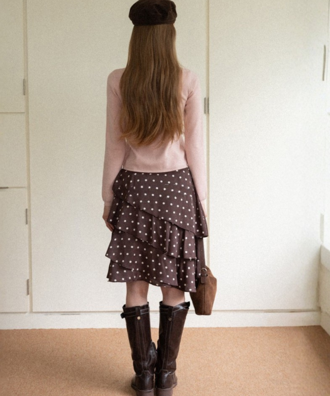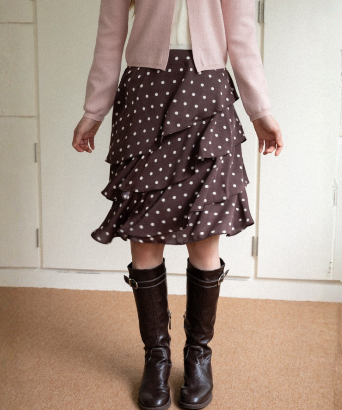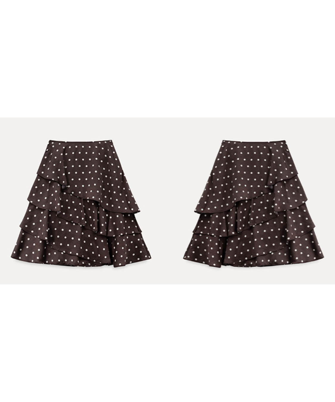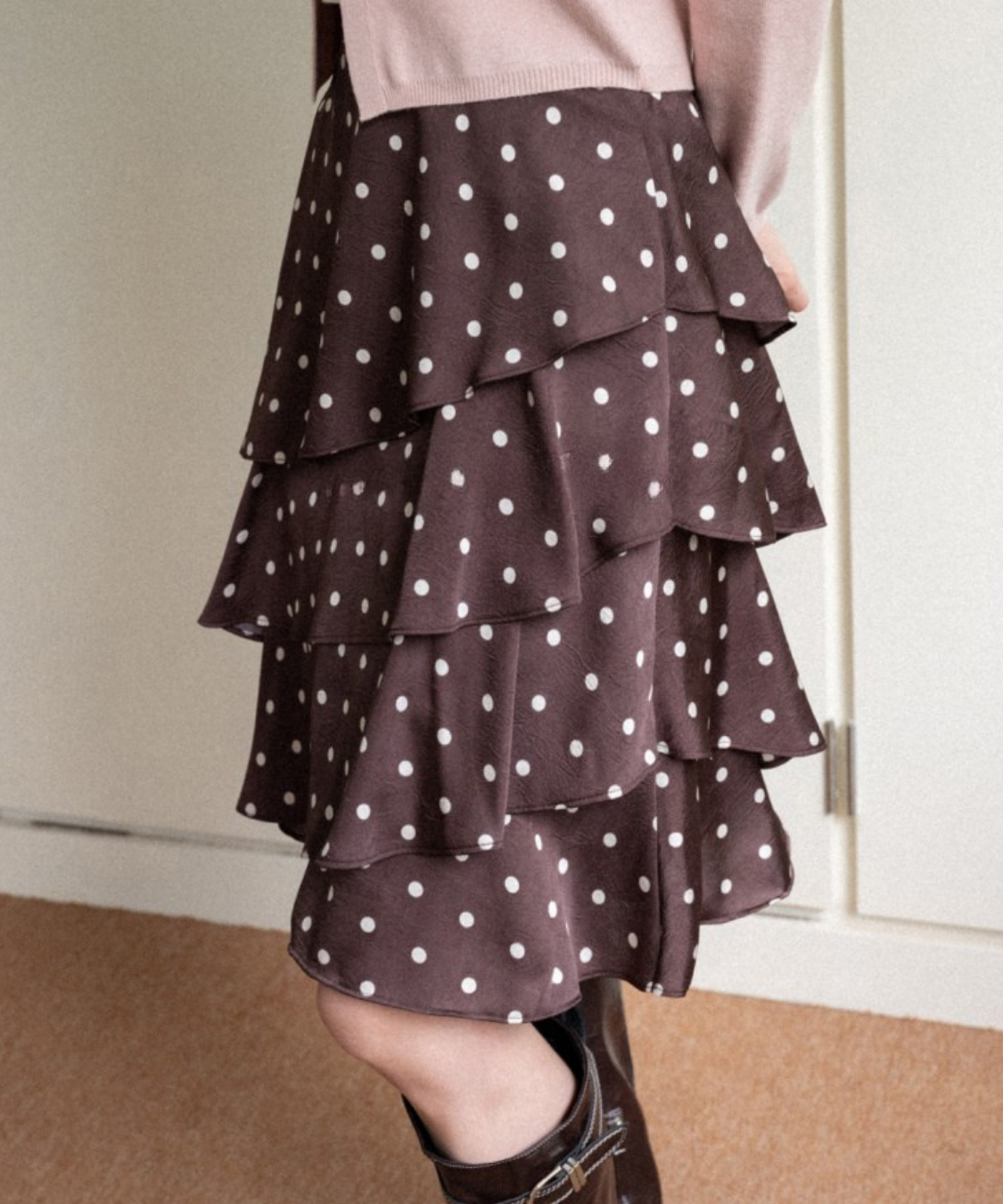 アシンメトリーに重なったティアードデザインが目を惹くドット柄スカートです。