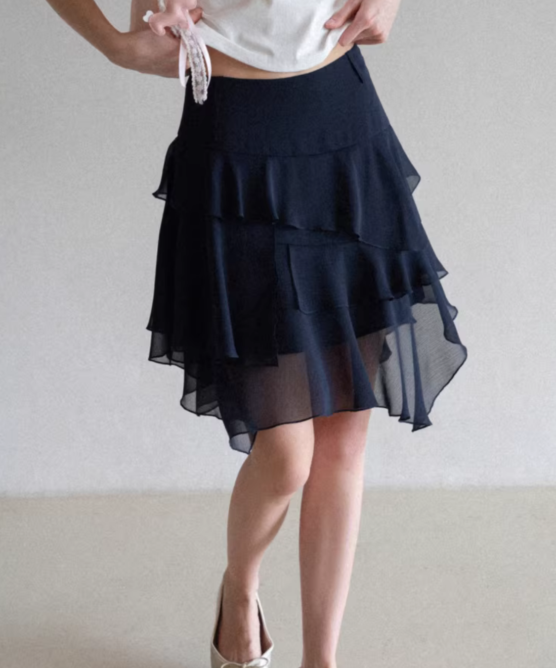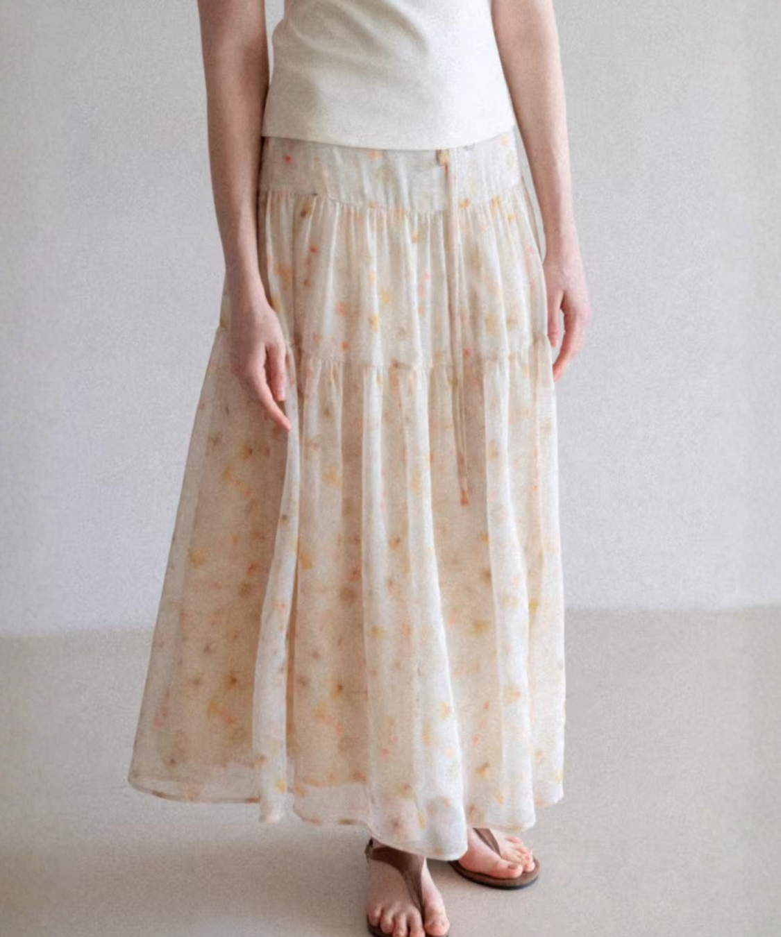 細やかなギンガムチェックが可愛らしさを引き立てる、軽やかなティアードフレアスカートです。